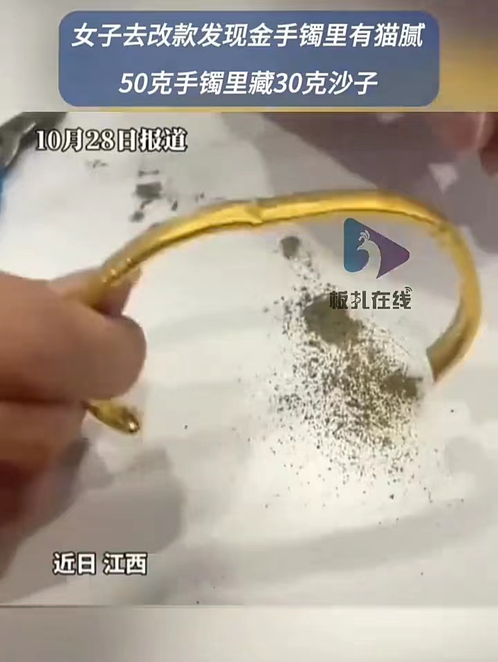 10月28日,江西一名女子发视频称,自己去店里改金手镯的款式,结果发现50克的手镯里藏着30克的沙子,这让自己感到无比震惊。网友:“金价要不是这么贵,我都剪开看看!”