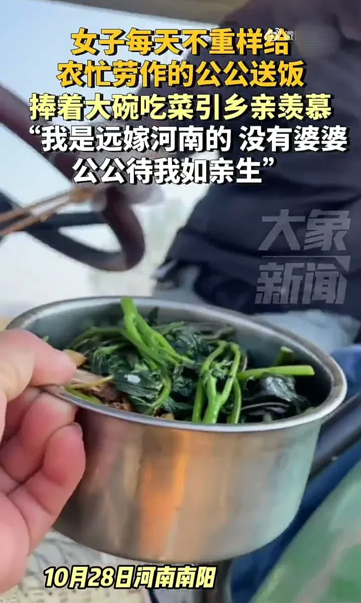 10月28日,河南南阳一名女子发视频称,自己的公公是开拖拉机帮农户耕田的,最近一个月都非常忙碌,于是自己便每天不重样给他送饭,引得乡亲们一阵羡慕。该女子表示,公公待我如亲生,是我享了福。
