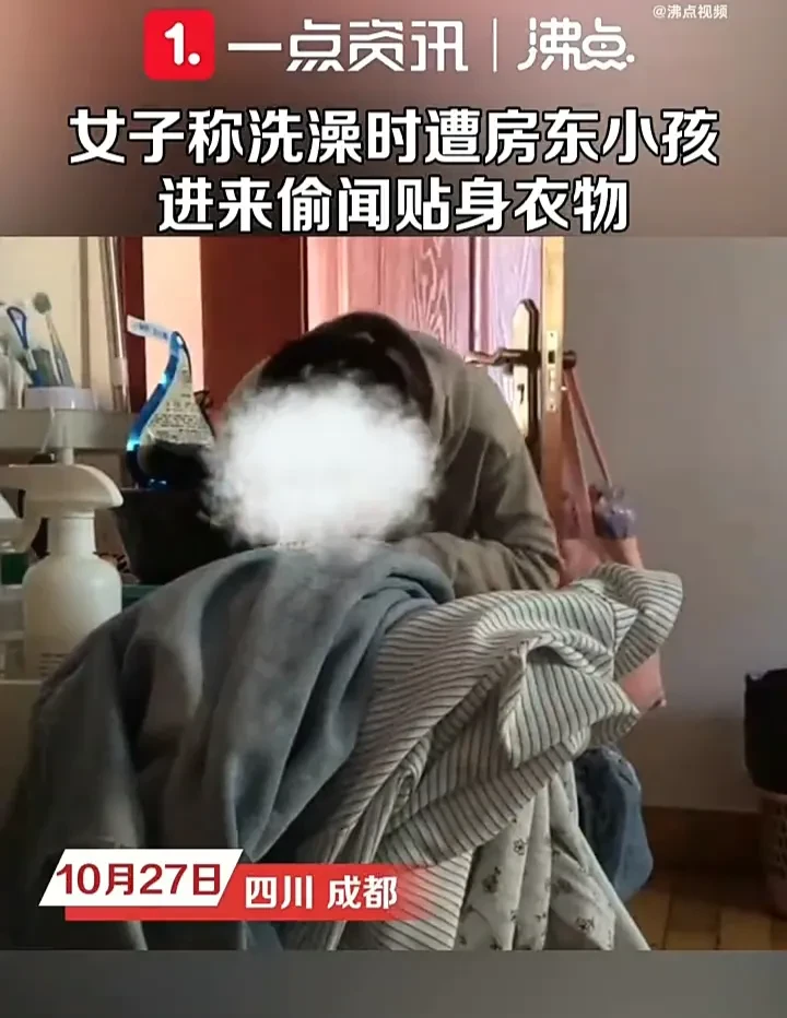 10月27日,四川成都一名女子发视频称,自己洗澡时把换下来的贴身衣物放在椅子上,没想到房东的儿子趁机溜进来,不仅用手翻,还低下头闻,自己找房东理论,得到50元赔偿。