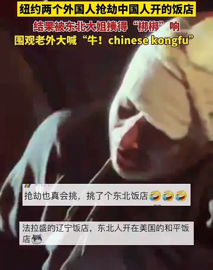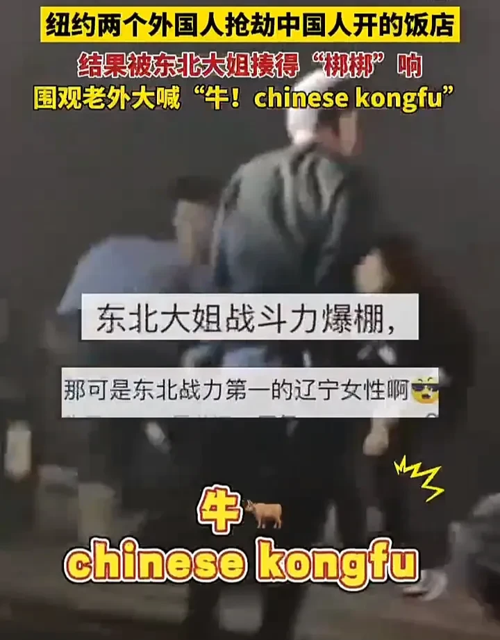 10月27日,美国纽约一名中国女子开的辽宁饭店内,遭遇两个外国男子入室抢劫,结果遭到女子的反击,直接将两人暴揍了一顿,引得周边围观的老外纷纷大喊:“牛!chinese kongfu!”
