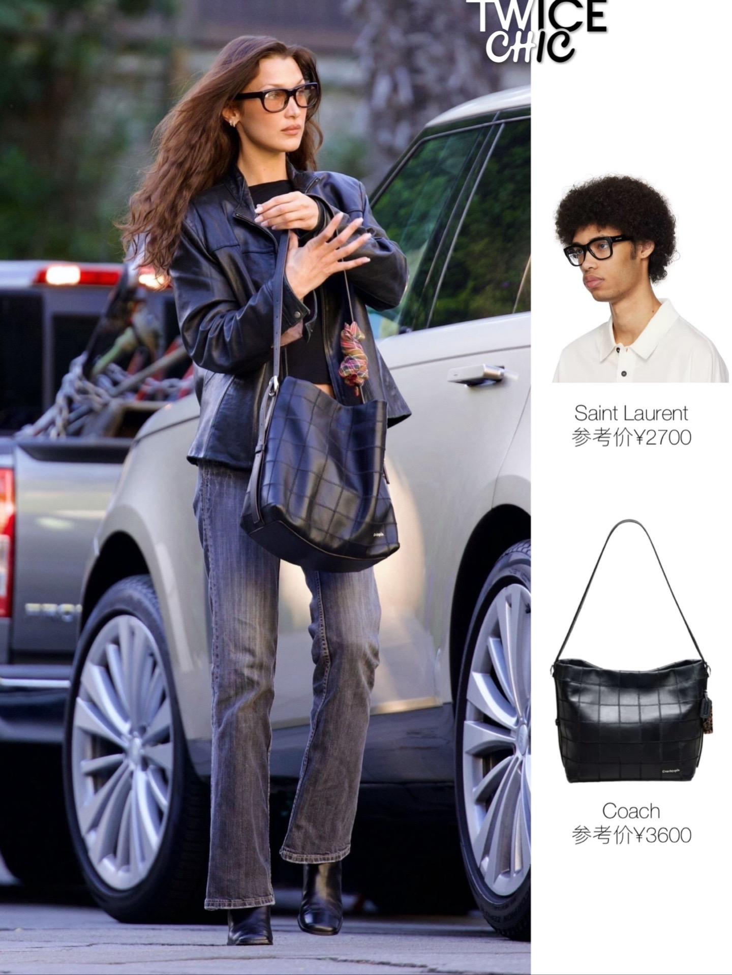 Bella Hadid今日加州出街,复古皮衣搭配仔裤与Coach手袋,再用一副Saint Laurent墨镜点睛。