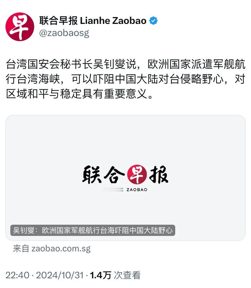 外媒昨晚(10月31日晚)报道:“台湾安全委员会秘书长吴钊燮说,欧洲国家派遣军舰航行台湾海峡,可以吓阻中国大陆对台侵略野心,对区域和平与稳定具有重要意义。” [机智]评几句:吴钊燮这是异想天开,德法军舰穿越台湾海峡就能实现吓阻?简直是白日做梦。台湾是中国不可分割的一部分,这是国际公认的事实。中国维护国家主权和领土完整的决心坚定不移,岂是几艘外国军舰就能动摇的?吴钊燮之流不过是跳梁小丑,妄图依靠外部势力来“谋独”,最终只会是黄粱一梦。