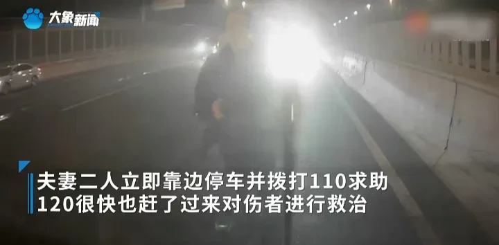 妻子将车停在路边,丈夫则拨打电话报警,两人快步跑到受伤的男女面前,查看两人的伤势。这时男的突然开口,“先救我女朋友。”