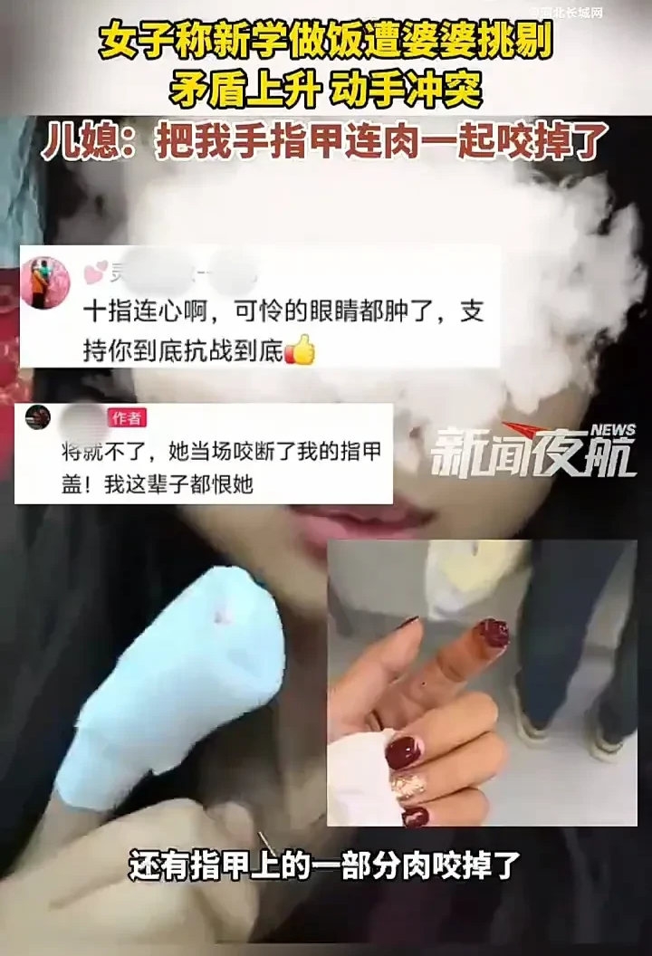 10月30日,陕西铜川一名女子发视频称,自己新学做饭被婆婆挑剔,两人发生争吵,婆婆推了一下自己,自己便开始反击,丈夫在中间拉架,不料婆婆突然发狠,把自己的手指甲咬掉了。
