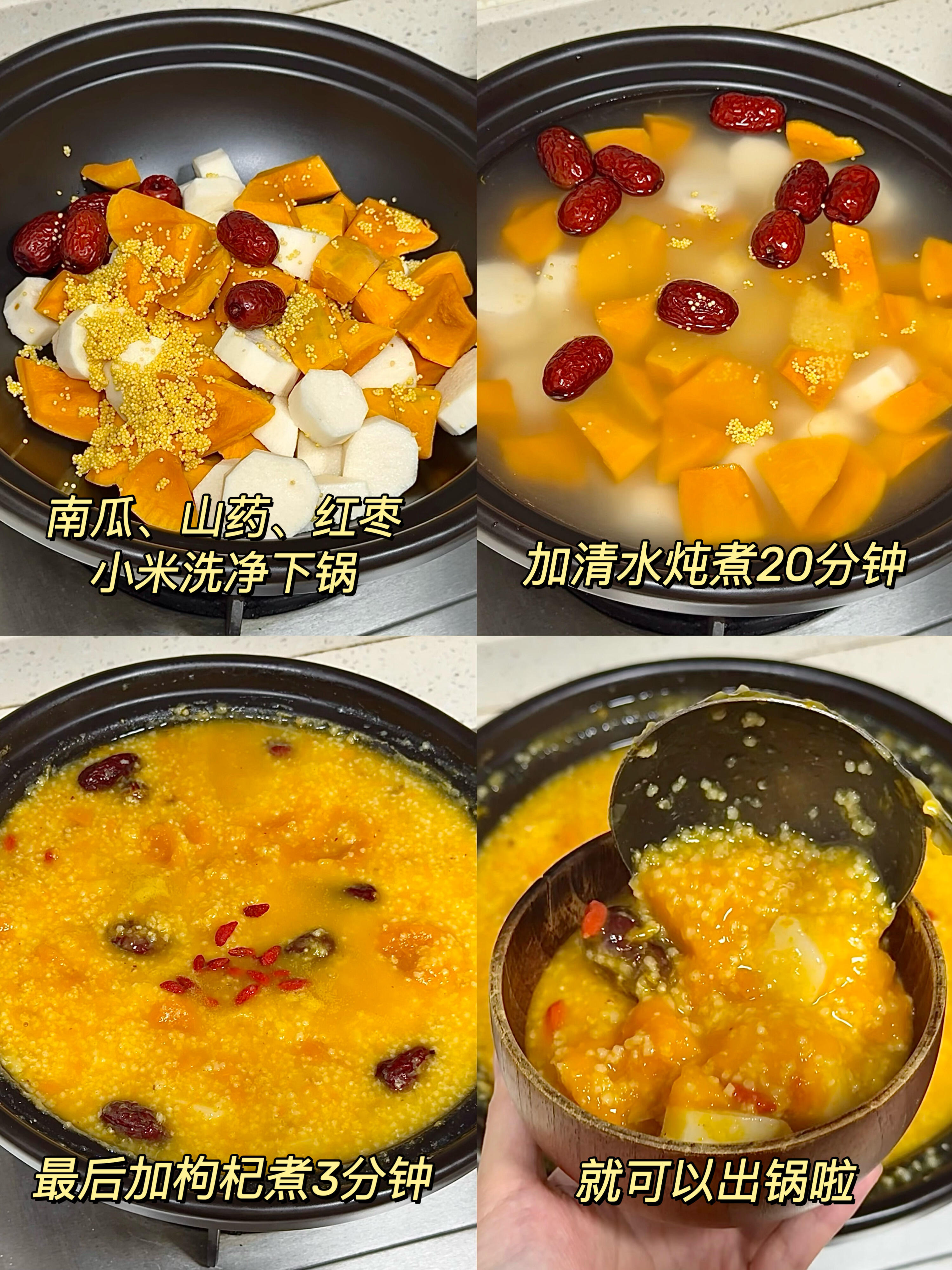 食材:南瓜,山药,小米,红枣,枸杞 做法如图上 喜欢吃甜的姐妹也可以另外加点冰糖一起煮,小米我提前浸泡了20分钟,下锅水开之后就全程小火,中途多搅拌几下不容易糊锅~