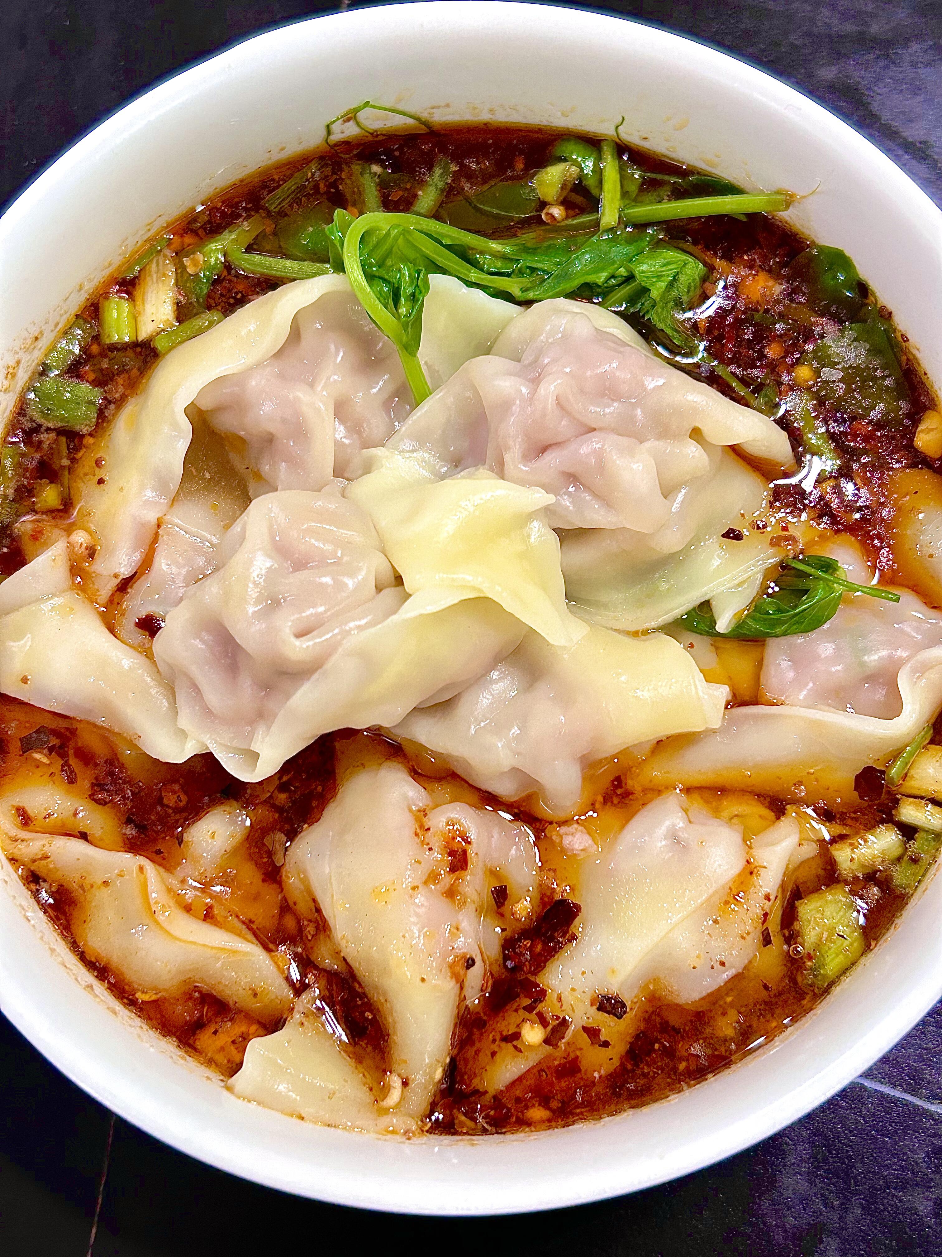 麻辣过瘾,鲜肉抄手,一周至少吃三次都不会腻。 准备食材:抄手皮 肉馅(选前腿三肥七瘦) 做法:1、肉馅加少量胡椒粉 一勺生抽 一勺蚝油 适量盐,一点葱姜水不停搅匀。包好。 2、调料:葱 蒜末 两勺生抽一勺醋 两勺花椒粉 一勺蚝油 一坨猪油 适量盐鸡精,抄手水开煮熟,最后放入豌豆尖烫几秒关火。