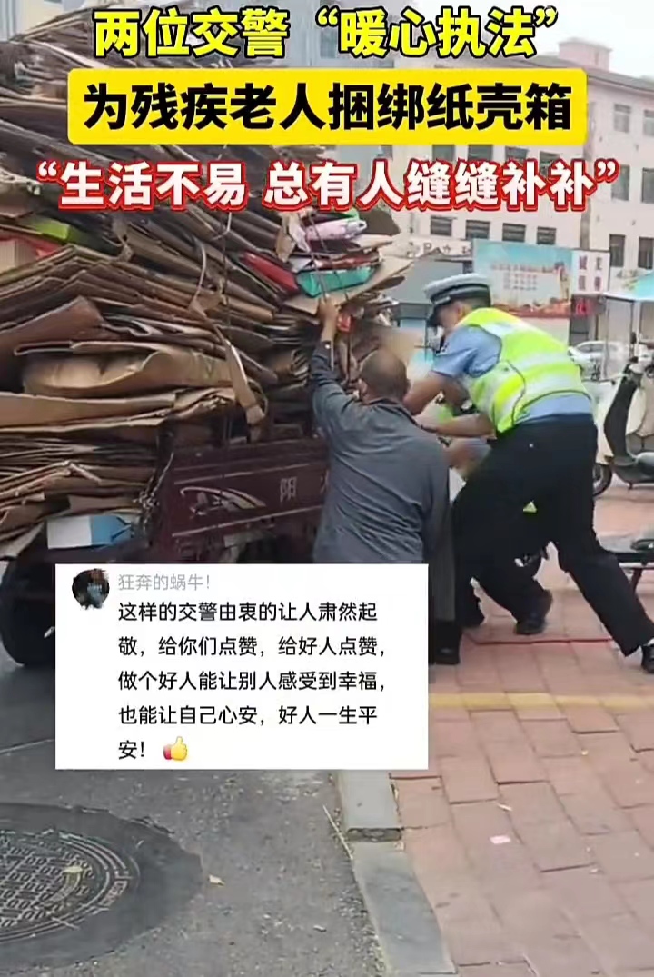 近日,河南一位残疾大哥载着一车纸壳箱回家途中,不料绑纸壳箱的绳索松了,两位民警见状,立刻上前帮助大哥绑好。网友:“这一刻他们的样子好帅!”