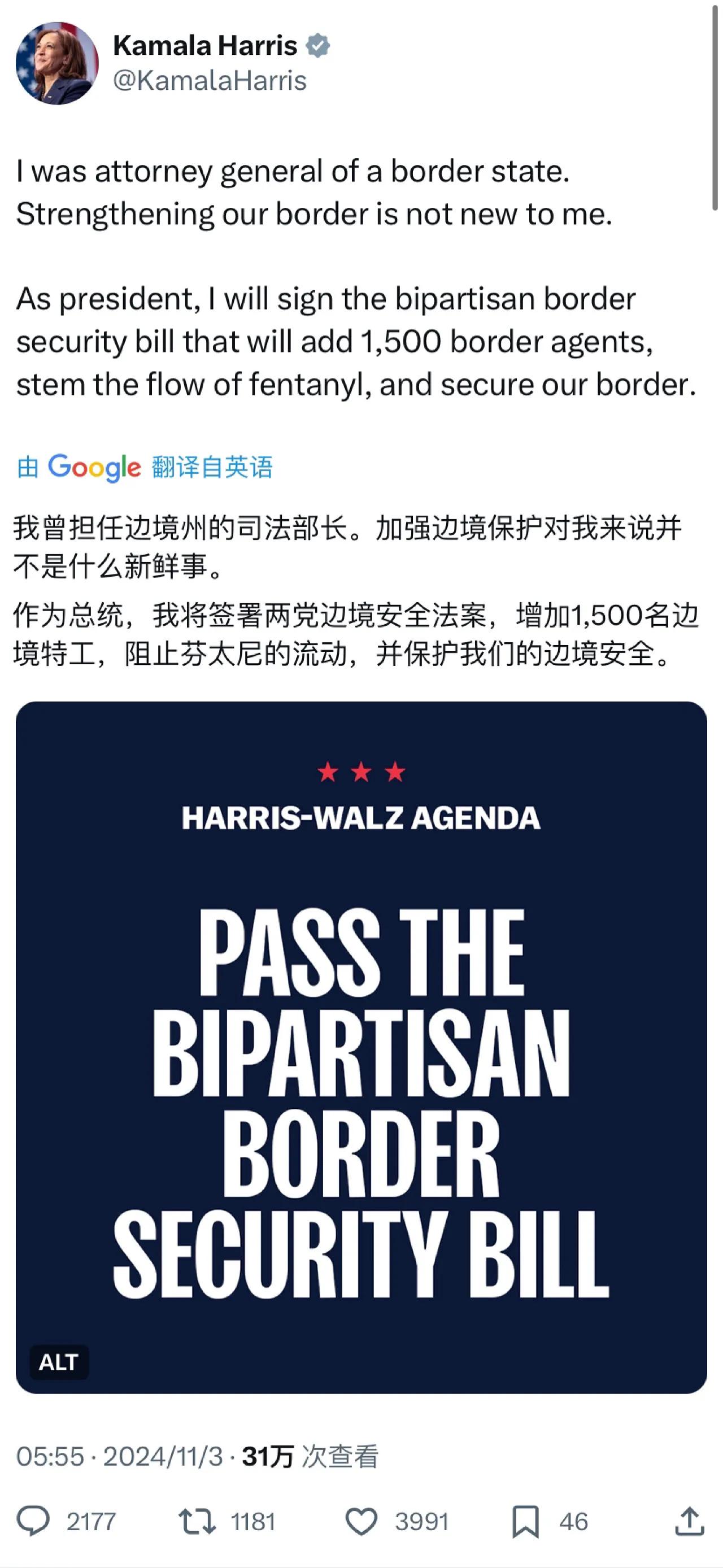 #美国大选厮杀:分高下 决“生死”# 特朗普今天(北京时间11月2日)写道:“美国现在是一个被占领的国家,但很快它将不再是一个被占领的国家。2024 年 11 月 5 日将是美国的解放日!” 哈里斯今天(北京时间11月2日)写道:“我曾担任边境州的司法部长。加强边境保护对我来说并不是什么新鲜事。作为总统,我将签署两党边境安全法案,增加1,500名边境特工,阻止芬太尼的流动,并保护我们的边境安全。” [机智]北京时间11月6日,看最后鹿死谁手吧!民调显示特朗普和哈里斯势均力敌,胜负关键将取决于谁能在摇摆州取得胜利。七个摇摆州的选举结果,将决定美国总统大选的结果。