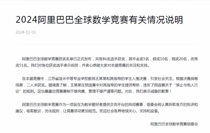 她还未到18岁,未成年,步入现在她学习的学校,进入阿里数学竞赛这个社会圈,人际关系复杂,不小心掉坑里,当下大家要拉她一把,原谅她。未来的路她还有很长要走。