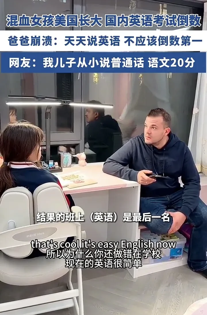 11月1日,江苏镇江一名女子发视频称,自己是跨国婚姻,女儿从小在美国长大,4岁时回到国内上学,女儿能够用英语和爸爸交流,以为她英语会有不错的成绩,没想到考了倒数,爸爸直接崩溃了。