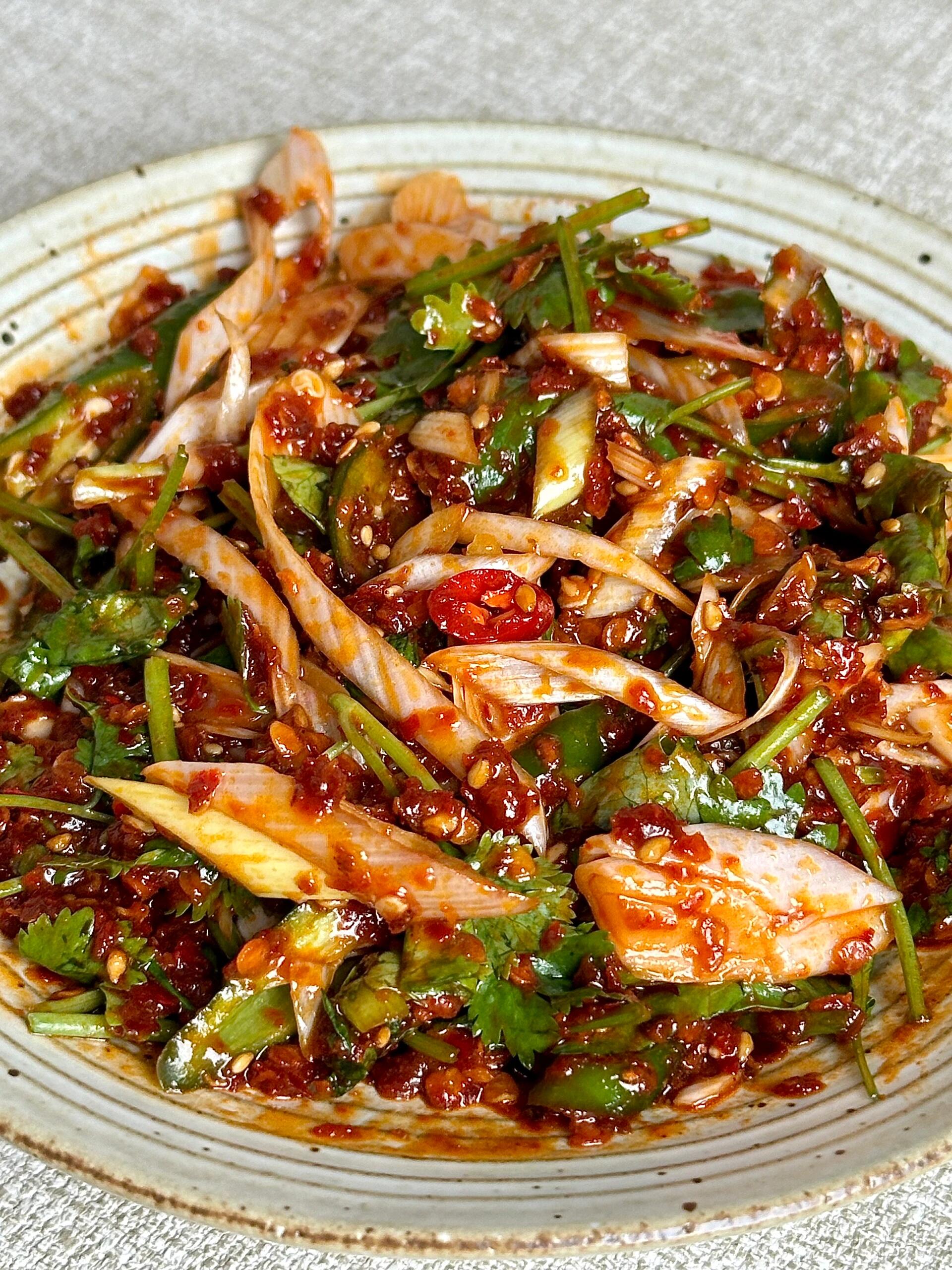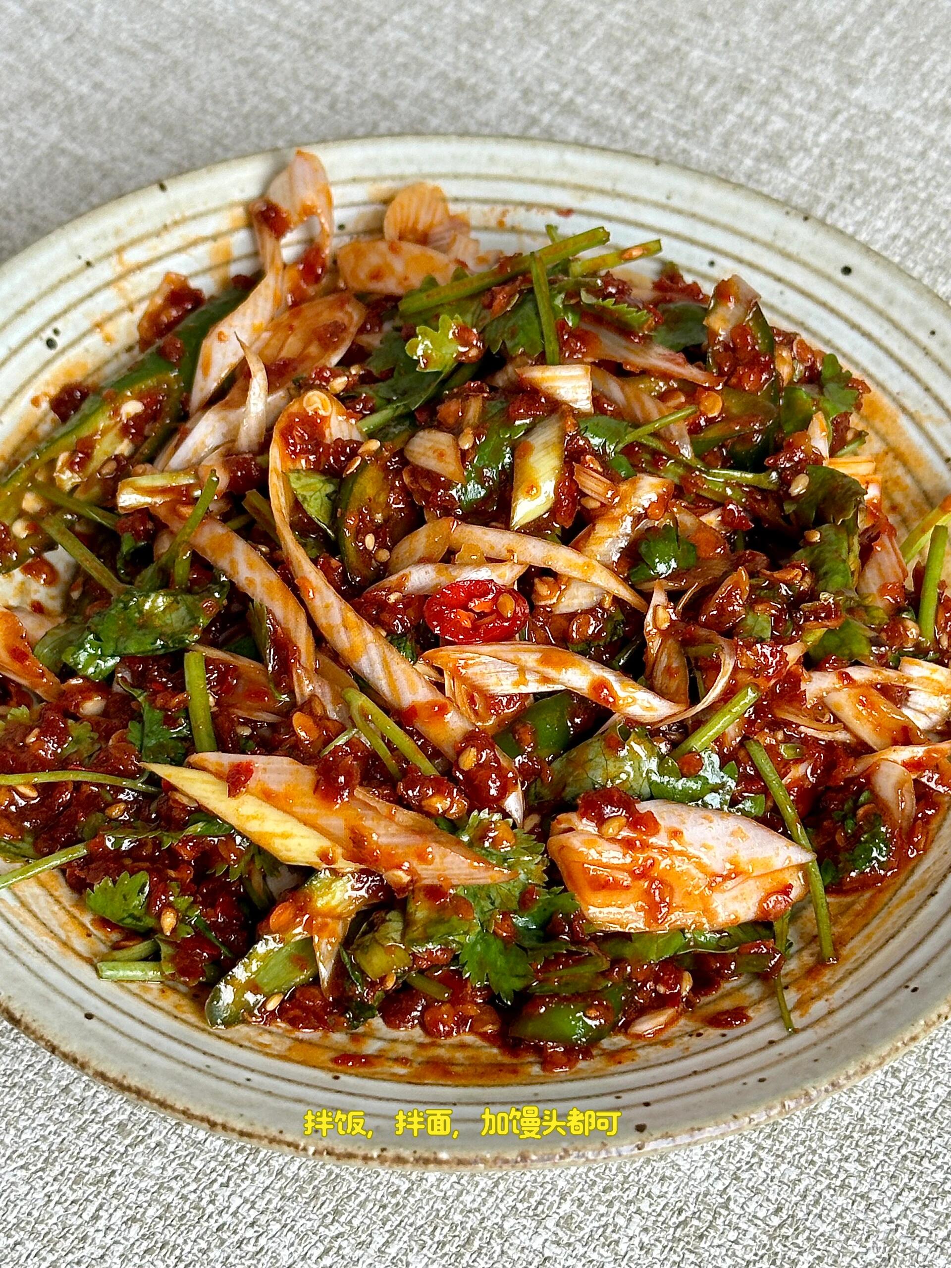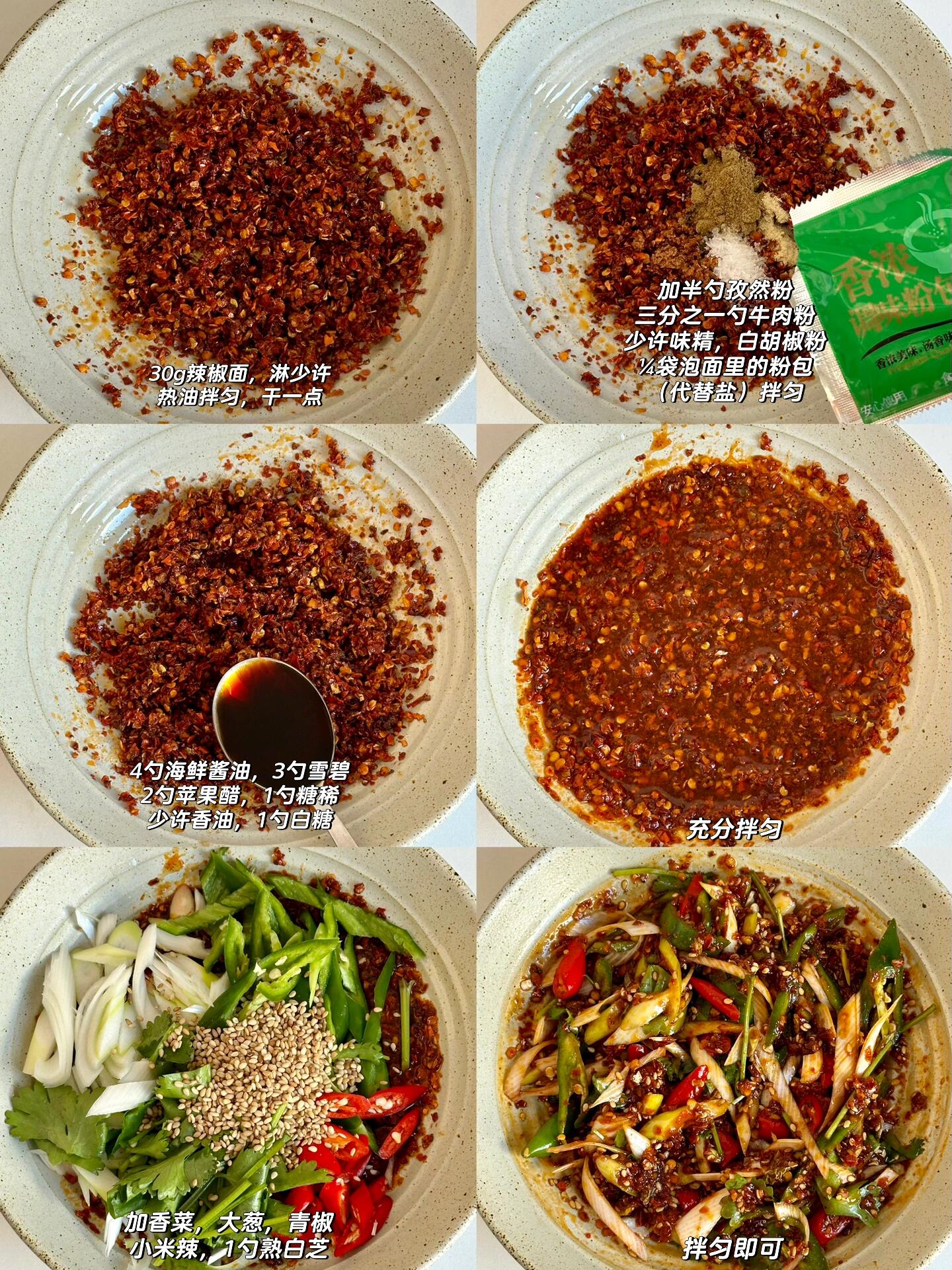 什么都不学,这个万能火辣凉拌菜一定要试试,尊嘟尊嘟太下饭了,做法简单,一看就会 做法: 30g辣椒面,淋少许热油拌匀,干一点,不要太稀,加半勺孜然粉,三分之一勺牛肉粉,少许味精,白胡椒粉,¼袋泡面里的粉包(代替盐)拌匀,4勺海鲜酱油,3勺雪碧,2勺苹果醋,1勺糖稀,少许香油,1勺白糖拌匀,加香菜,大葱,青椒,小米辣,1勺熟白芝麻拌匀即可!