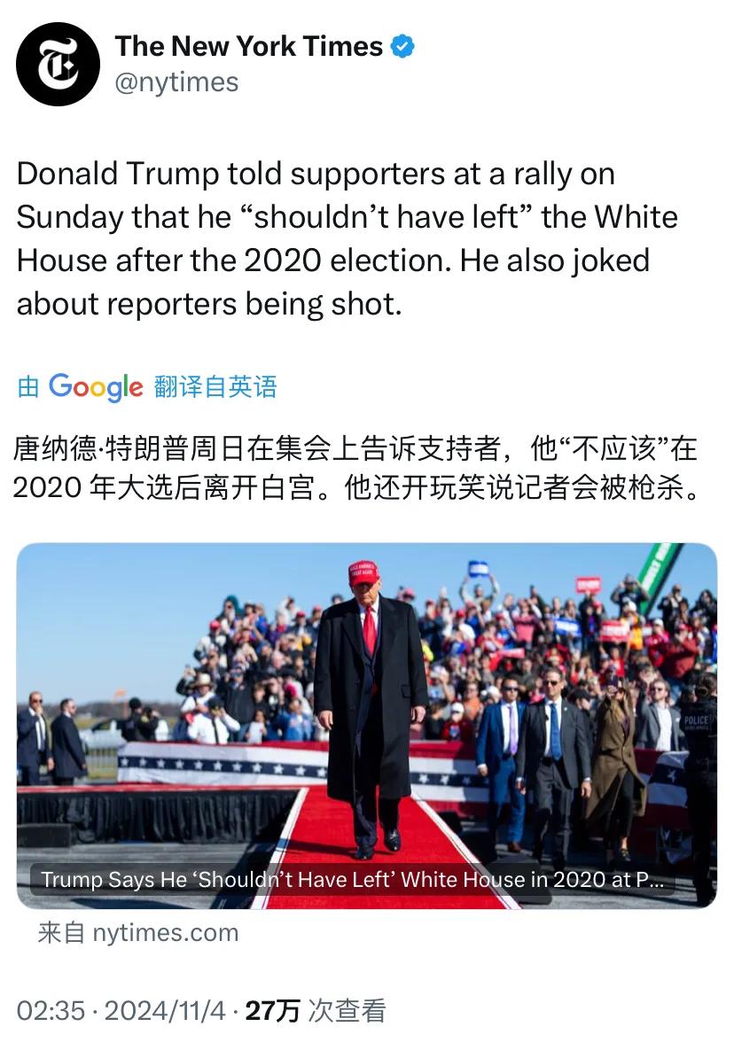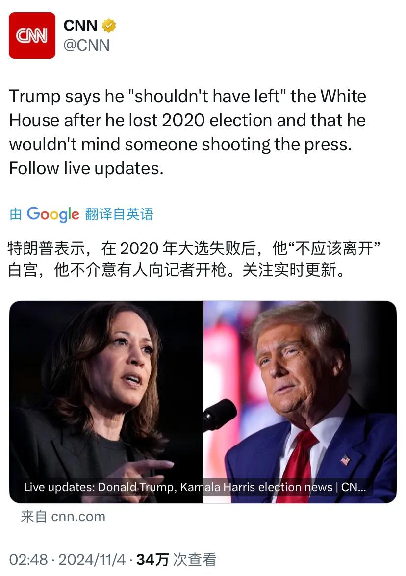 唐纳德·特朗普刚刚(北京时间11月4日)表示,他不应该在 2020 年大选后离开白宫。“我不应该离开。说实话。” 民调更新(截至北京时间11月4日6:00) 🔴538:特朗普赢得选举人票,哈里斯赢得普选; 🔴 AtlasIntel:特朗普领先2%; 🟣 NBC新闻:平局; 🟣 Emerson:平局; 🔵 Yahoo/YouGov:哈里斯领先1%; 🔵 Morning Compost:哈里斯领先2%; 🔵 ABC/Ipsos:哈里斯领先3%。 特朗普和哈里斯,两人差距不大,一切结果都有可能。