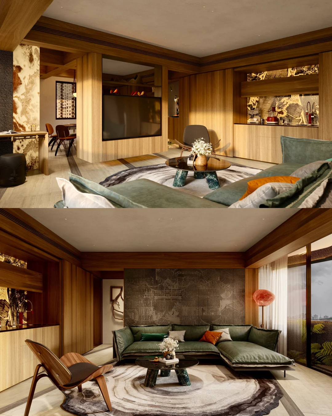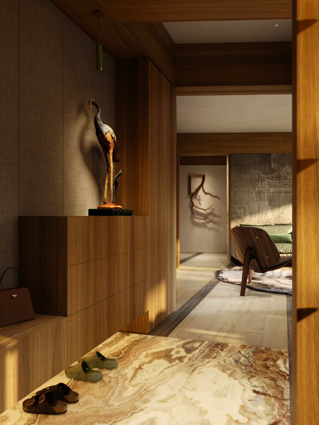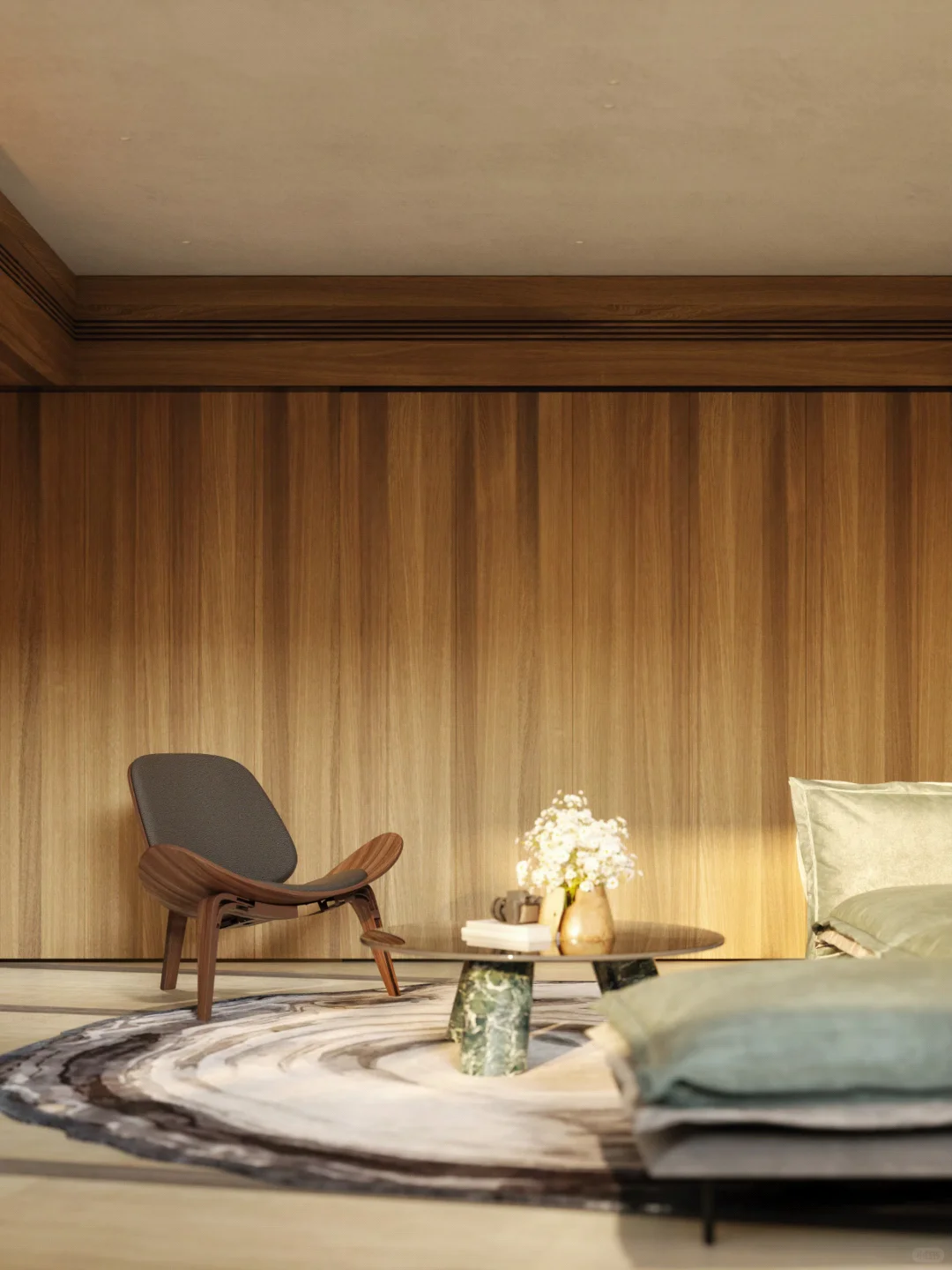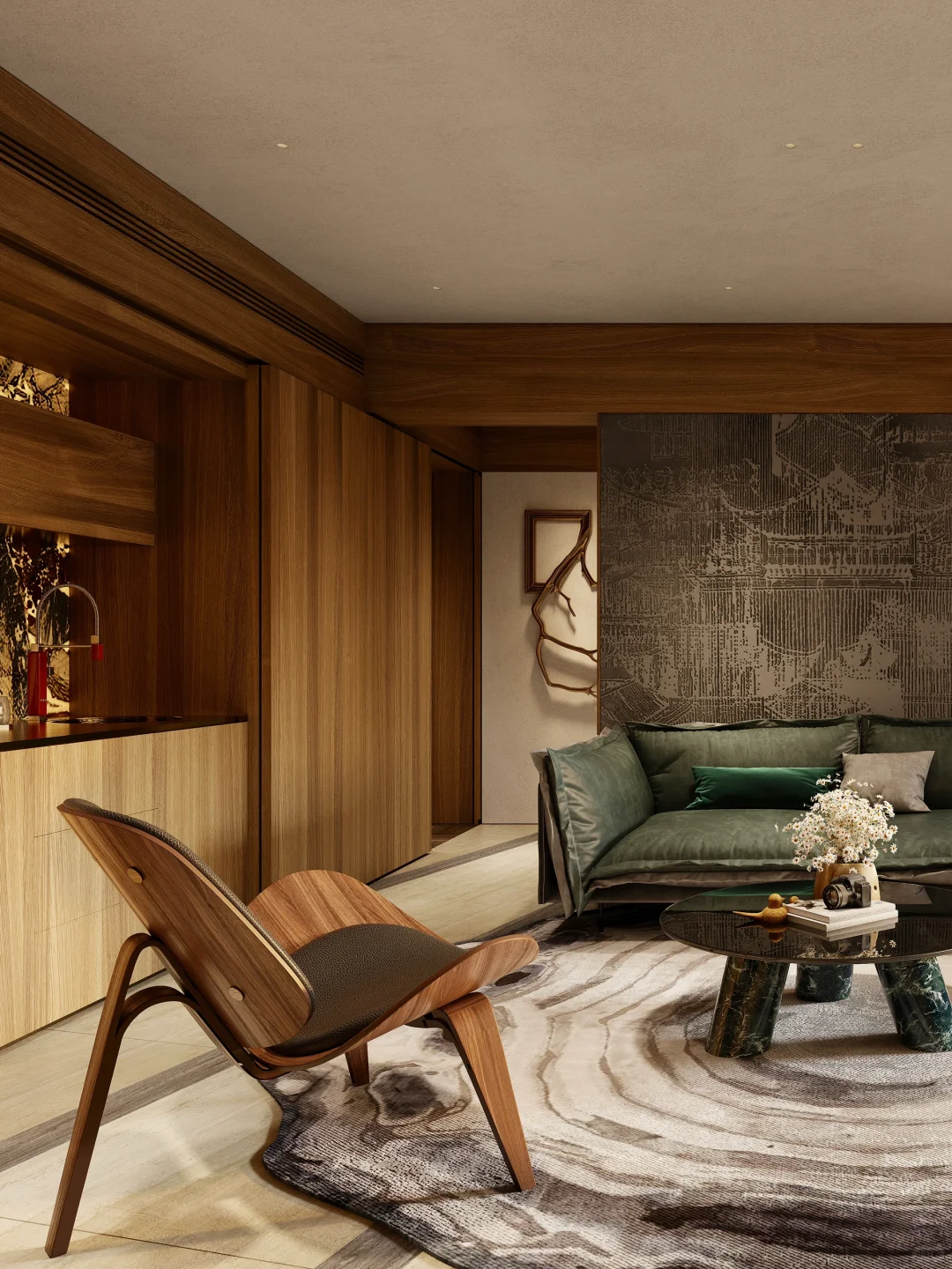 ADDRESS.温州诚达大厦 以柚木为底色,天然柚木打造的新中式家居空间。 以硬装为基础,大量木头填充了这个空间。没有过多的装饰,仅在色彩上做了浓郁的搭配就能显出整体质感。柚木独一无二的天然纹理和色泽,为整体空间增添了一抹中式韵味。 客厅的角落则是柚木与大理石的协同合作,温润石材下摆放的书桌更让人有沉浸看书的欲望了。知性的柚木,加上独特的大理石,呈现的风格让人沉醉……