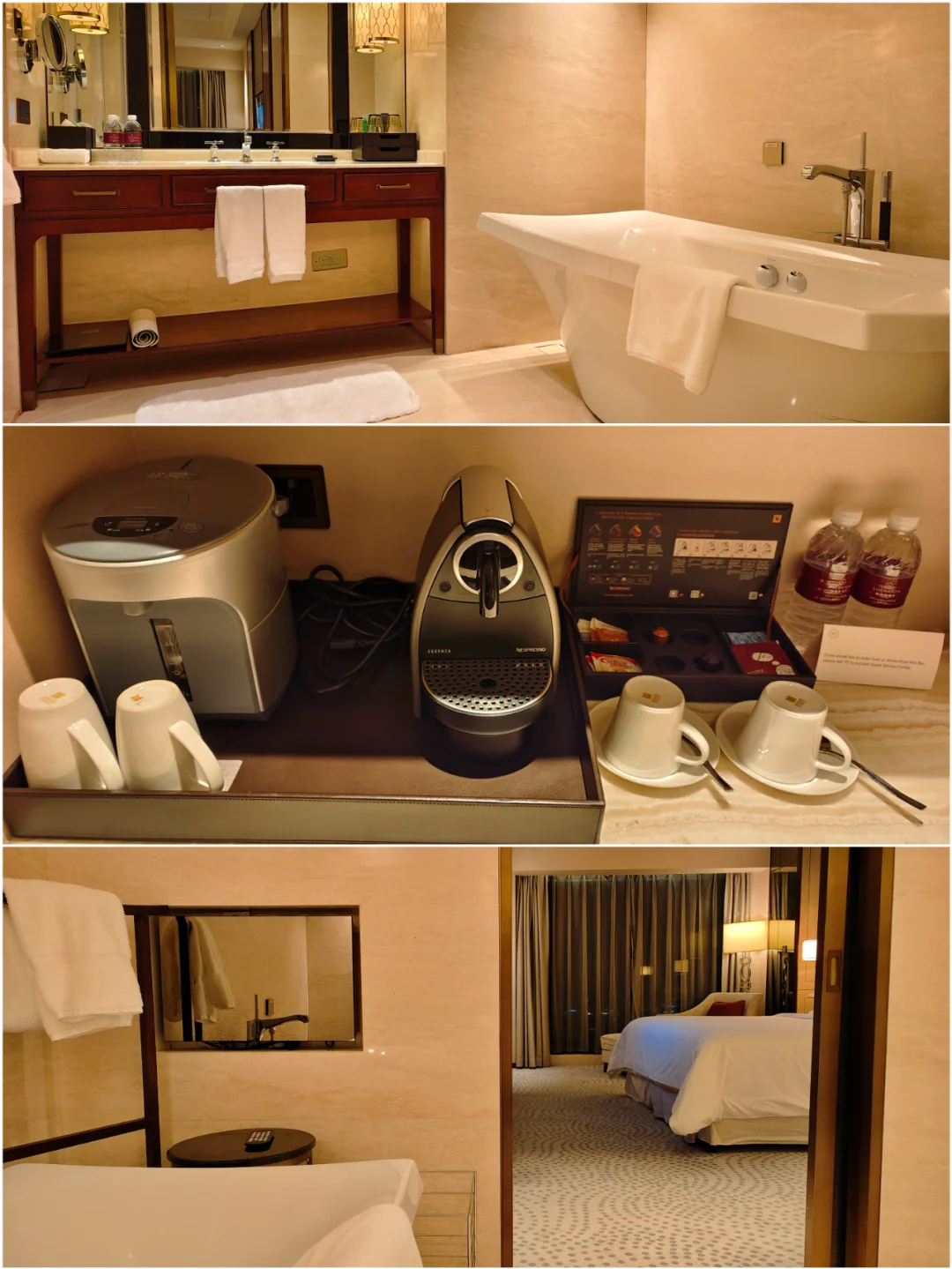 订乞丐大床房,升级到21楼的2118行政套房,标称面积90平米,一室一厅两卫的格局,有胶囊咖啡机,欢迎水果是老套红绿灯。