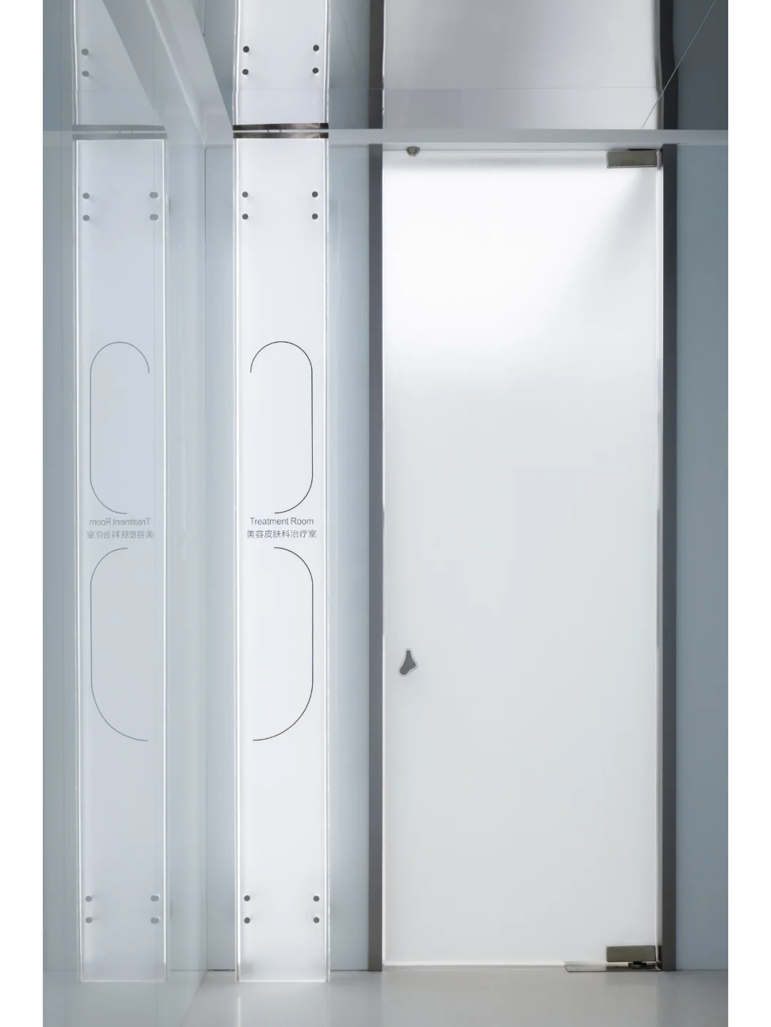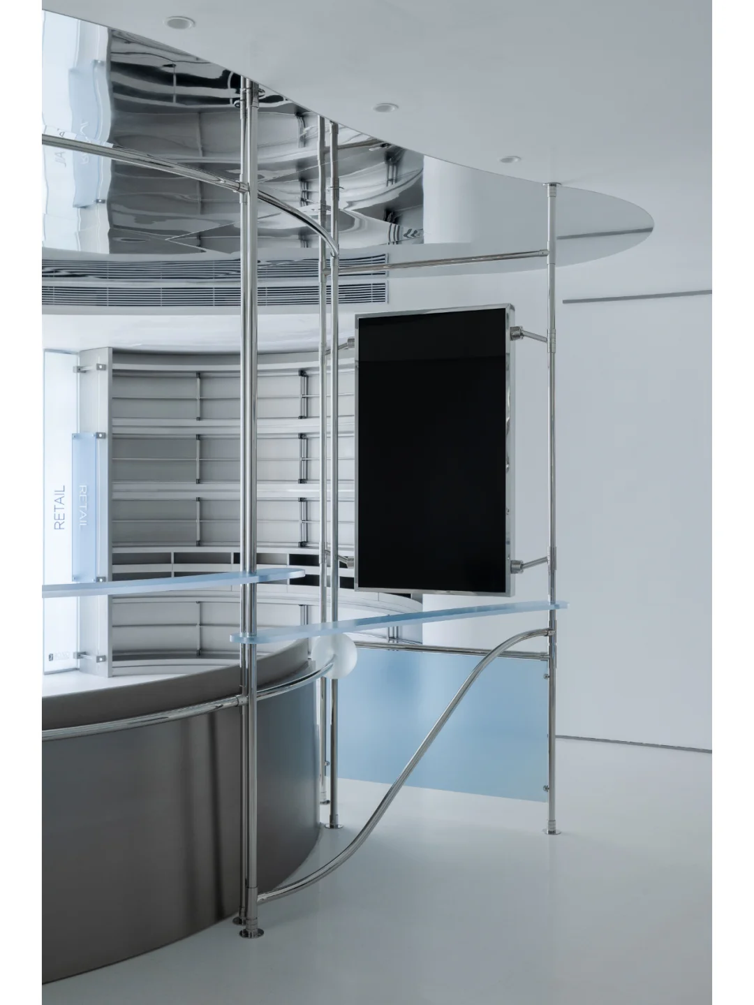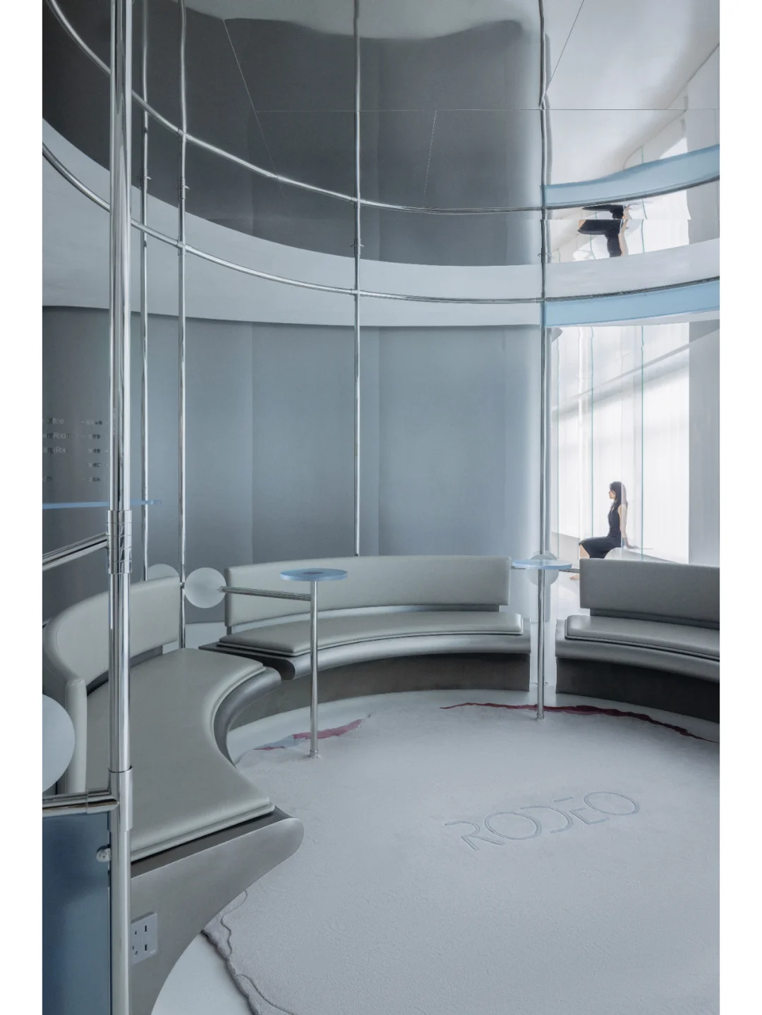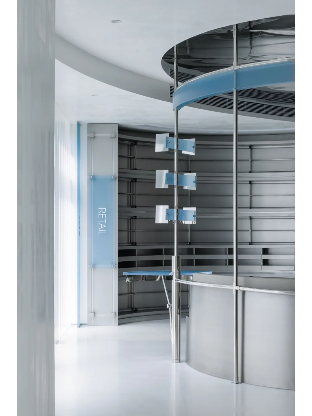在围绕Rodeo柔缇欧提出的 “生物科技” 这一理念展开的讨论中,半筑设计重新梳理出品牌关键词 ——“专业、高效、科技、未来”,制定了一套从视觉语言到空间语言高度统一的全新品牌标准,设计了一系列空间道具来强化品牌气质,如悬浮且内部透光的亚克力接待台、接待区的弧形道具以及墙面弧形陈列架等。
