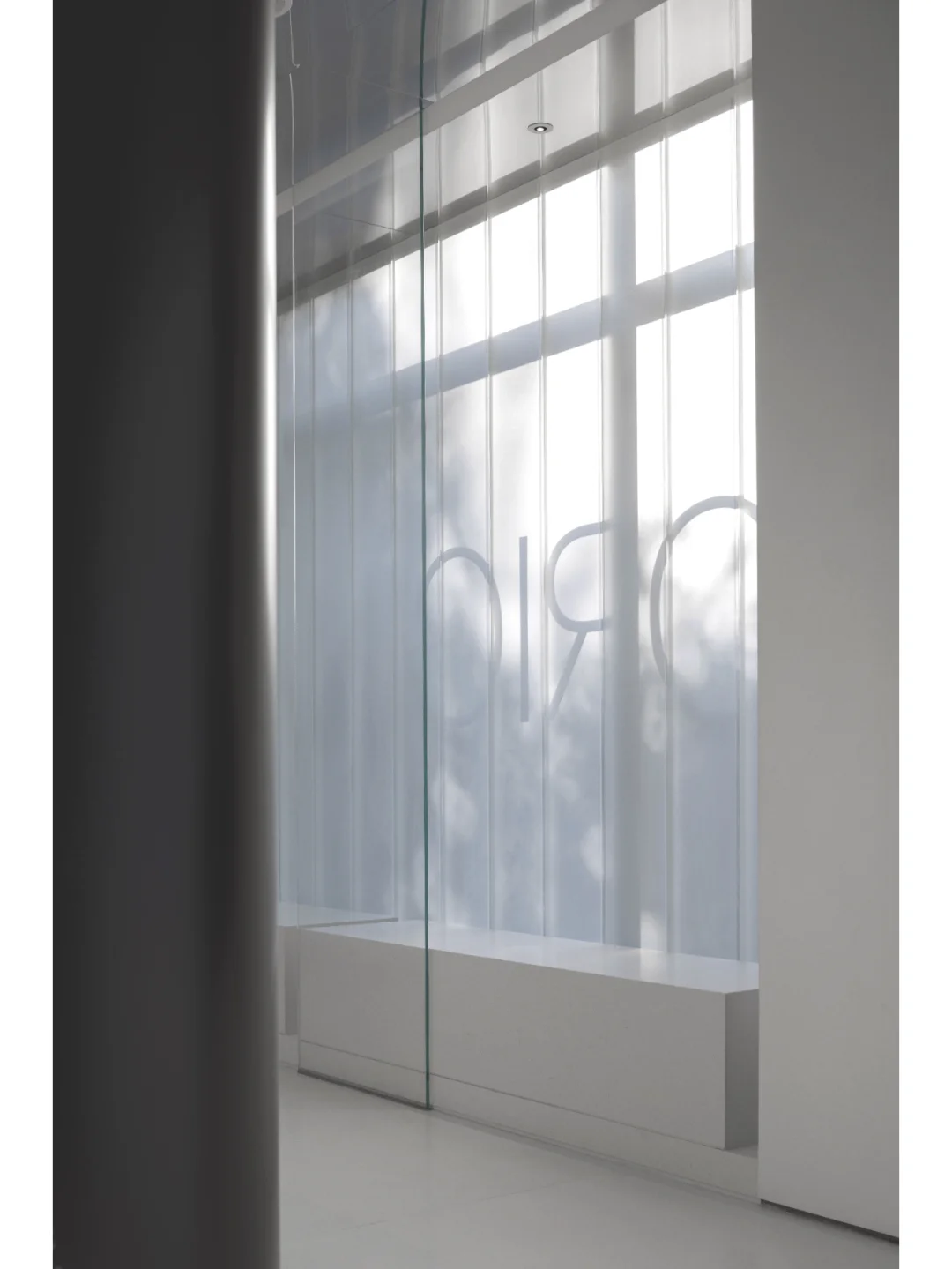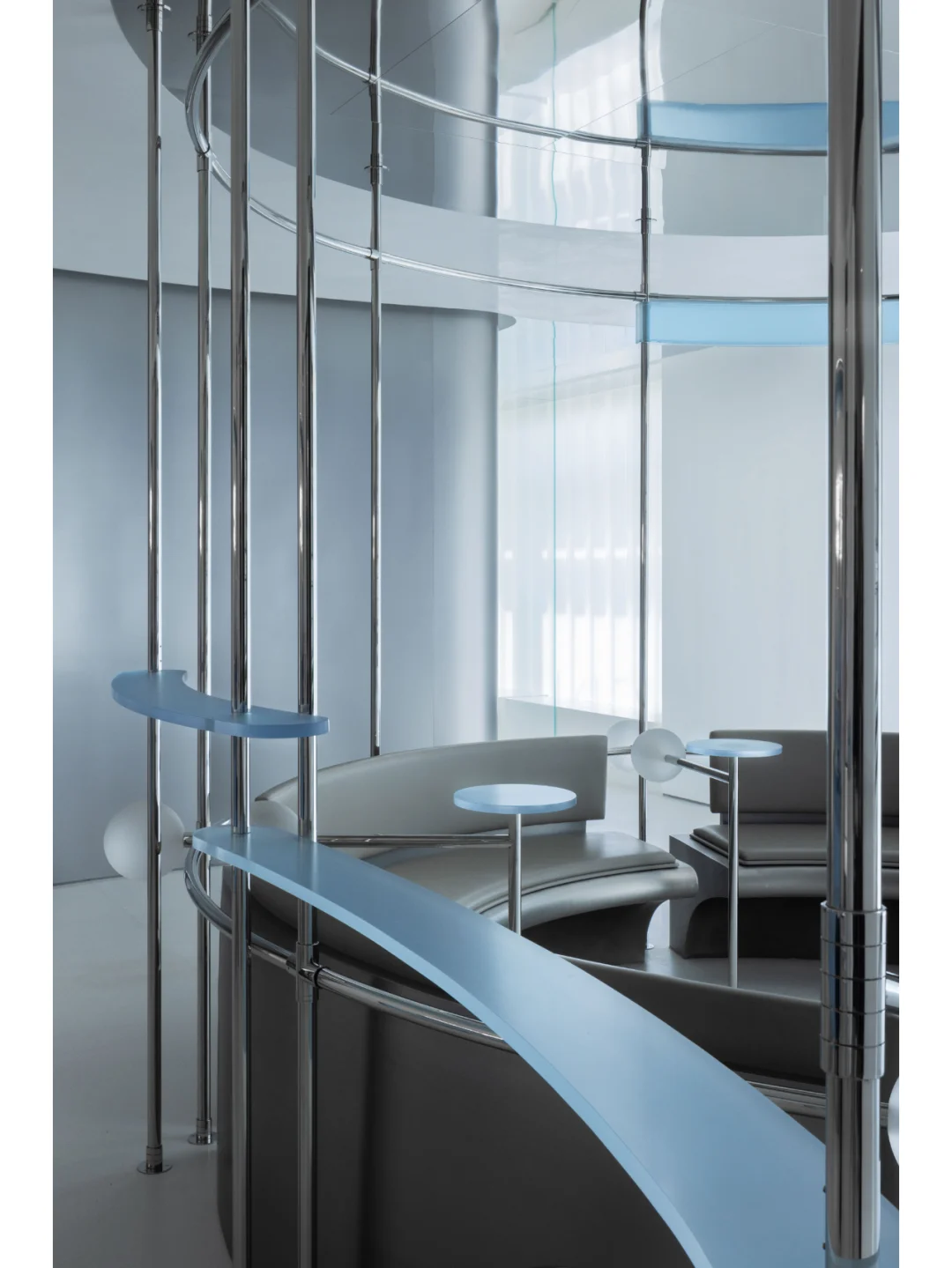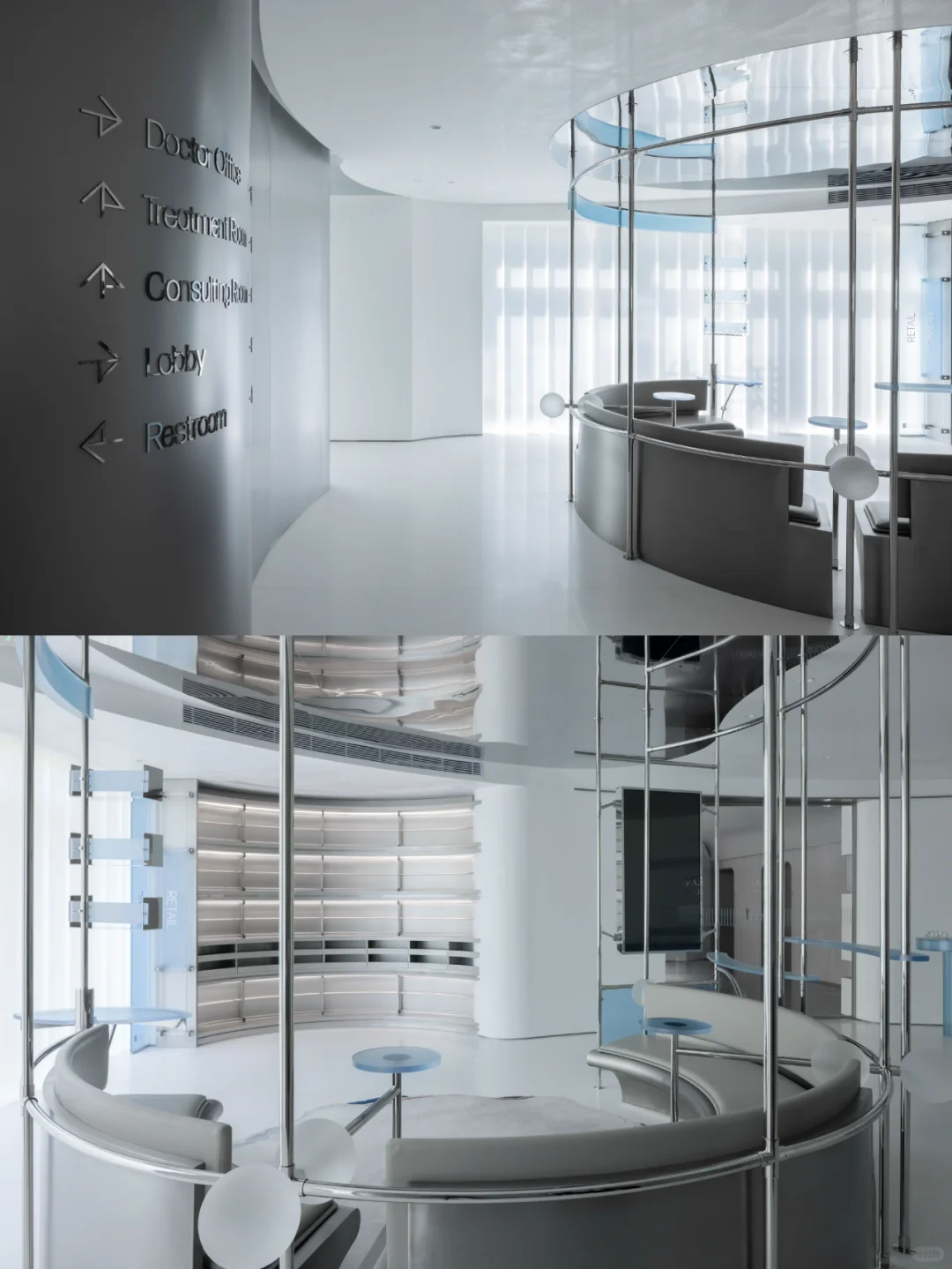 在围绕Rodeo柔缇欧提出的 “生物科技” 这一理念展开的讨论中,半筑设计重新梳理出品牌关键词 ——“专业、高效、科技、未来”,制定了一套从视觉语言到空间语言高度统一的全新品牌标准,设计了一系列空间道具来强化品牌气质,如悬浮且内部透光的亚克力接待台、接待区的弧形道具以及墙面弧形陈列架等。