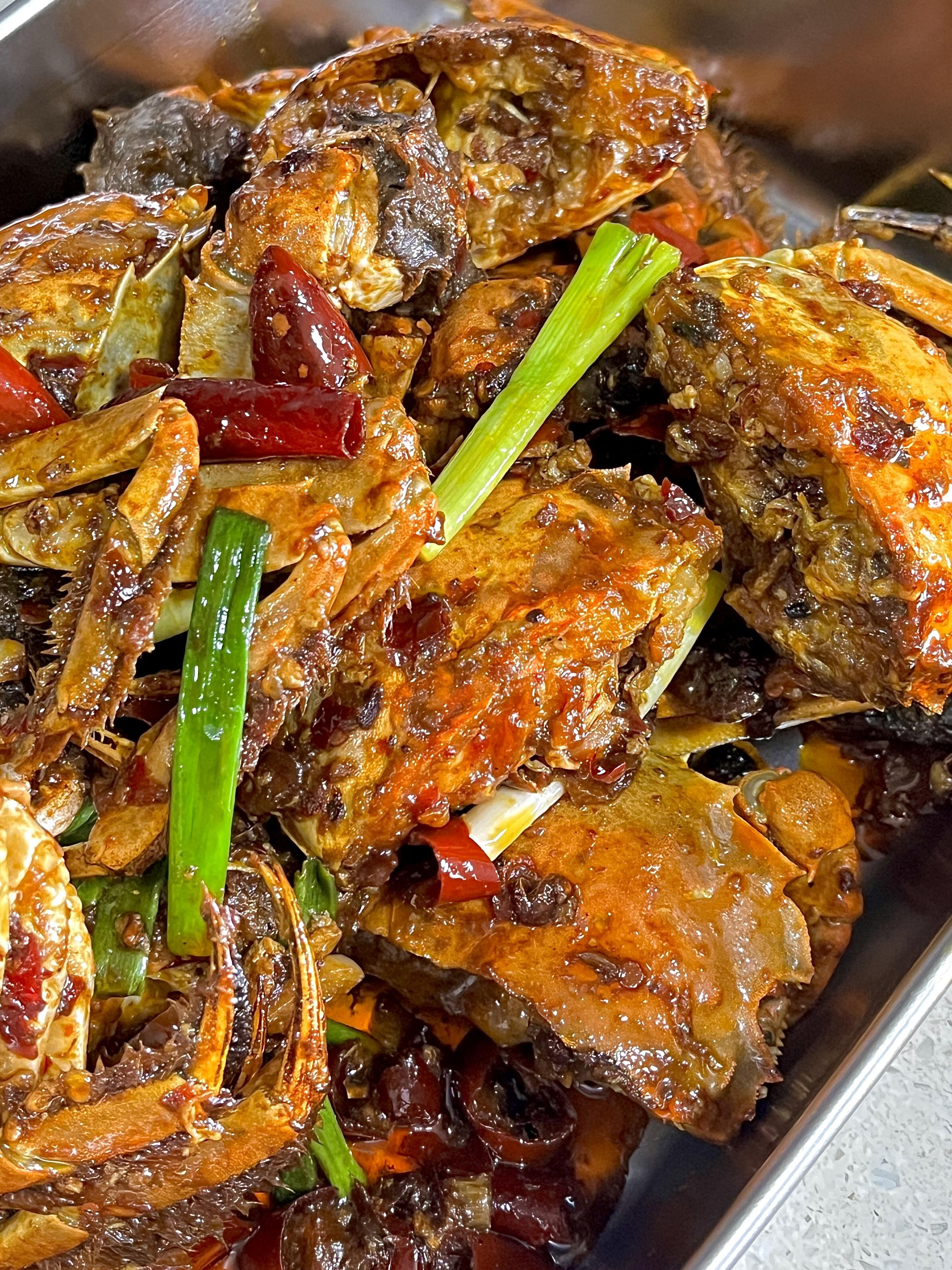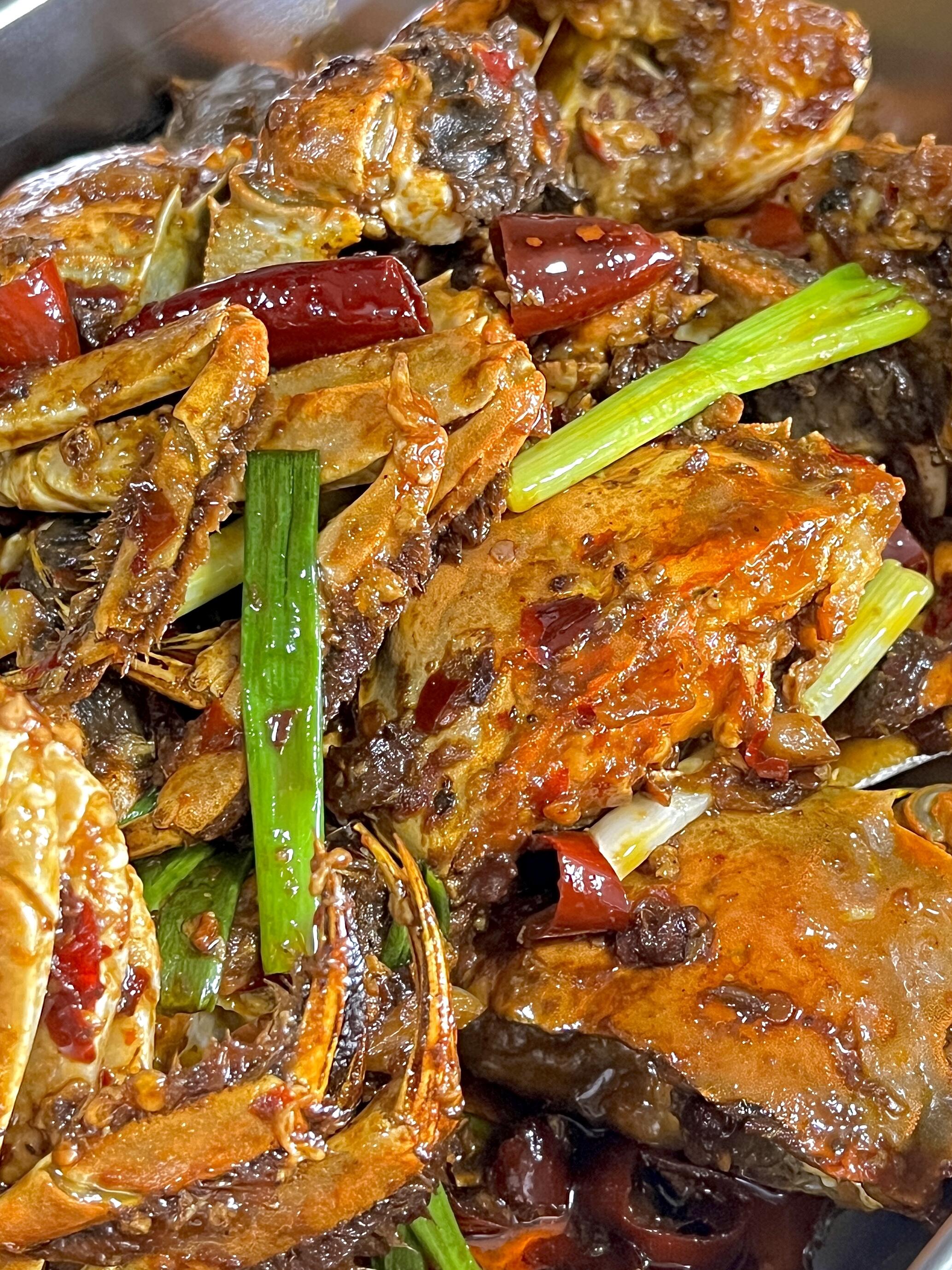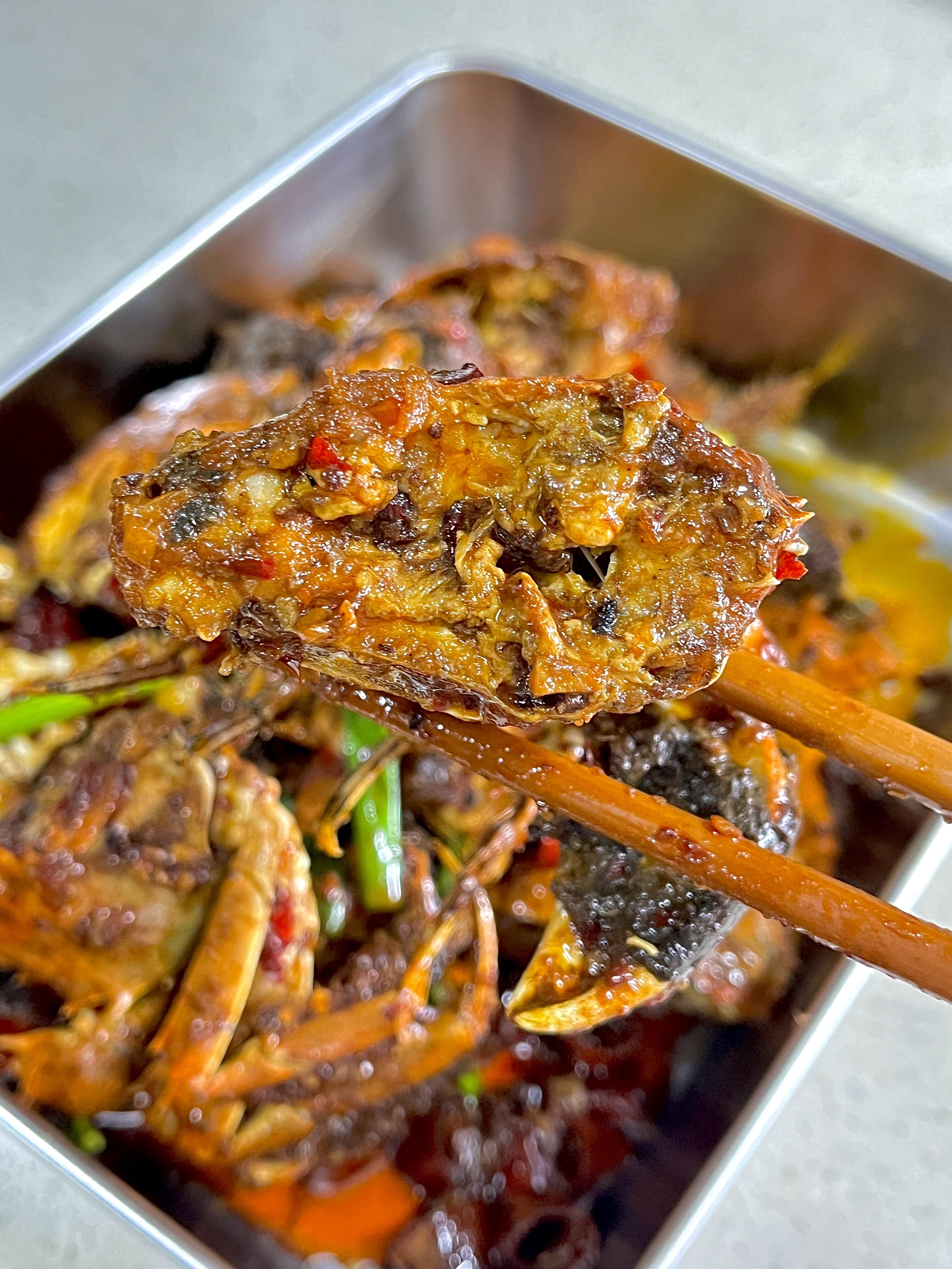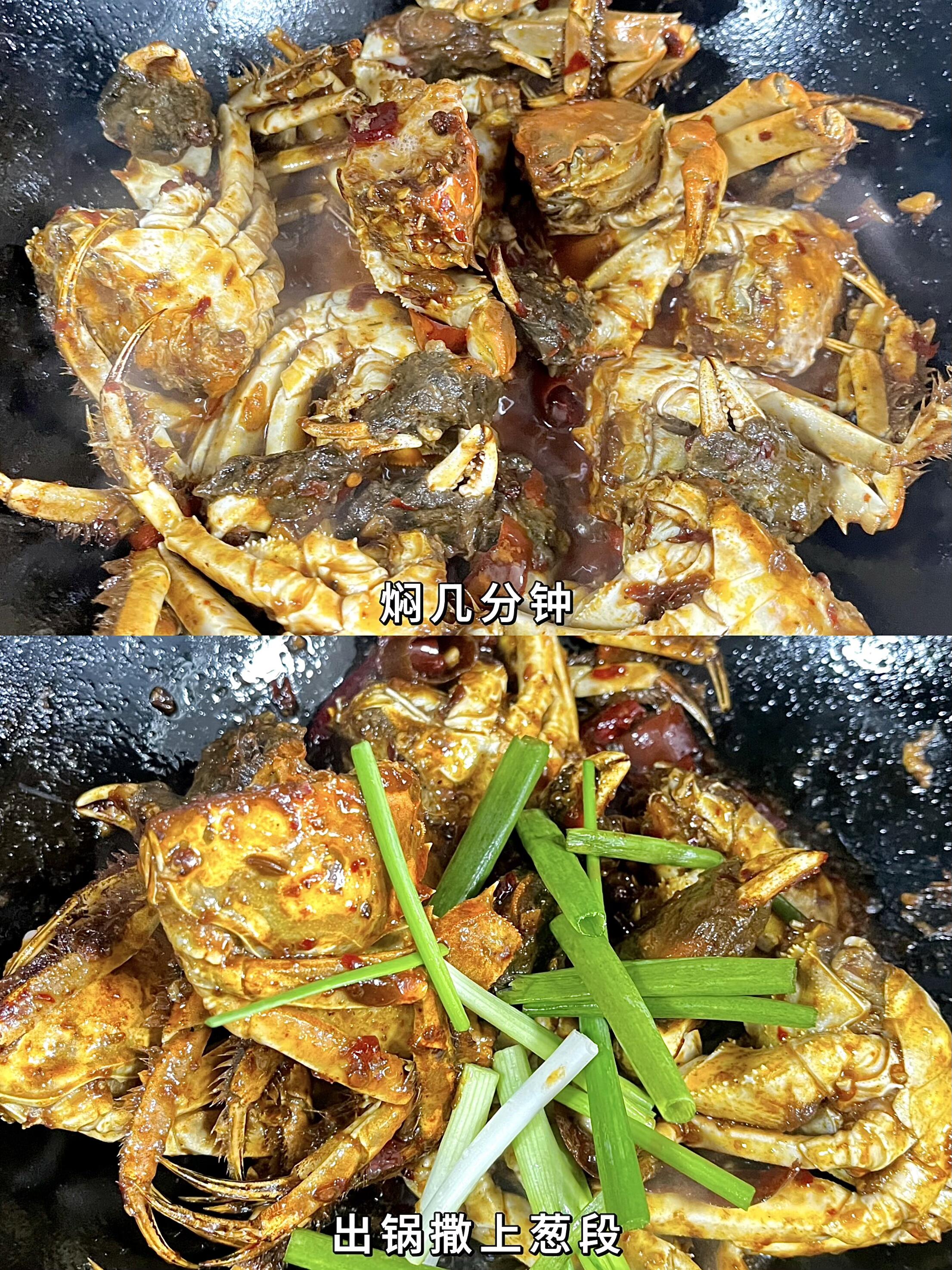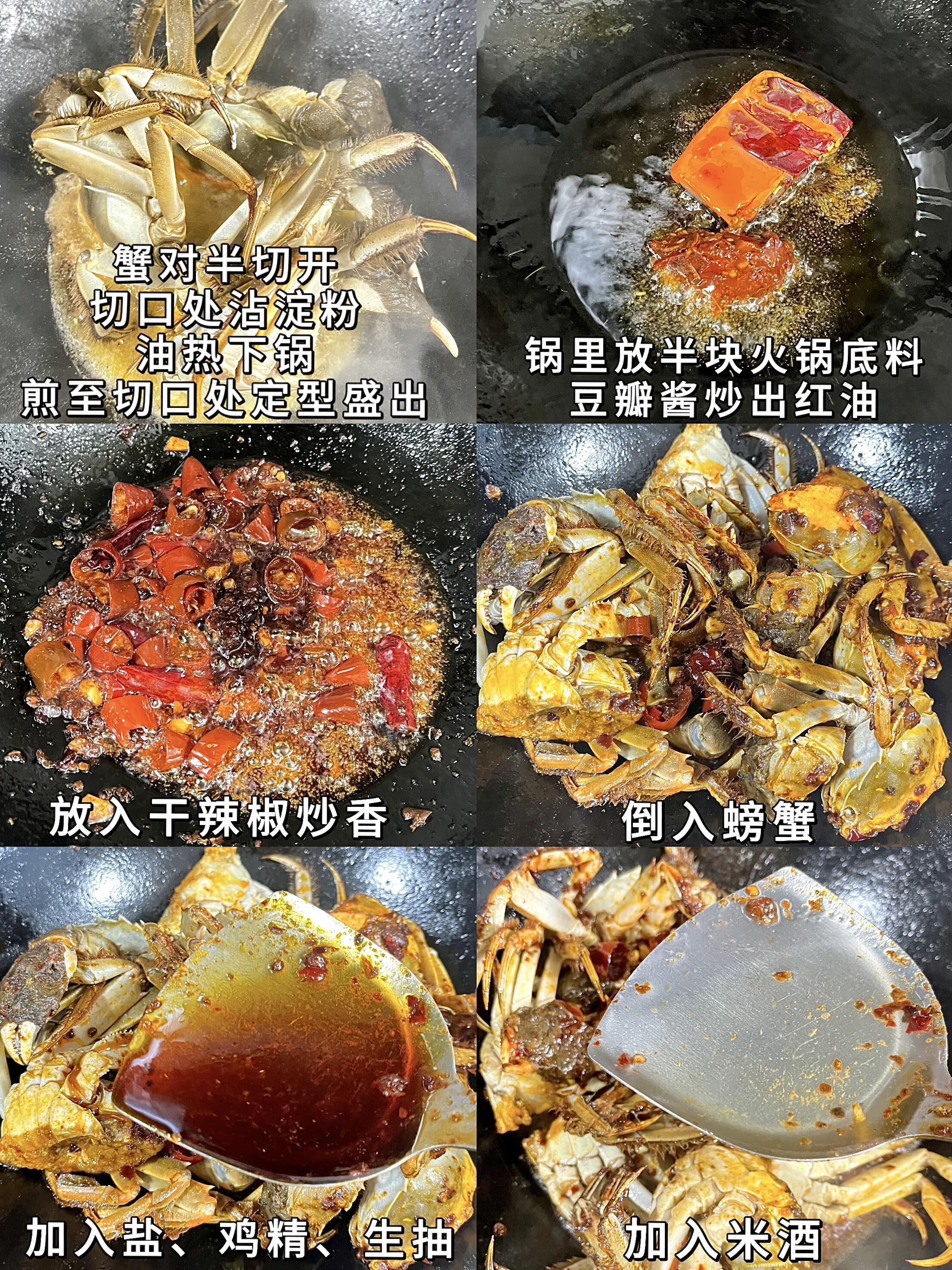 香辣入味,好吃到嗦手指 在家一次过足瘾,比在外面吃划算多了 食材:螃蟹、火锅底料、豆瓣酱、干辣椒、葱 做法: 1、蟹对半切开,切口处沾淀粉,油热下锅煎至切口处定型盛出 2、锅里放半块火锅底料、豆瓣酱炒出红油,放入干辣椒炒香 3、倒入螃蟹,加入盐、鸡精、生抽、米酒焖几分钟,出锅撒上葱段 妈呀太香了