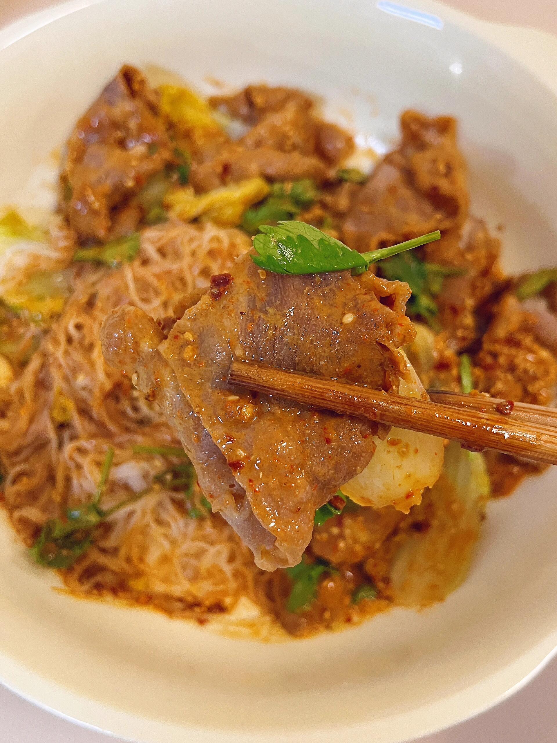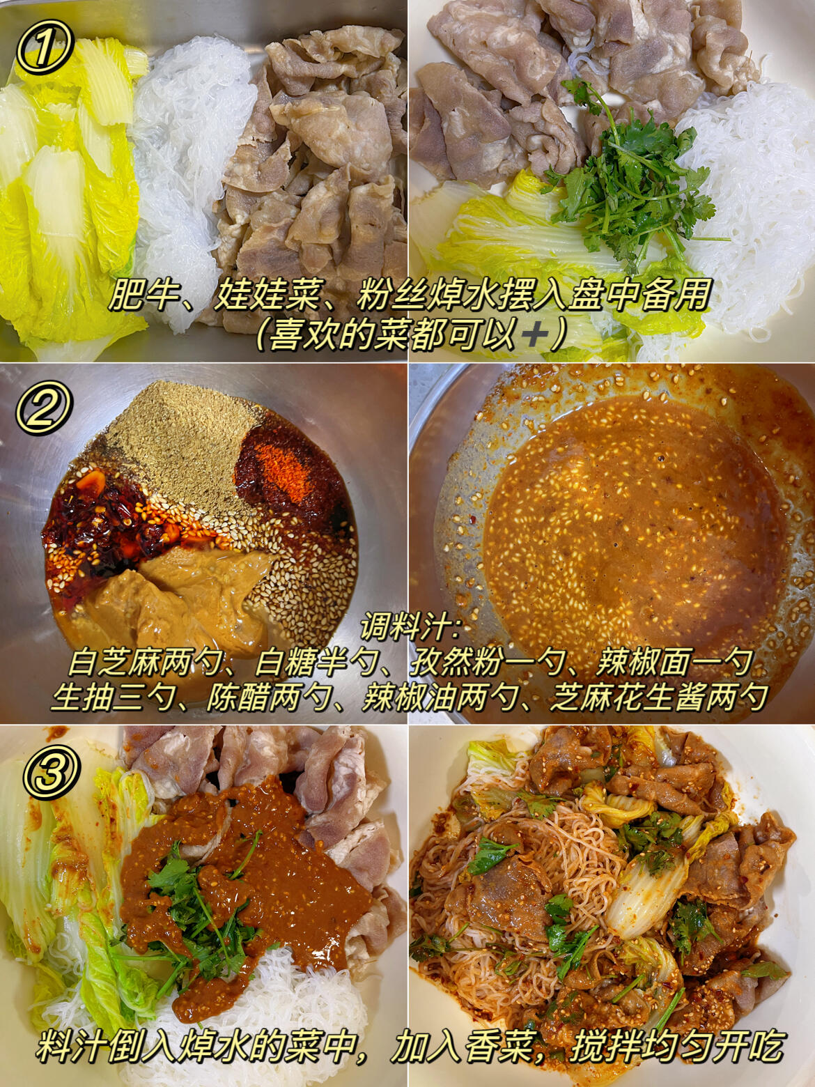 这个酱汁肥牛真的绝了!不瞒你们说,就用这个料汁拌鞋底都好吃 食材:肥牛、娃娃菜、粉丝 做法: 1、肥牛、娃娃菜、粉丝焯水摆入盘中备用(喜欢的菜都可以+); 2、调料汁: 白芝麻两勺、白糖半勺、孜然粉一勺、辣椒面一勺、生抽三勺、陈醋两勺、辣椒油两勺、芝麻花生酱两勺; 3、料汁倒入焯水的菜中,加入香菜,搅拌均匀开吃!