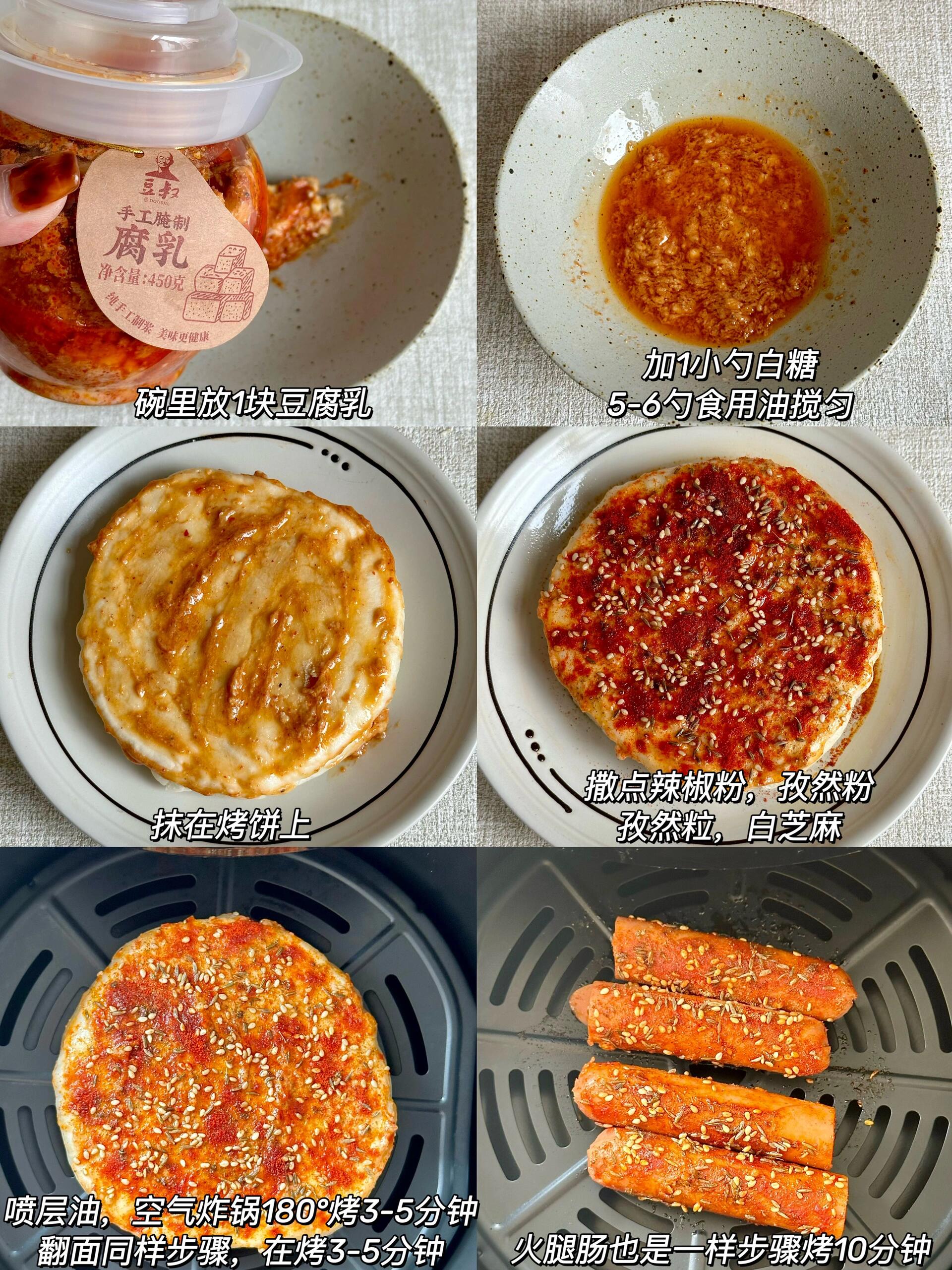 宝子们一定要像我这样做,超级简单! 做法: 1块豆腐乳,加1小勺白糖,4-6勺食用油搅匀,刷在烤饼上,撒点孜然粉,孜然粒,辣椒粉,白芝麻,喷层油,空气炸锅180°烤3-5分钟,翻面同样的步骤,再烤3-5分钟! 火腿肠刷上酱,同样的步骤,每面各烤8-10分钟!