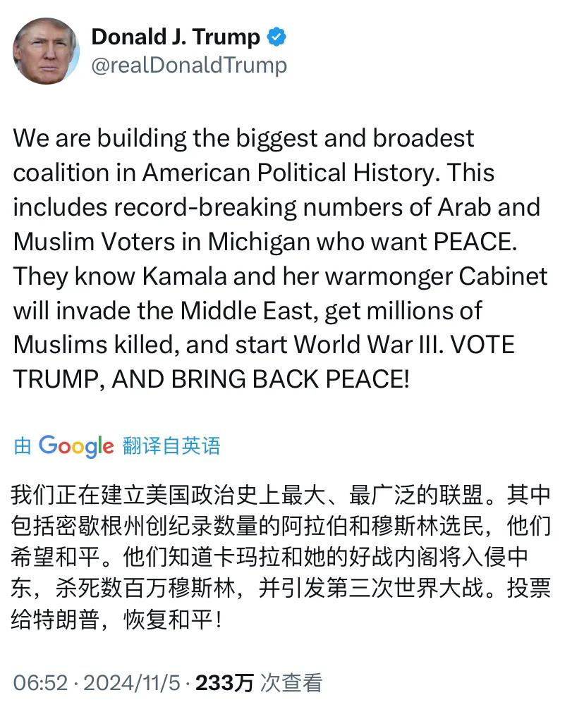 特朗普今天(北京时间11月5日)写道:“我们正在建立美国政治史上最大、最广泛的联盟。其中包括密歇根州创纪录数量的阿拉伯和穆斯林选民,他们希望和平。他们知道卡玛拉和她的好战内阁将入侵中东,杀死数百万穆斯林,并引发第三次世界大战。投票给特朗普,恢复和平!” [机智]评几句:拜登-哈里斯政府错误的中东政策,以及对以色列内塔尼亚胡政府的严重偏袒,遭致美国阿拉伯和穆斯林选民的严重不满,此前美国各地(尤其是大学校园)曾爆发激烈的反以游行示威。特朗普在投票日前夜也是进一步造势,批评拜登-哈里斯政府,争取阿拉伯和穆斯林选民的支持。明天就会出结果,看效果如何。