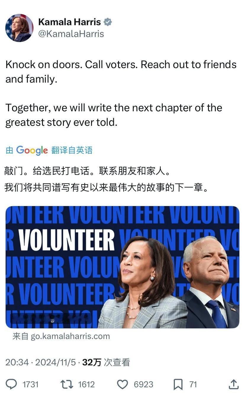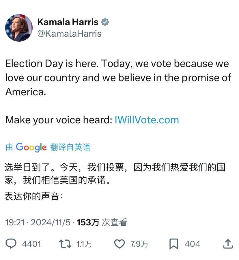 正式进入到投票日,👴特朗普刚刚(北京时间11月5日22:39)写道:“现在正式进入选举日!这将是美国历史上最重要的一天。选民热情高涨,因为人们希望美国再次伟大。……我们将共同取得巨大的胜利,让美国再次伟大!” 👵哈里斯则强调:“选举日到了。今天,我们投票,因为我们热爱我们的国家,我们相信美国的承诺。”“敲门。给选民打电话。联系朋友和家人。我们将共同谱写有史以来最伟大的故事的下一章。”