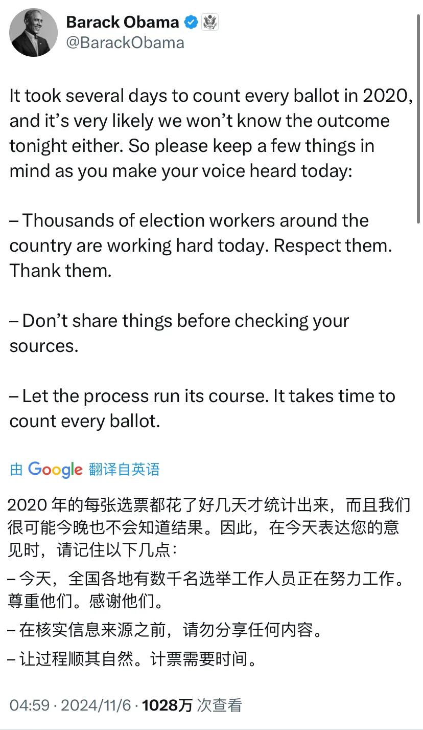 #美国大选最新信息# 美国前总统奥巴马今天(北京时间11月6日)写道:“2020 年的每张选票都花了好几天才统计出来,而且我们很可能今晚也不会知道结果。因此,在今天表达您的意见时,请记住以下几点: – 今天,全国各地有数千名选举工作人员正在努力工作。尊重他们。感谢他们。 – 在核实信息来源之前,请勿分享任何内容。 – 让过程顺其自然。计票需要时间。” [机智]补充几句:2020年美国大选是4天后才出的结果。2024年美国大选也存在几天后出结果的可能性。几个关键的摇摆州,好多天不出结果也是有可能。针对奥巴马这条帖文,特朗普支持者表示:“当人们试图窃取选举结果时,他们会说这样的话。第三世界国家一夜之间就完成了选票统计。拖延几天的唯一理由就是为了作弊。”
