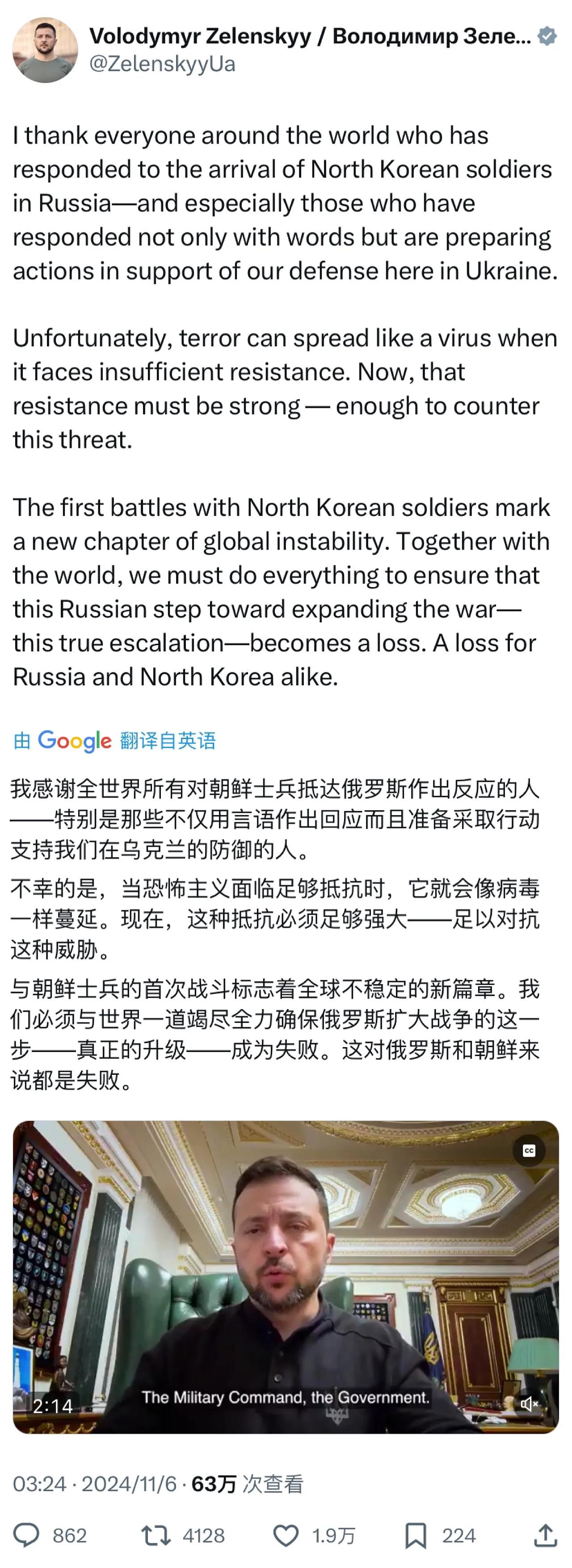 乌克兰总统泽连斯基今天(北京时间11月6日)写道:“我感谢全世界所有对朝鲜士兵抵达俄罗斯作出反应的人——特别是那些不仅用言语作出回应而且准备采取行动支持我们在乌克兰的防御的人。……与朝鲜士兵的首次战斗标志着全球不稳定的新篇章……”(全文见附图) [机智]评几句:泽连斯基现在最担心的可能不是朝鲜的军队,而是美国的大选。如果特朗普上台并且兑现竞选承诺,最受伤的莫过于泽连斯基了,这意味着俄乌停战不得不开始谈了。特朗普刚刚拿下了北卡,不过决定输赢的还是威斯康星、宾西法尼亚和密歇根。看最后的结果吧!