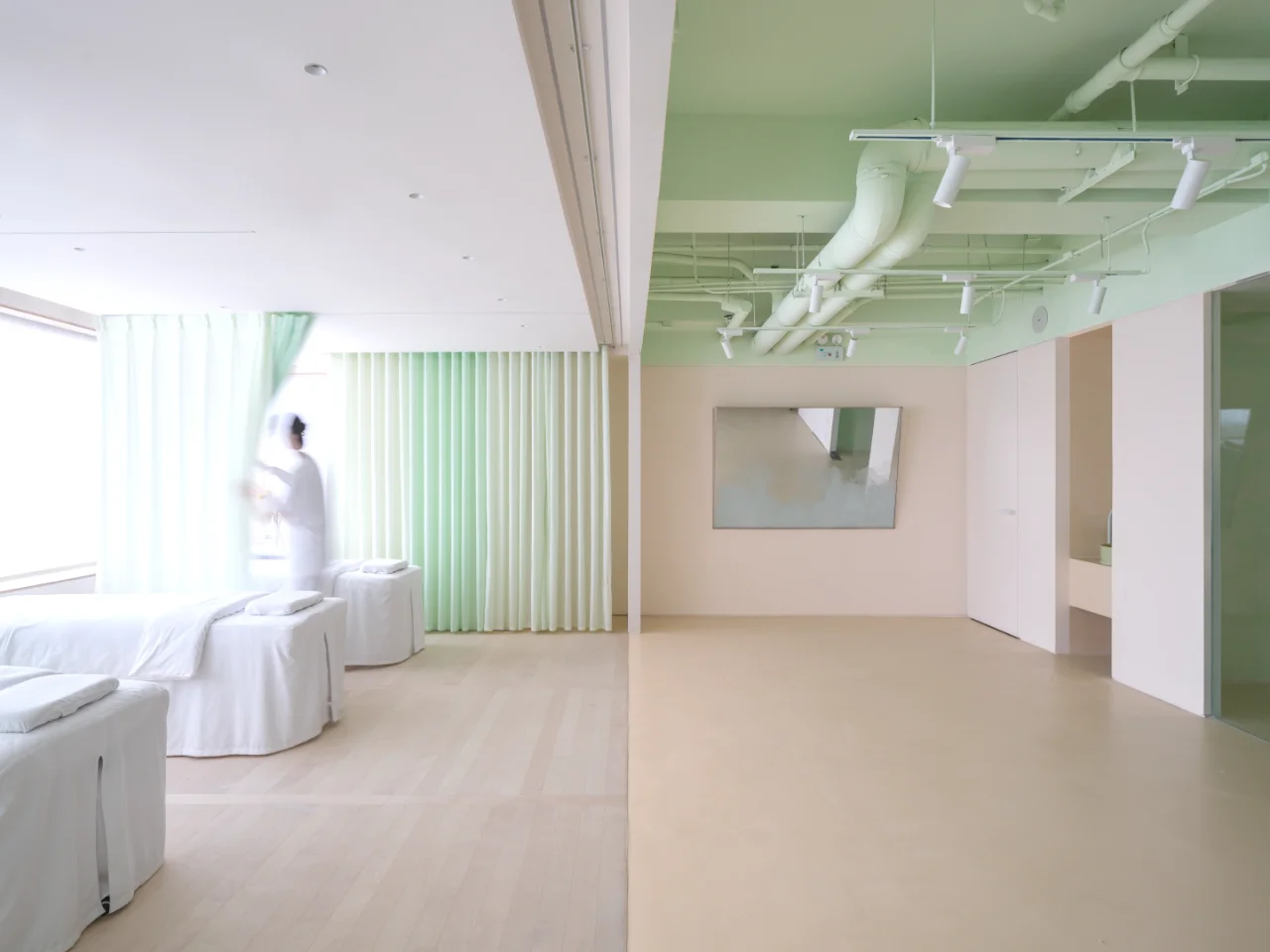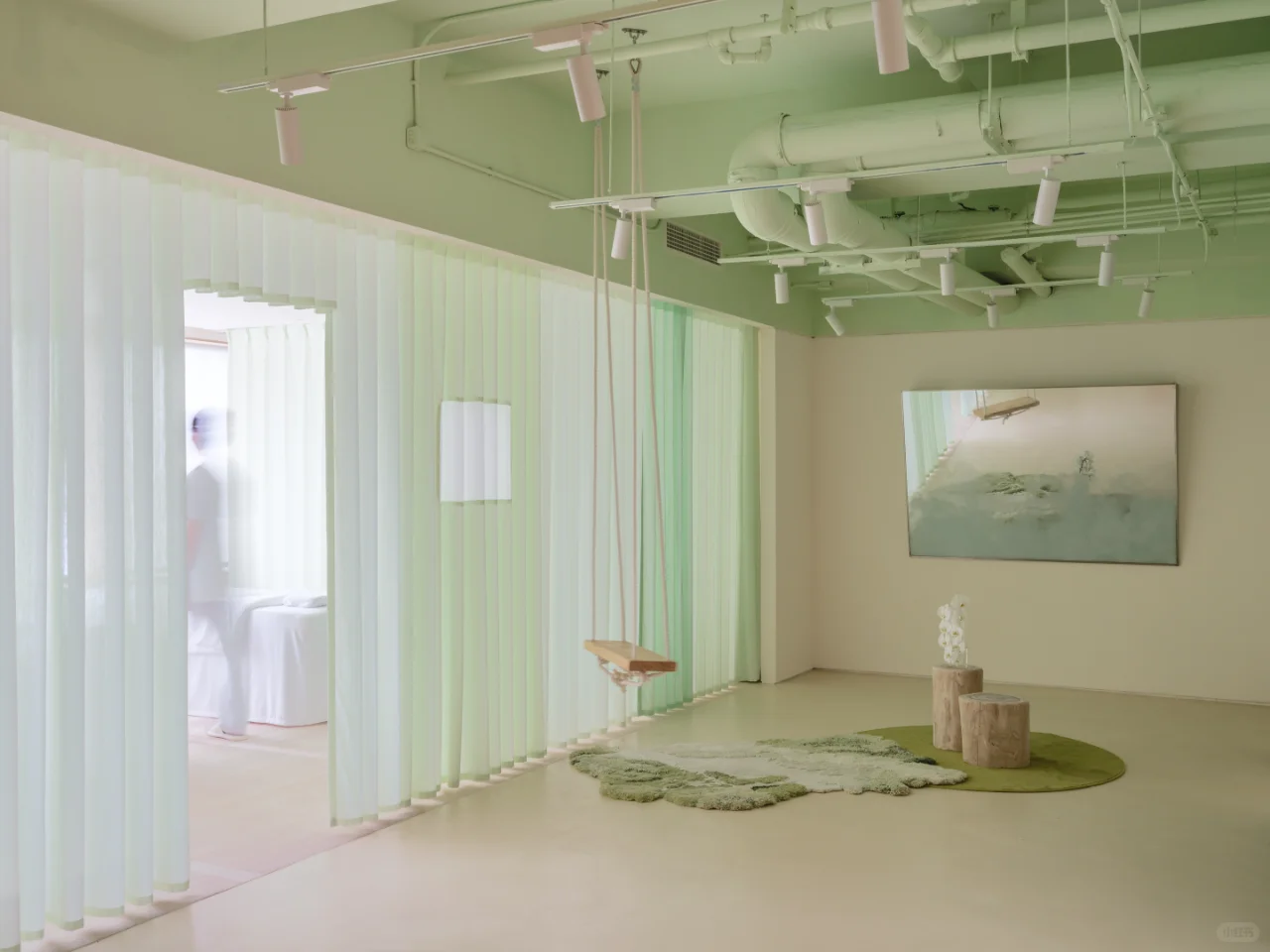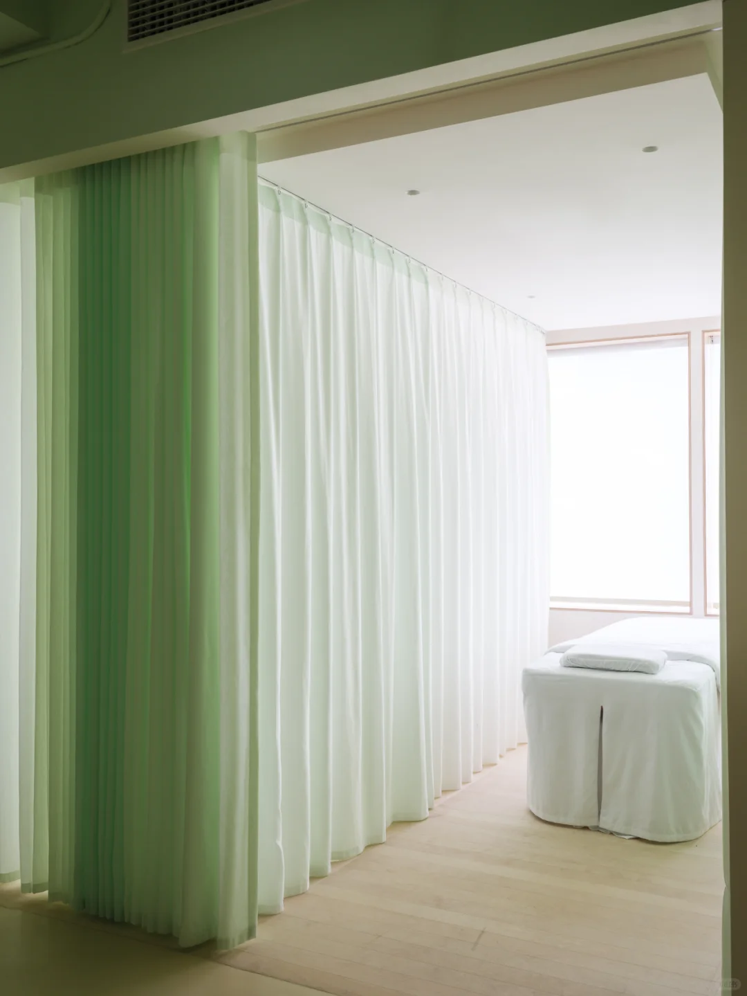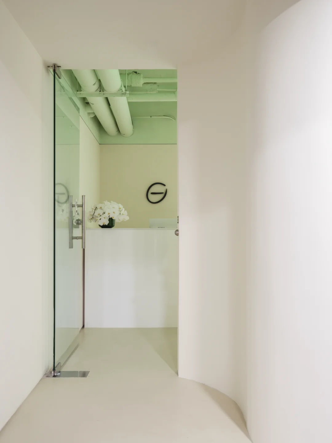 本次项目位于上海新天地繁华的商业区。设计打破了传统美业空间一味追求的标准化和华丽繁复,营造出兼具“诊疗室的专业性”和“美学生活馆的舒适性”的空间氛围。以清新的薄荷绿奠定基调,传递出品牌自身主打的洁净护肤理念。