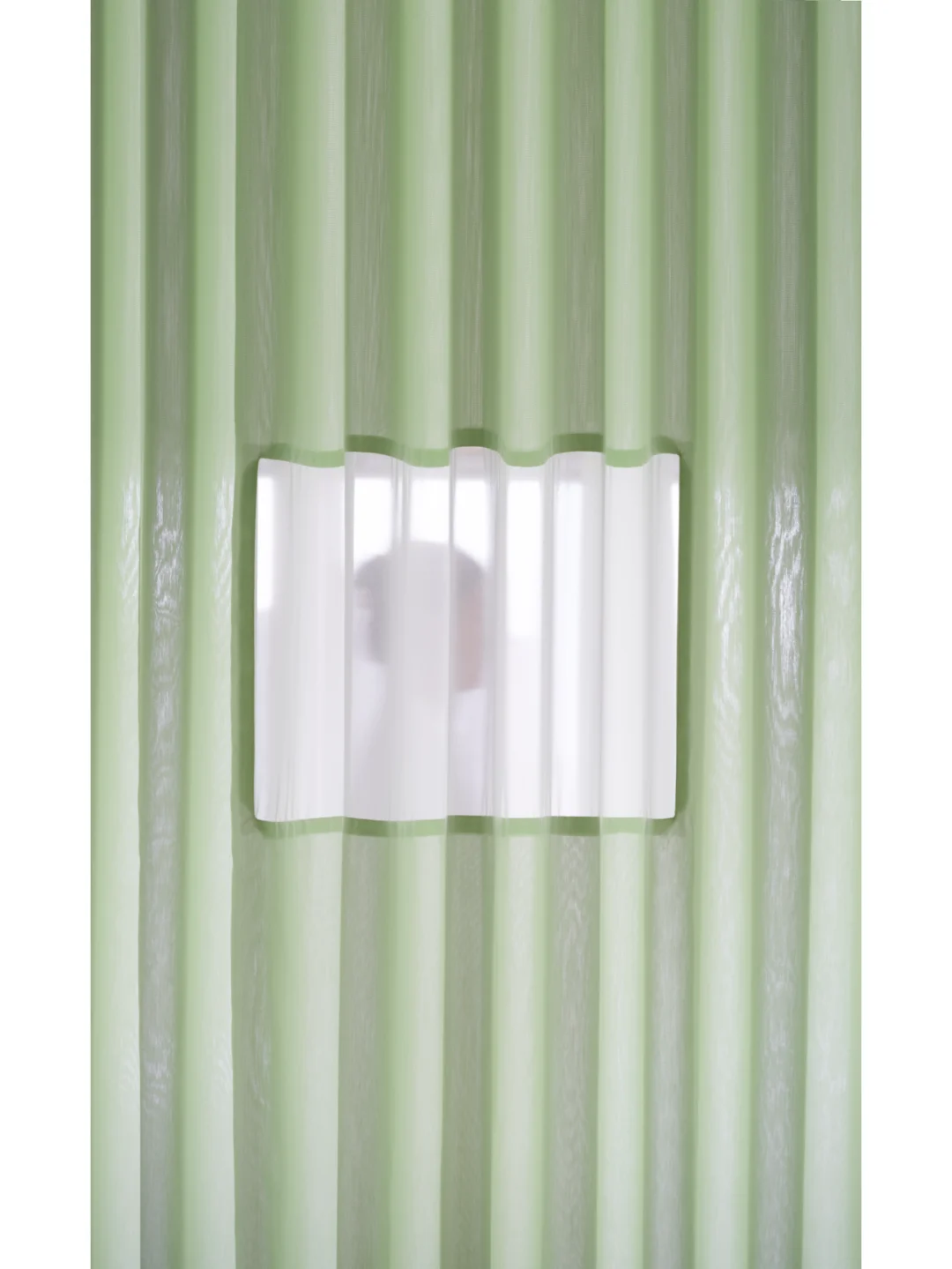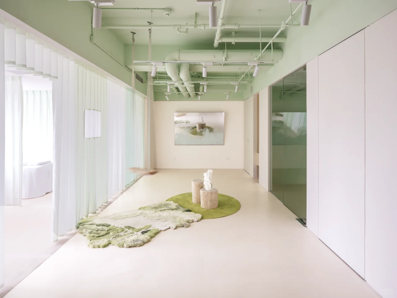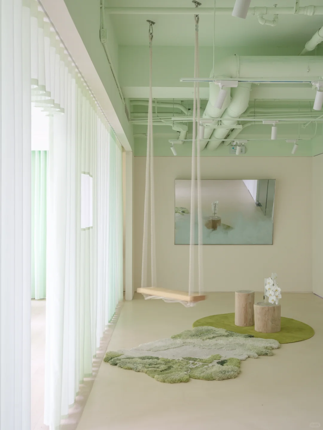 设计灵感源自莫奈的《睡莲》。经过对画作的解构、比例调整与重组,创作成为一张新的图画。纯净而富有层次感的薄荷绿色帘子隔断,与睡莲里明暗连接的绿色和水波纹;等待区的苔藓地毯和圆形绿色地毯,与画面中的荷叶群组异曲同工。