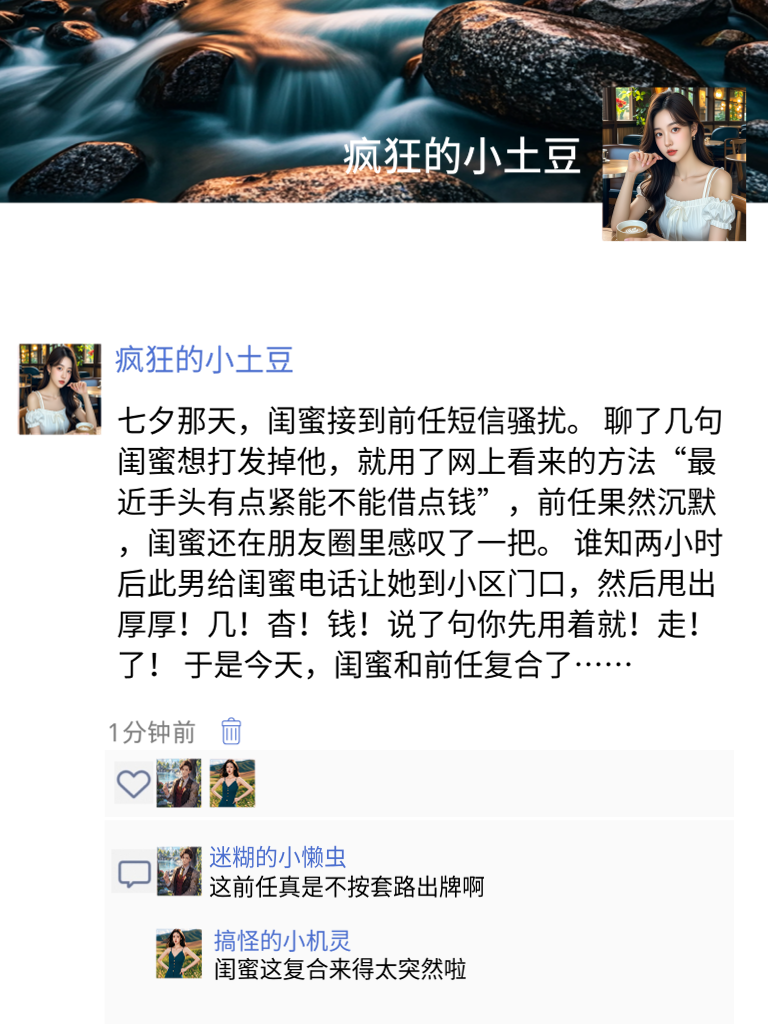 亲眼看着自己老婆在公园跟别的男人搂搂抱抱,那哥们儿没冲上去。就拍了张照片,发过