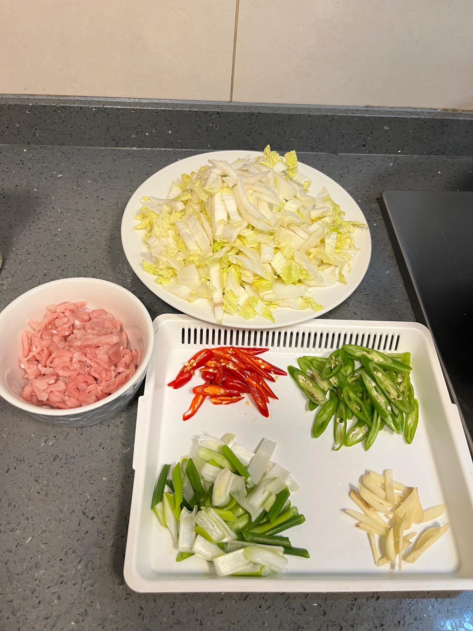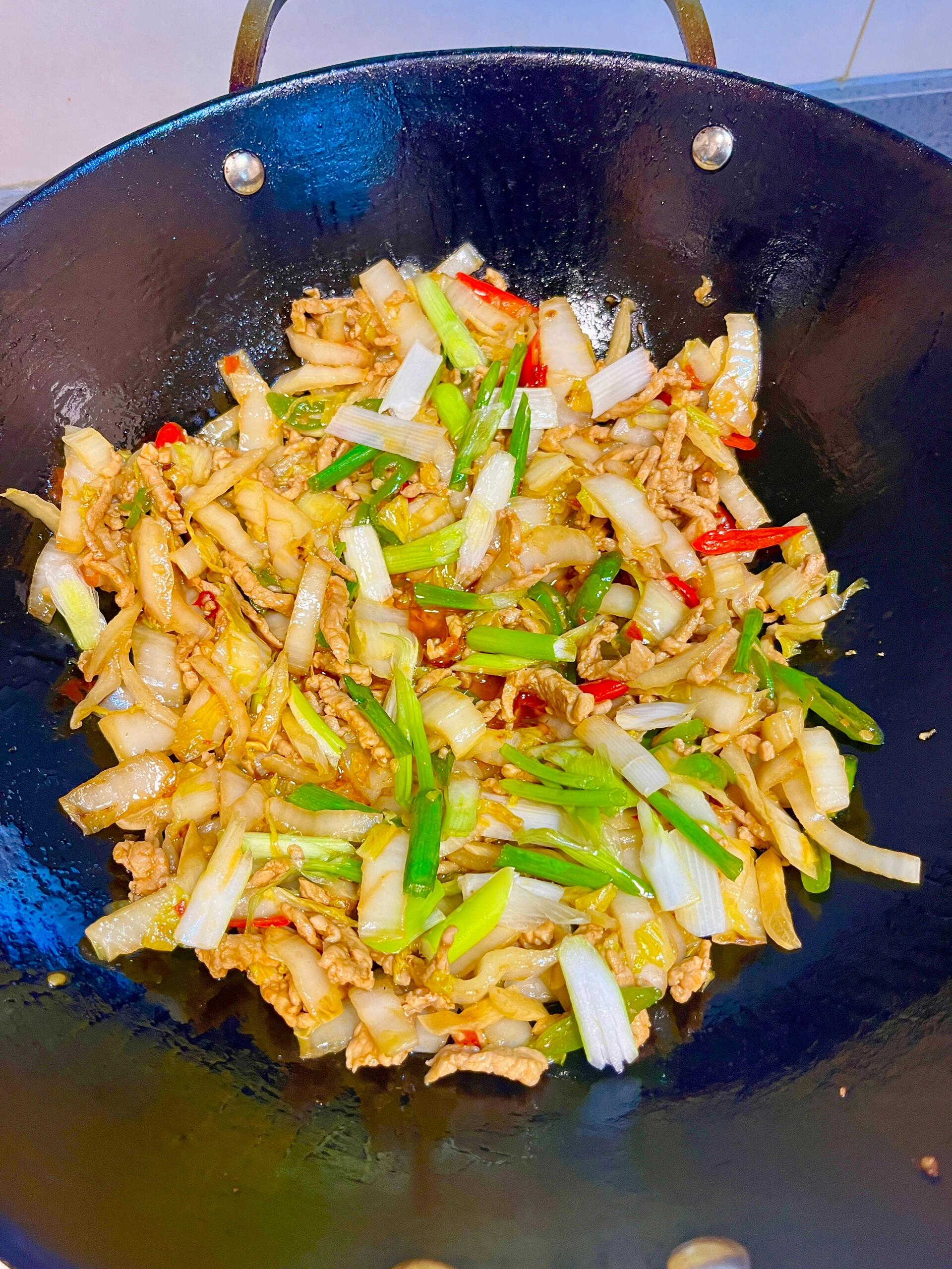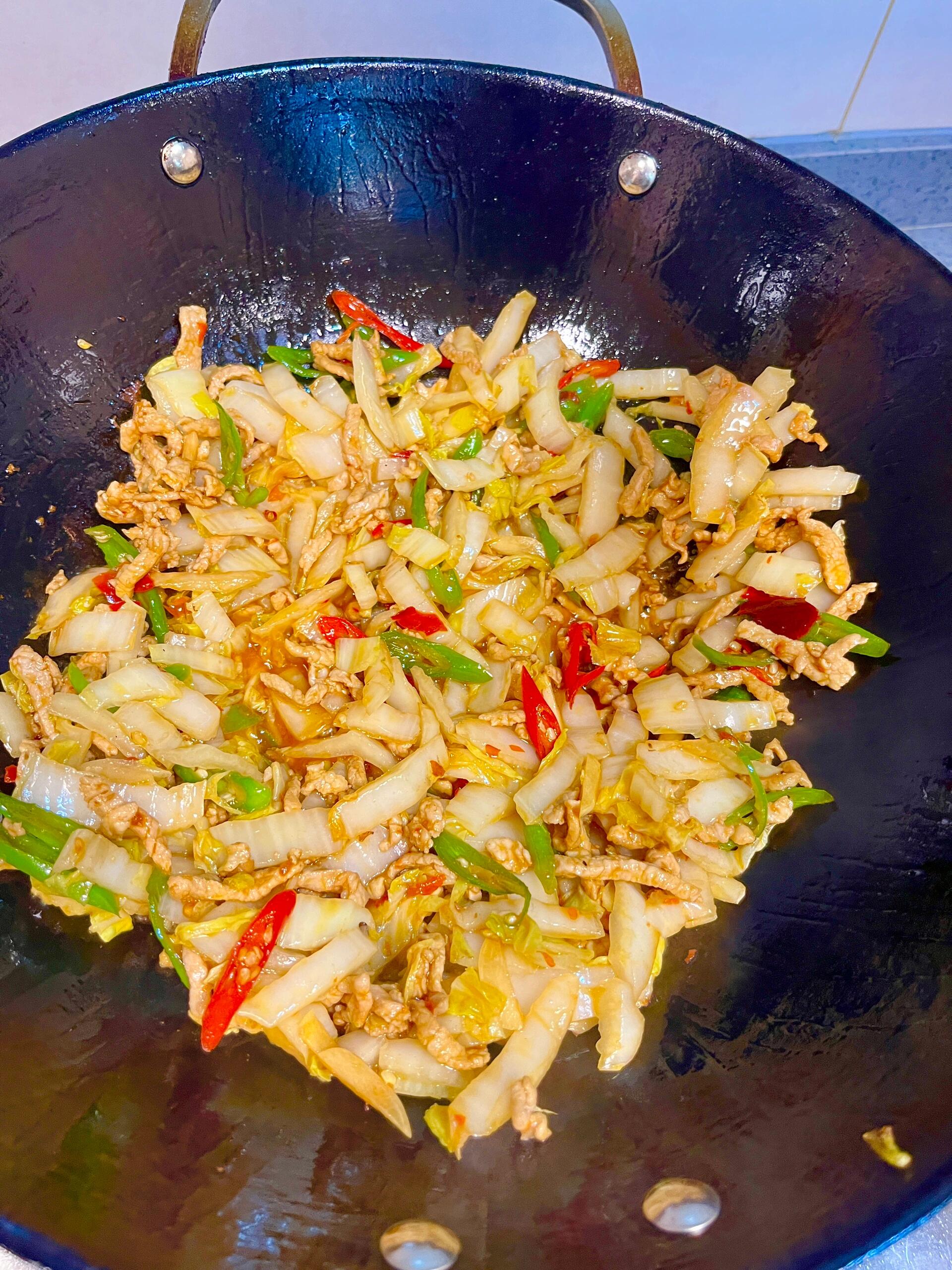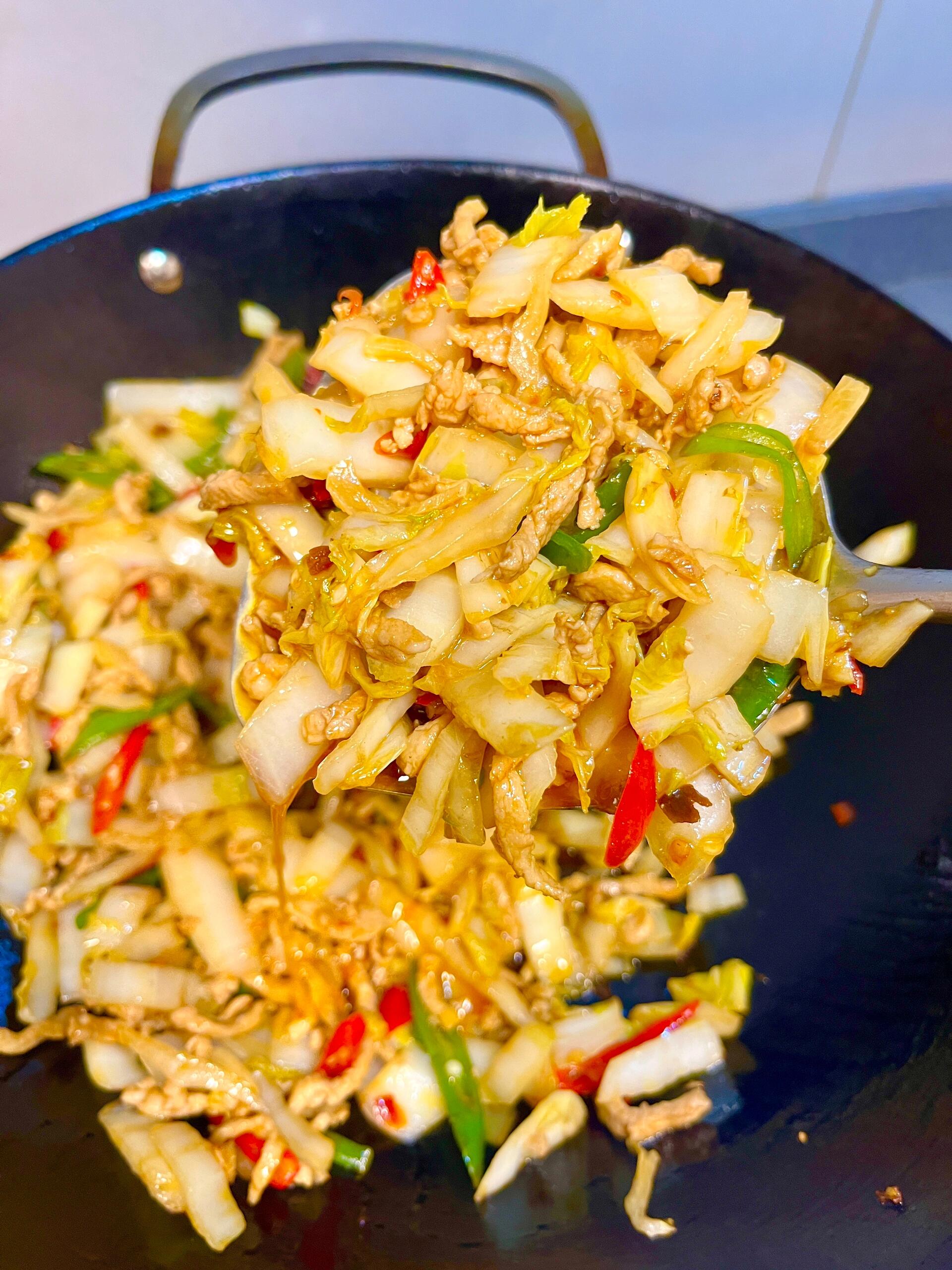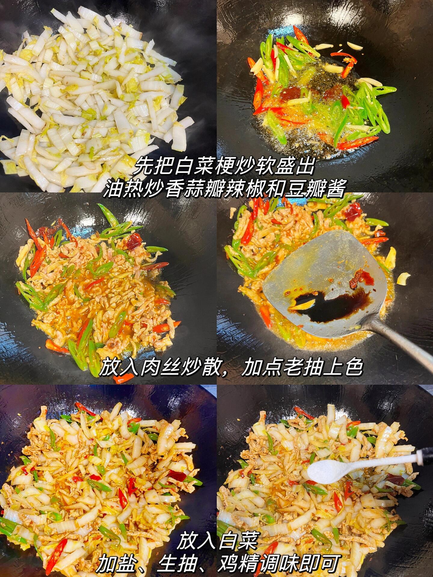 这个菜真的超级下饭!简单又美味的家常菜,超爱啊 做法: 1、先把白菜梗炒软盛出 2、热油炒香蒜瓣、辣椒、豆瓣酱,放入肉丝滑散,加点老抽上色 3、倒入白菜梗,加盐、生抽、鸡精调味即可