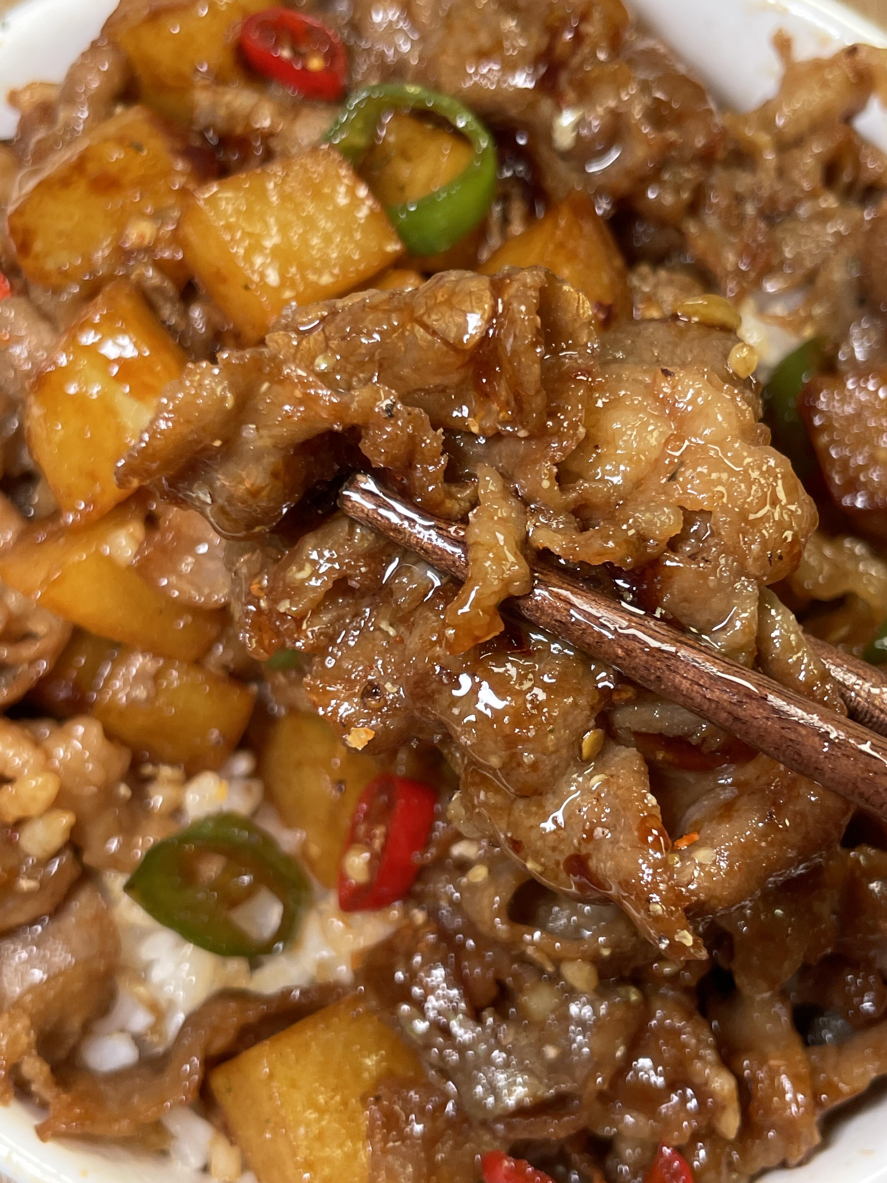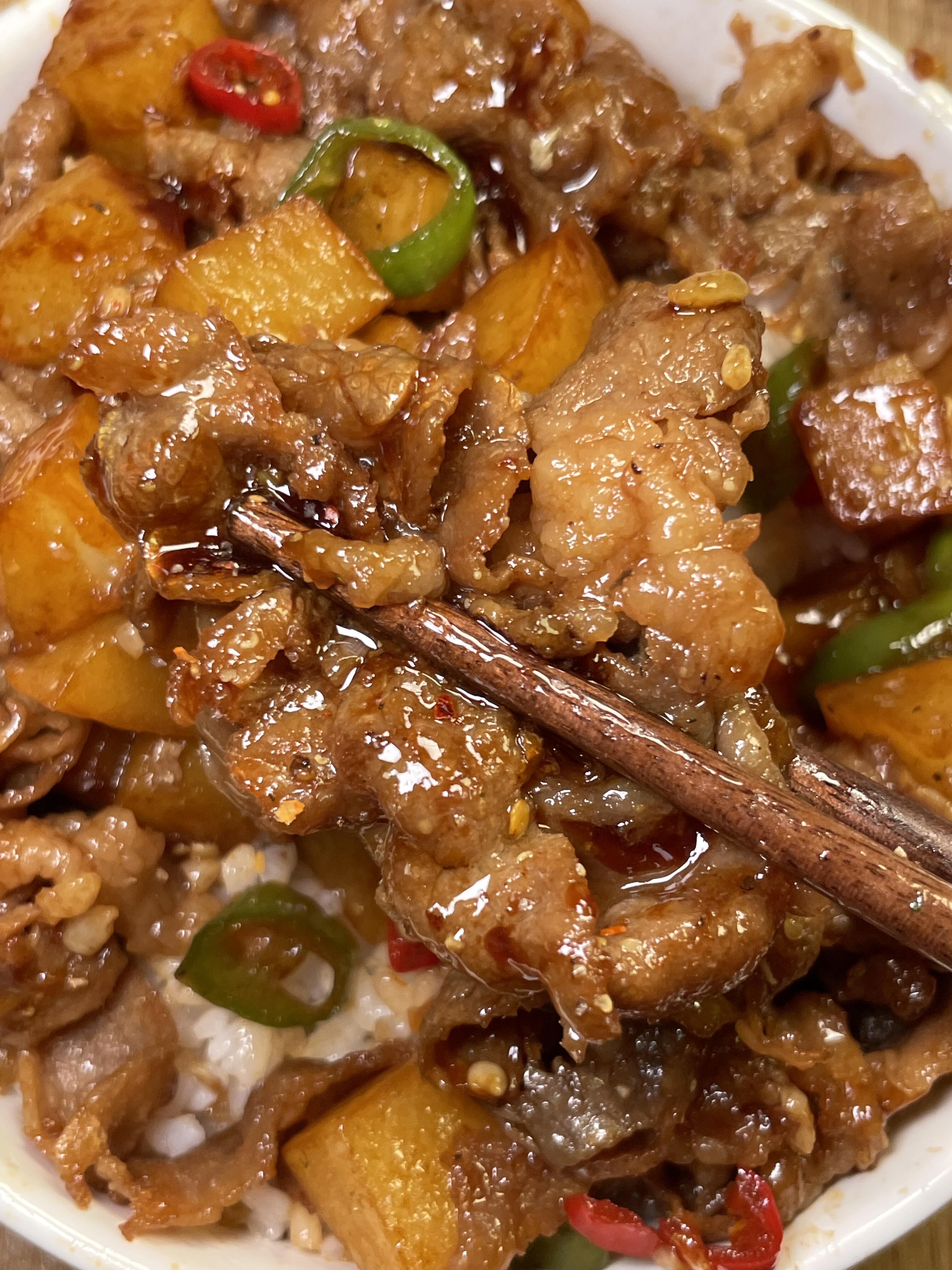 今天简单给自己做一份肥牛土豆饭,简单快手,拌米饭是真香呀!忍不住多吃了一碗饭,喜欢的姐妹别错了! 肥牛土豆饭食材:土豆、肥牛、青红椒 肥牛土豆饭做法在图上,大家跟着做就可以啦 调酱汁:一勺生抽➕一勺料酒➕一勺蚝油➕一勺老抽➕半勺糖➕适量黑胡椒搅拌均匀 盛好一碗米饭,盖上做好的肥牛土豆,来吃咯!