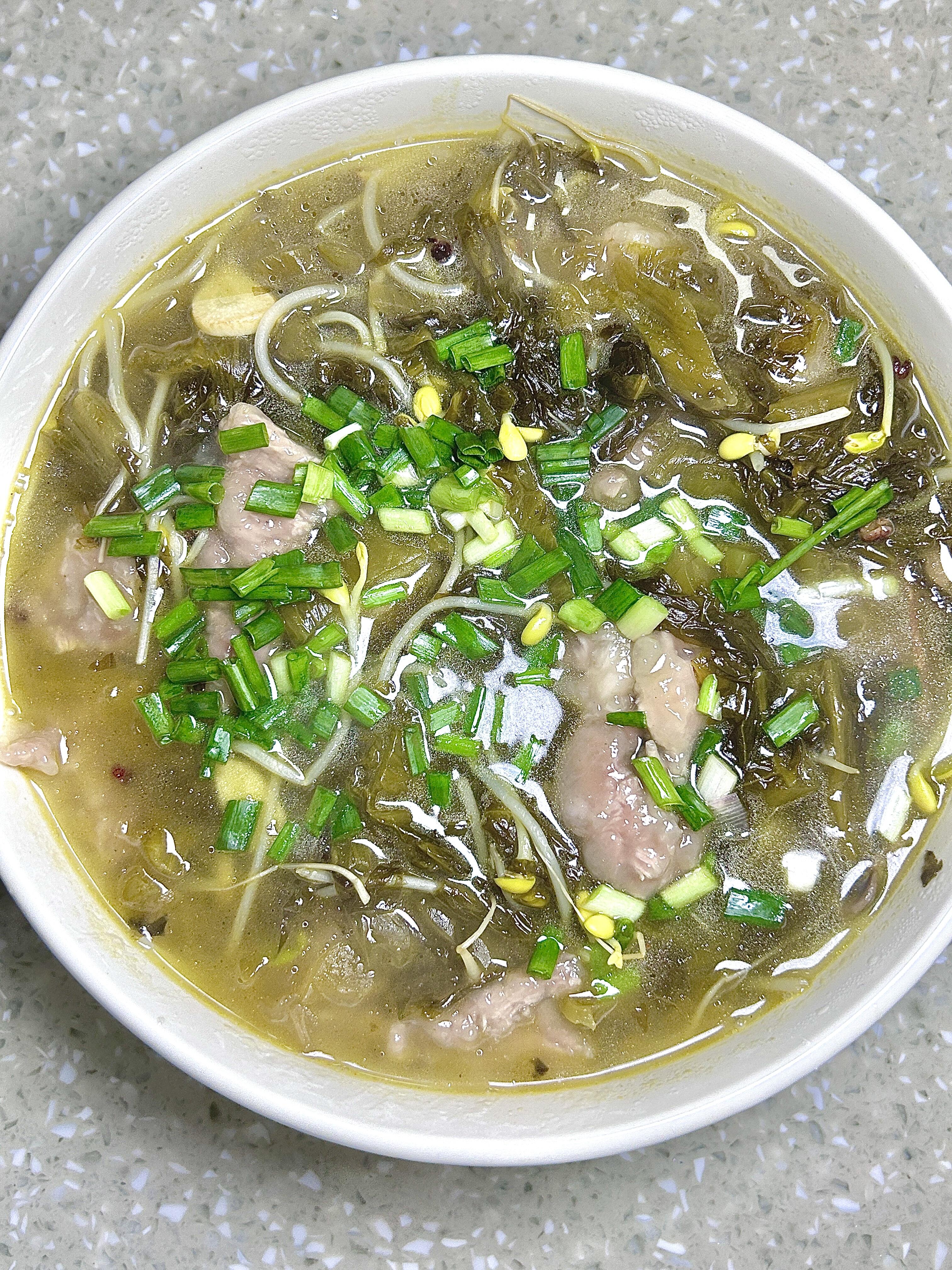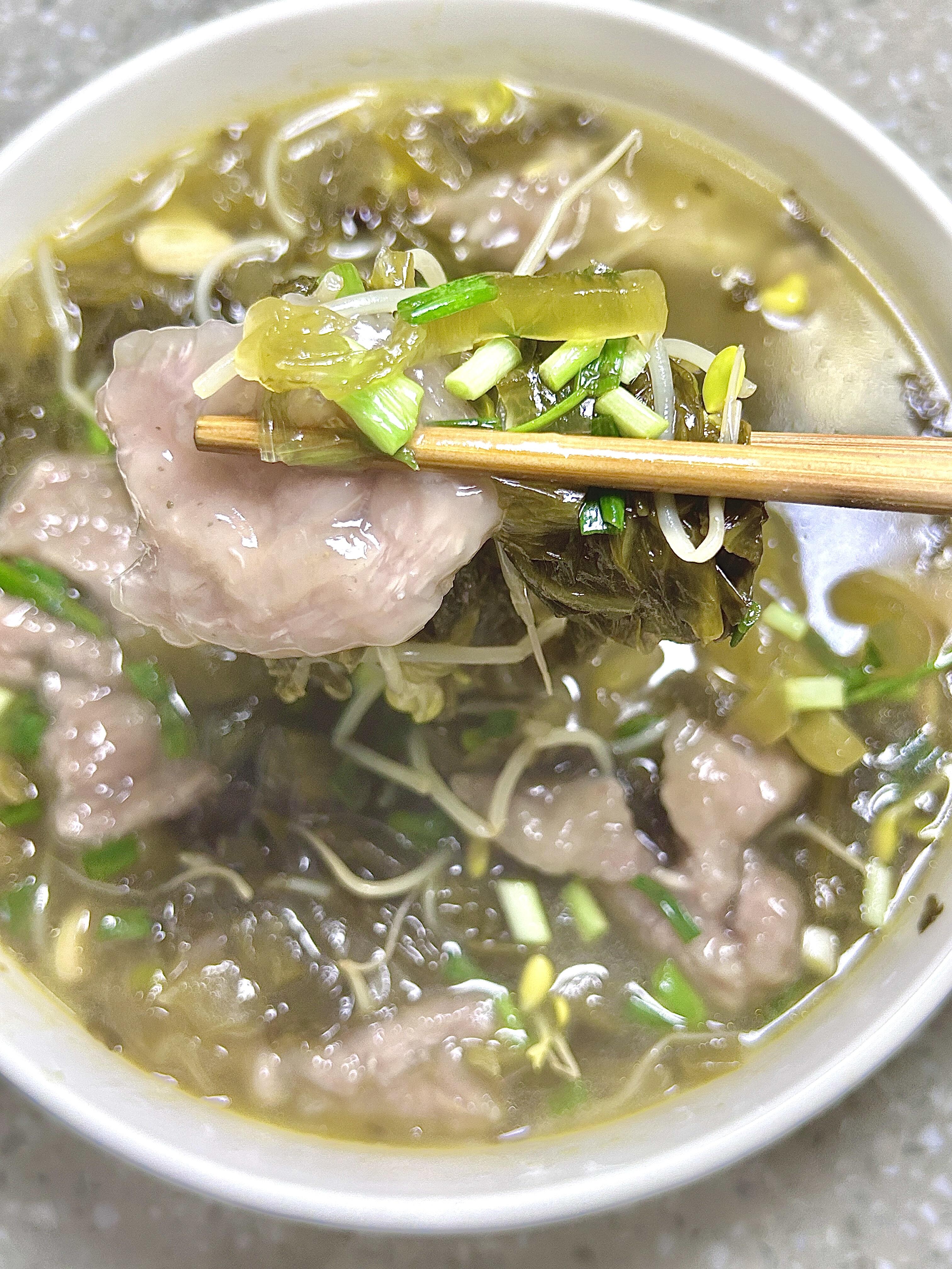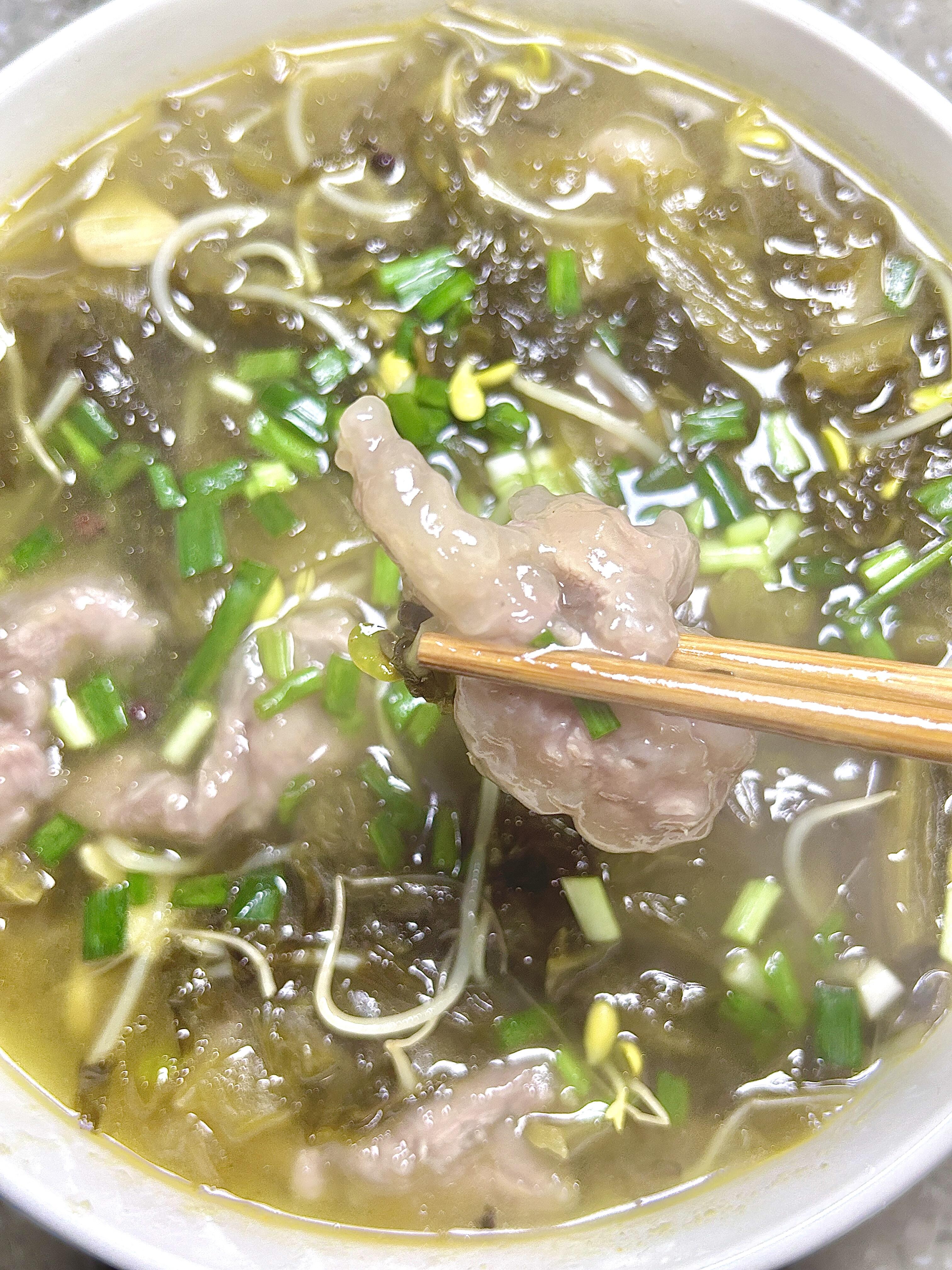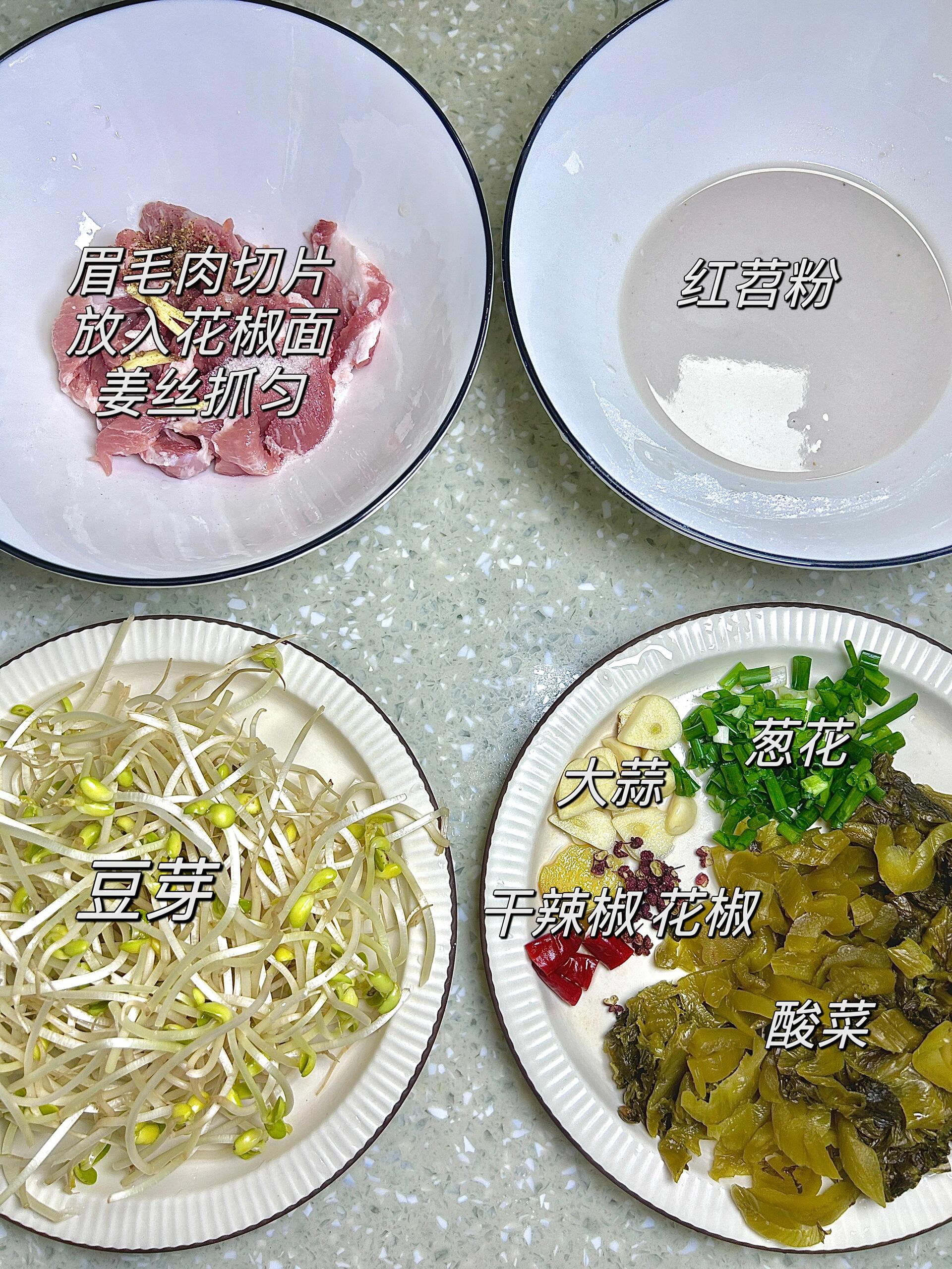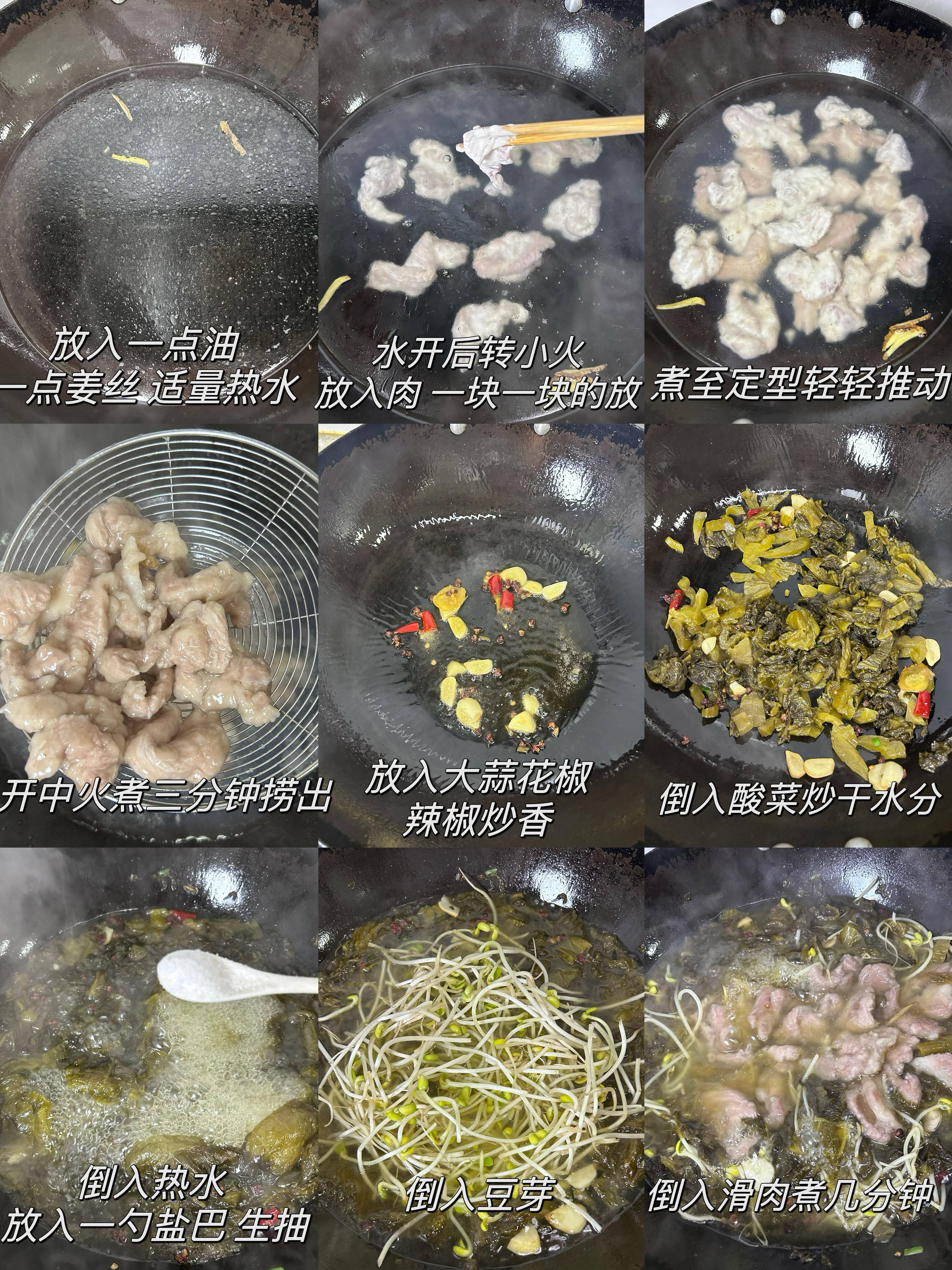 想告诉全世界,这玩意儿真的太太太好吃了! 味道鲜美,滑肉Q弹爽滑,喜欢的赶紧试试吧! 食材准备:眉毛肉、葱蒜、酸菜、辣椒、黄豆芽、花椒 做法: 1⃣️眉毛肉洗净切片,放入花椒面、姜抓匀, 腌制20分钟 2⃣️红薯粉捏碎,然后少量多次的倒入温水调成很粘稠的糊状,然后把肉倒入里面拌匀均匀的裹上淀粉,肉和红薯粉的比例是1:1 3⃣️锅里油热倒入适量水,放入姜丝煮开,开转小火放入肉(一块一块放入),煮至定型轻轻推动,然后开中火煮熟后捞出 4⃣️另外起锅 ,油热放入蒜花椒辣椒炒香,倒入酸菜炒干水分,加入适量热水烧开,加入一勺盐巴一勺生抽,倒入豆芽、滑肉煮3分钟,最后撒上葱花即可。