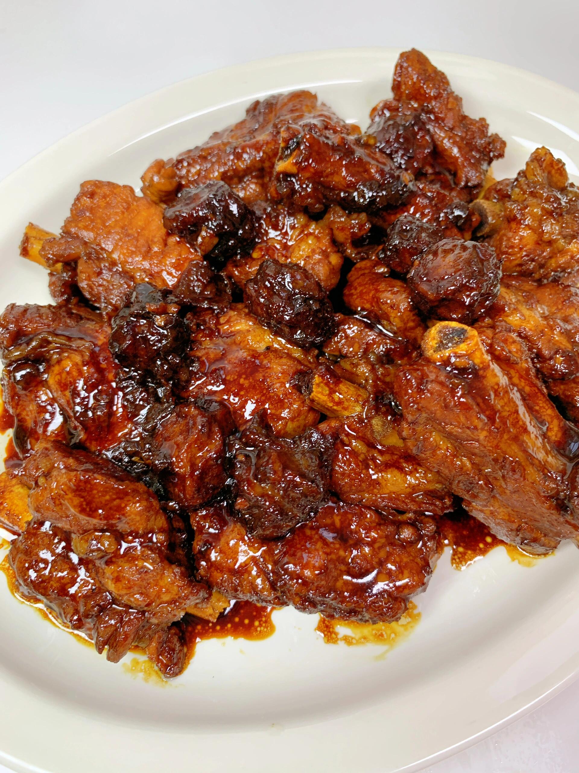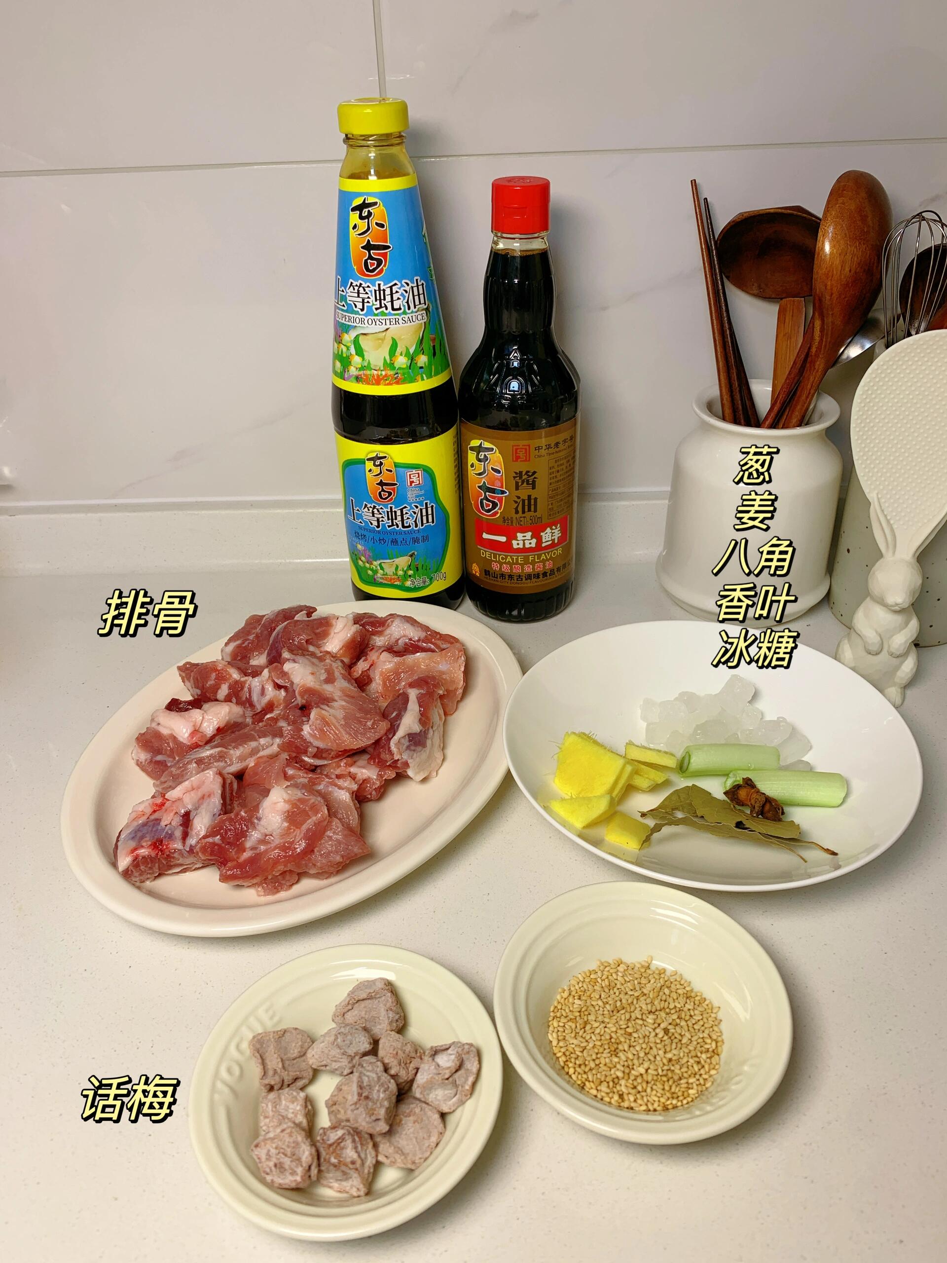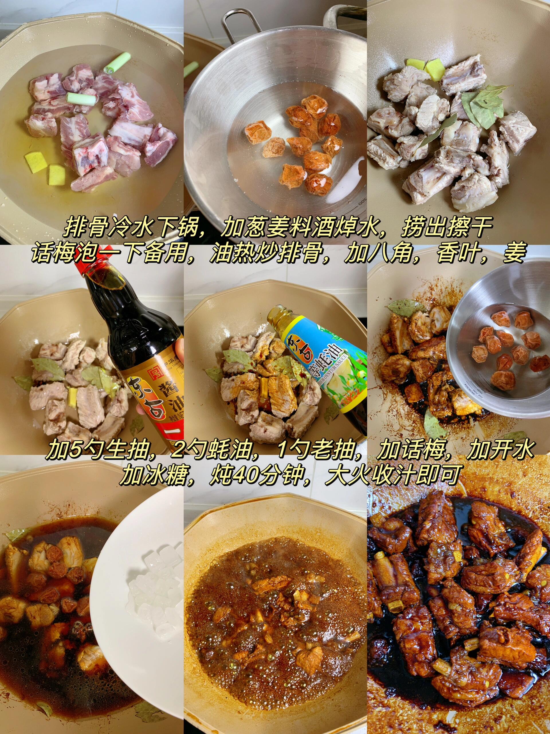 巨巨好吃的话梅排骨!酸甜入味,清爽不腻,一口惊艳,好吃到停不下来 做法简单,喜欢的姐妹收藏试试吧! 食材:排骨,话梅,葱,姜,八角,香叶,冰糖 做法: 1. 排骨冷水下锅,加葱姜料酒焯水,捞出温水洗净,擦干备用,话梅泡水备用 2. 油热炒排骨,加姜,八角,香叶翻炒,加5勺生抽,2勺蚝油,1勺老抽,加开水没过排骨,加冰糖,小火炖40分钟,大火收汁即可