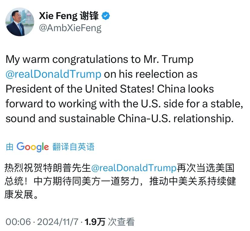 中国驻美大使谢锋今天(北京时间11月7日)写道:“热烈祝贺特朗普先生再次当选美国总统!中方期待同美方一道努力,推动中美关系持续健康发展。” [机智]评几句:合则两利,斗则俱伤。中美关系作为全世界最重要的双边关系,对中美两国乃至全世界影响深远、意义重大。无论是拜登和哈里斯,还是特朗普,都会遏制中国的发展,没有太大差别,但行事风格存在差异。如果特朗普兑现竞选承诺,将导致中美关系面临冲击,但是只要我们团结一心,就不害怕任何挑战。