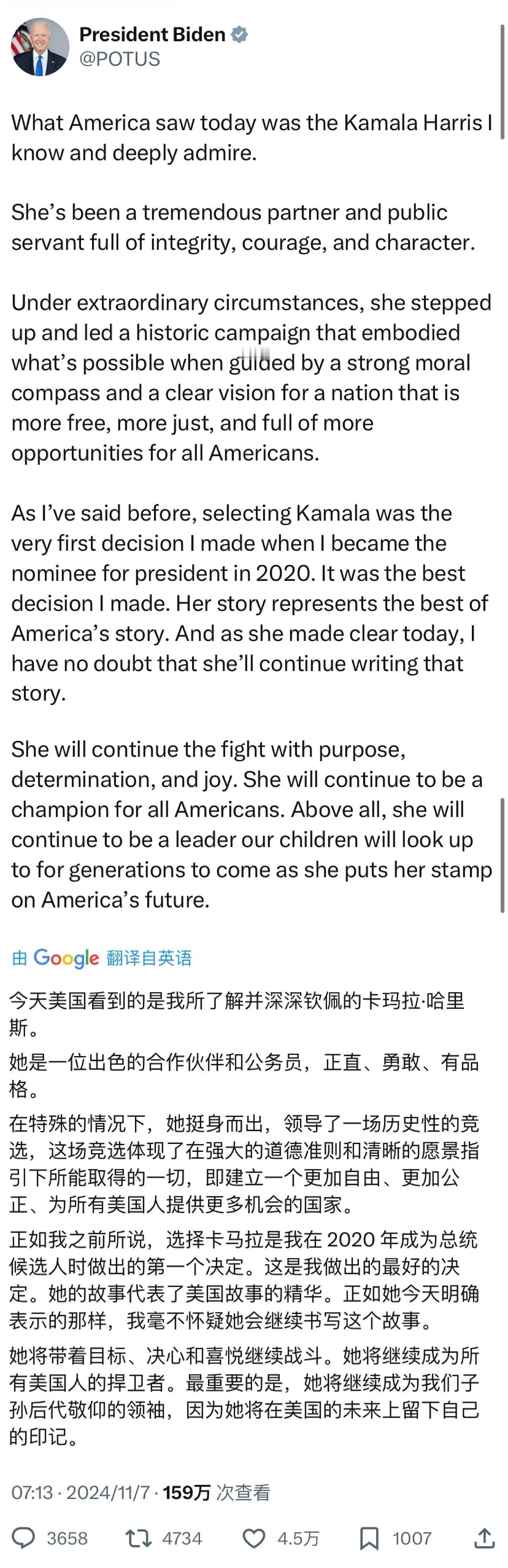 美国总统拜登刚刚(北京时间11月7日7:13)写道:“今天美国看到的是我所了解并深深钦佩的卡玛拉·哈里斯。她是一位出色的合作伙伴和公务员,正直、勇敢、有品格。在特殊的情况下,她挺身而出,领导了一场历史性的竞选……”(全文见图二) [机智]评几句:拜登的内心,还是不甘的。在最后一刻,被民主党党内大佬们集体施压,将拜登这位现任总统“劝退”,让其失去了竞选连任的可能性。同时,让没有经过党内初选历练的哈里斯临危受命,可能就已经为败选埋下了伏笔。民主党丢掉总统和参众两院之后,应该会提前布局两年后的中期选举了。国会议员席位上,民主党两年后会有所突破吗?