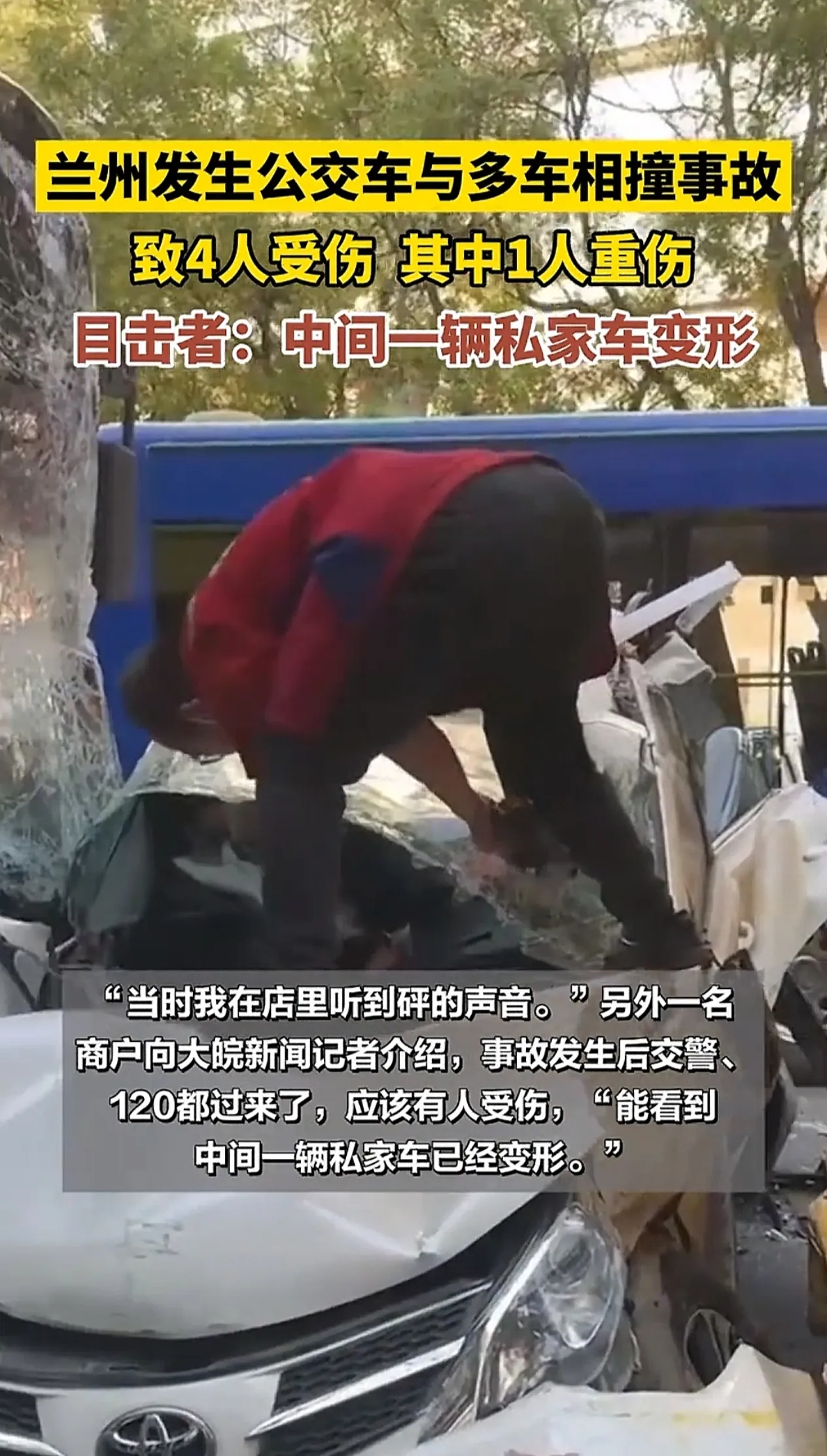 4人受伤1人重伤!11月6日甘肃兰州城关区民主西路附近,发生了一起严重的交通事故,一辆城市公交车与多辆车相撞,有一辆白色的小轿车被撞严重变形。