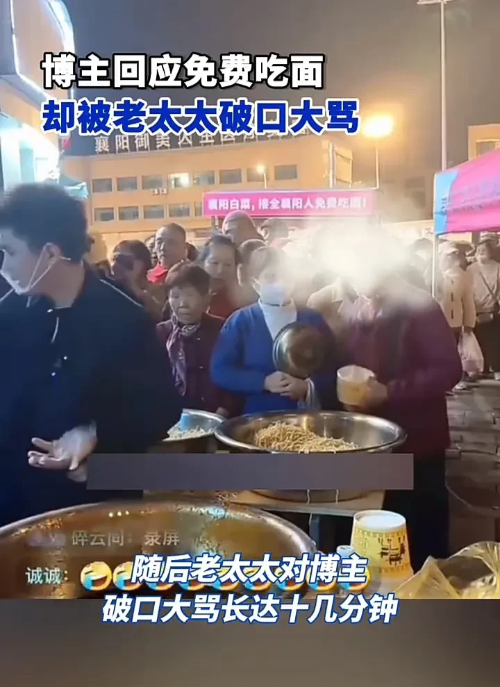 11月4日,湖北襄阳一名小伙举办免费吃面活动,事先声明要自带碗筷,但一位老人没带,遭小伙拒绝赠面后,老人开始辱骂小伙。事后小伙回应,曾发过纸碗,但他们都乱扔,现在活动取消。