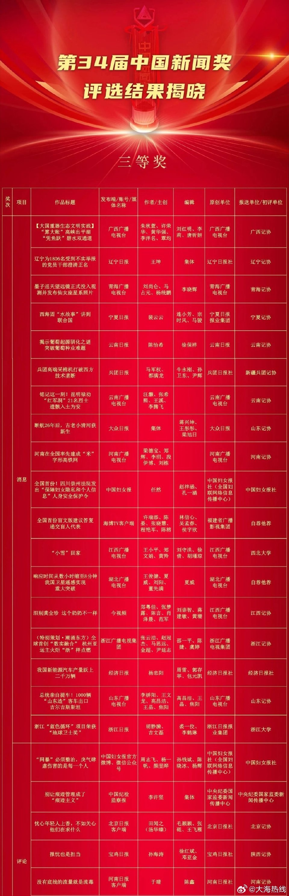 中国新闻奖,是新闻媒体中的最高大奖,大家可以看看,都哪些新闻获奖,好好学习借鉴,还有两屏见下条。