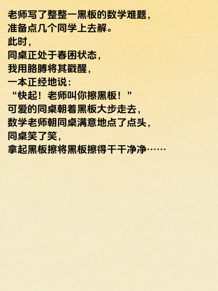 高中时的女同桌是个女汉子,没事就逗我。一次放学,她又把我堵在教室,我趁她动手之前