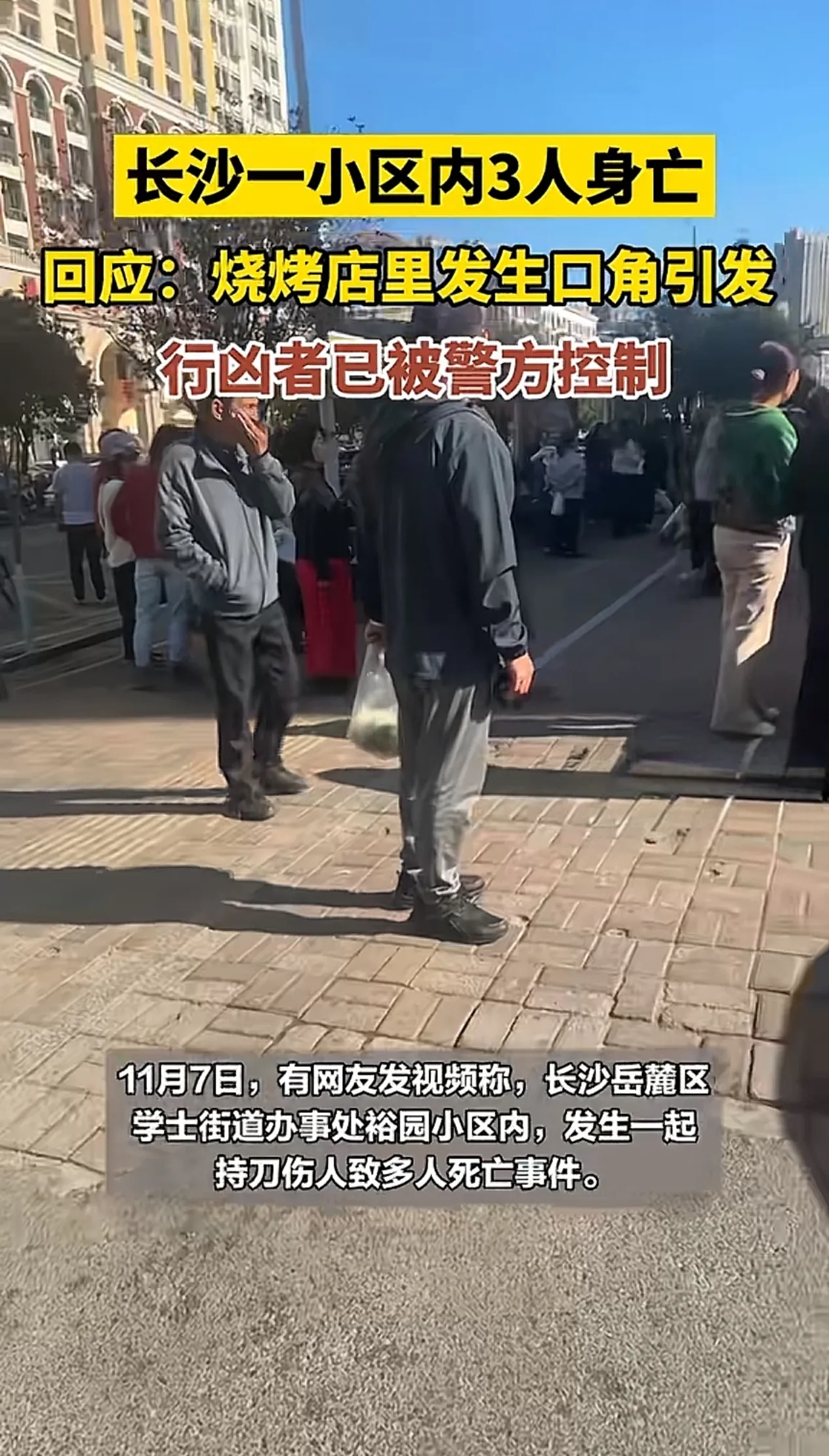 烧烤店内发生口角引发!事情发生于11月7日,位于长沙岳麓区学士街道办事处裕园小区里面,发生了一起因口角纠纷引发的。持刀伤害导致多人死亡的恶性刑事案件。
