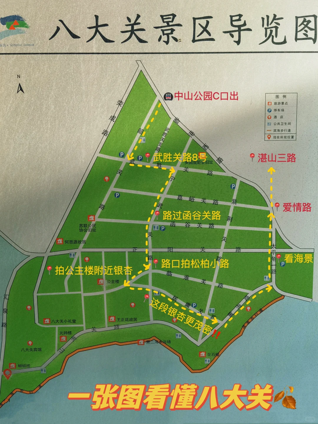 (八大关较大容易走蒙 如果中间找不到了可导航我标记📍的这几个位置即可)