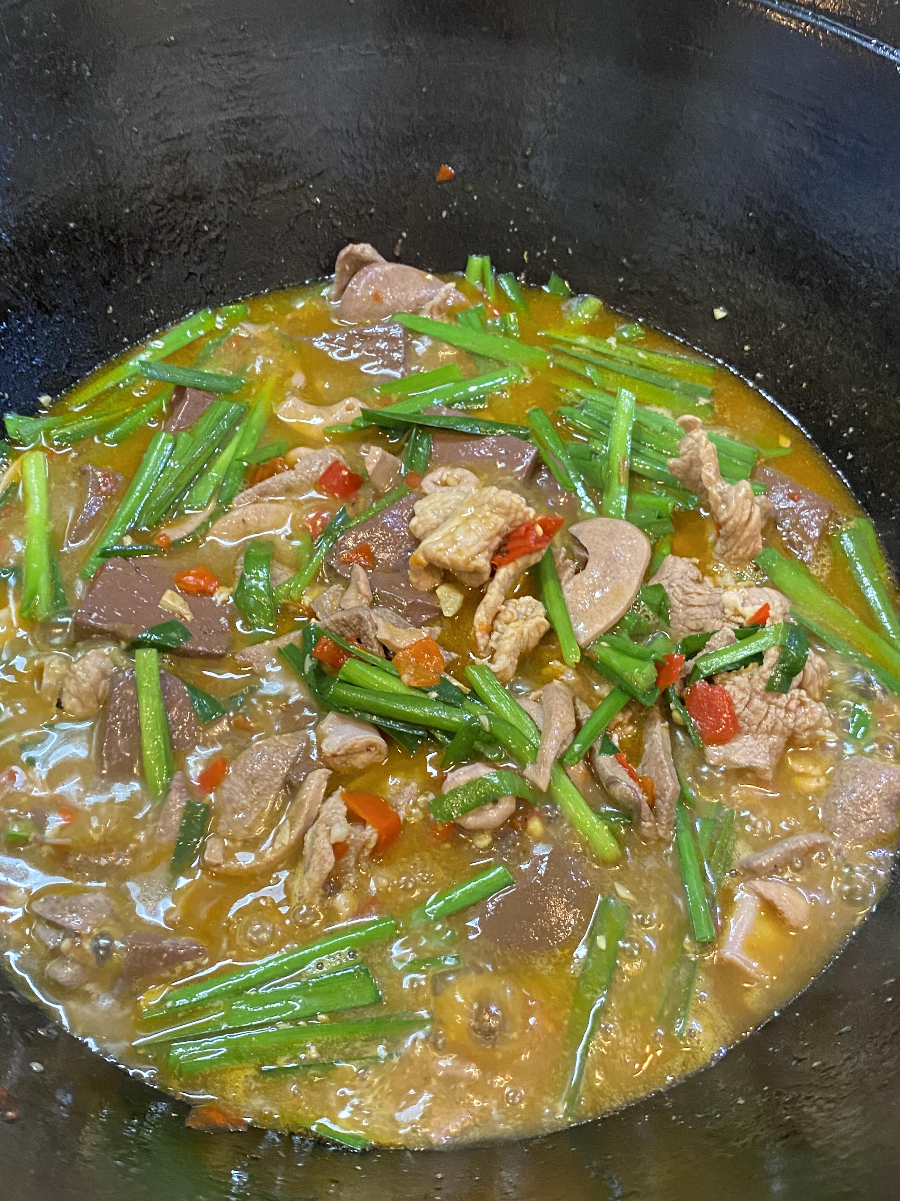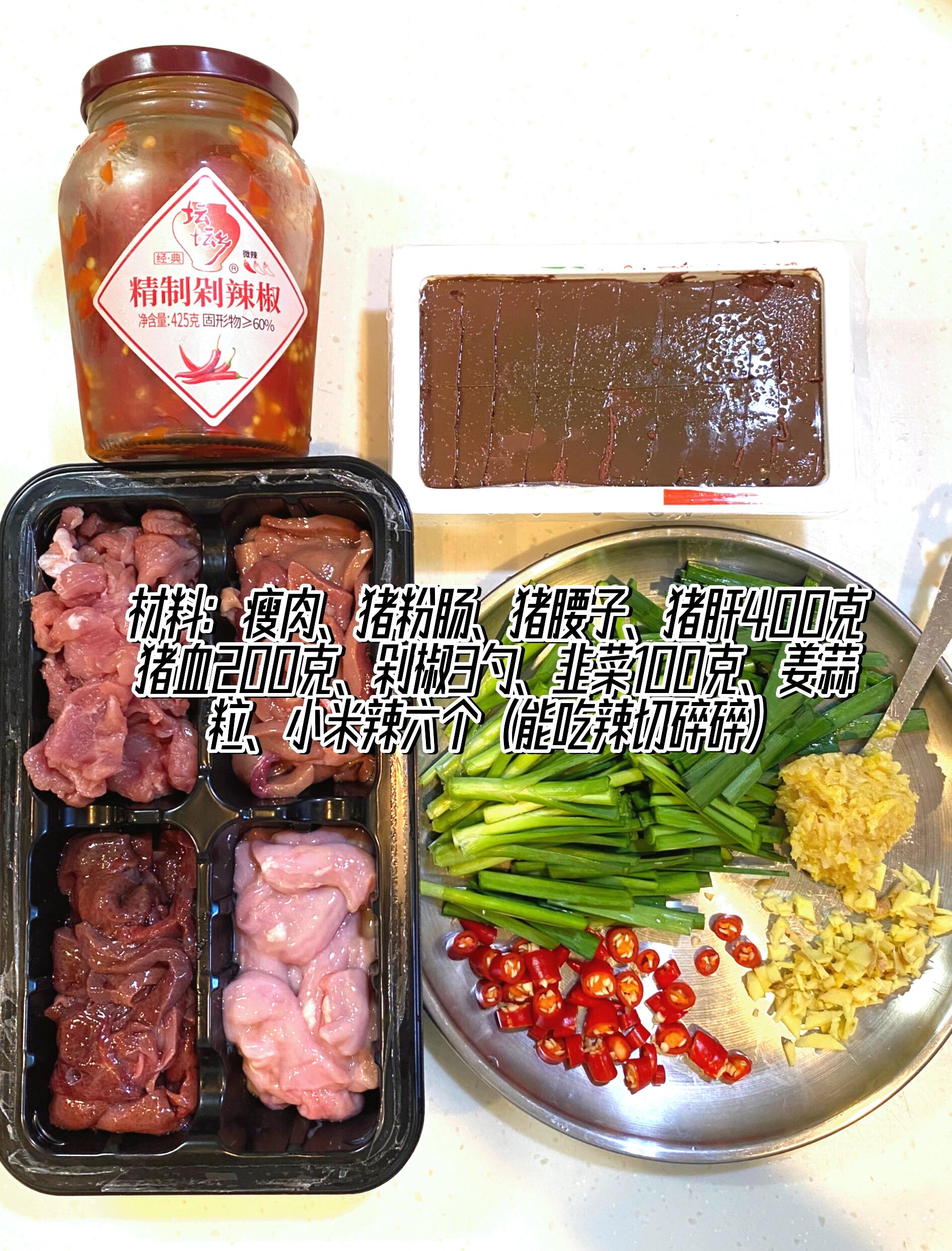 热辣辣又带点汤汁,湘版杀猪菜 汤汁拌饭你能炫几碗 材料:瘦肉、猪粉肠、猪腰子、猪肝400克、猪血200克、剁椒3勺、韭菜100克、姜蒜粒、小米辣六个(能吃辣切碎碎) 做法: 1.热锅下一大坨猪油混合多点菜籽油,下姜葱粒、3勺剁椒炒出红油。 2.下瘦肉大火炒至发白,下猪血,倒一圈米酒激发香味去腥,倒入开水。 3.水开下猪腰猪肝粉肠煮一分钟,加入两圈蚝油、两圈酱油、半勺白胡椒粉、适量味精调味。尝下味道可酌情用盐调节。 4.再加入韭菜段、小米辣碎,最后勾个芡即可!