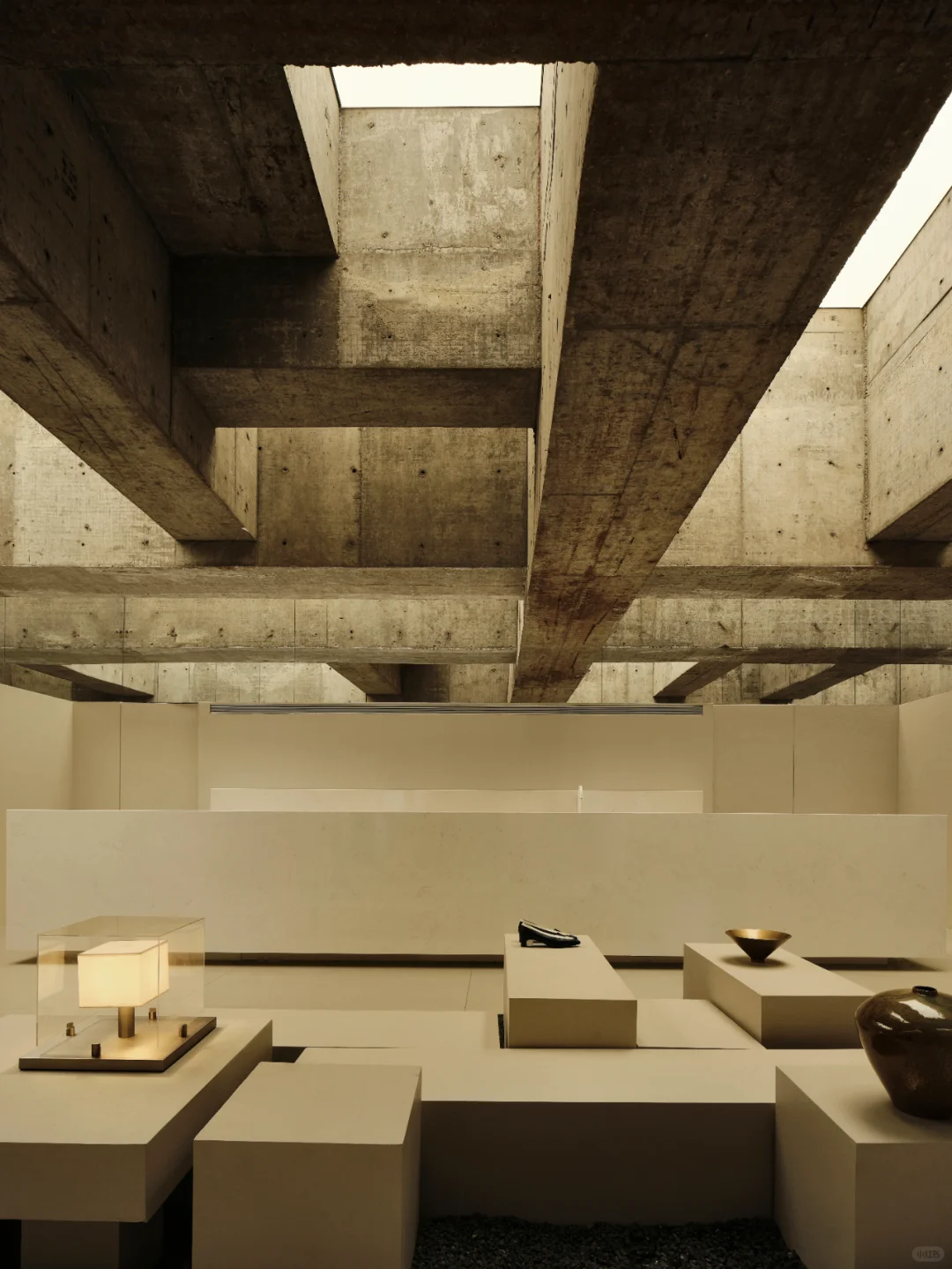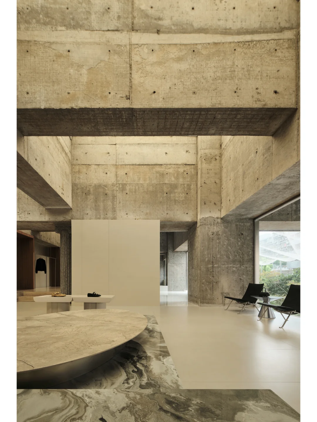 二层设计保留原始裸露的混凝土梁顶,通过石材、木作、金属等材质构成与堆叠,混揉了空间柔润且旷野的质地,宛如建筑体内自然生长的一部分,超越比例的物理界限,延伸空间多重展陈功能,制造极具视觉张力的对冲。