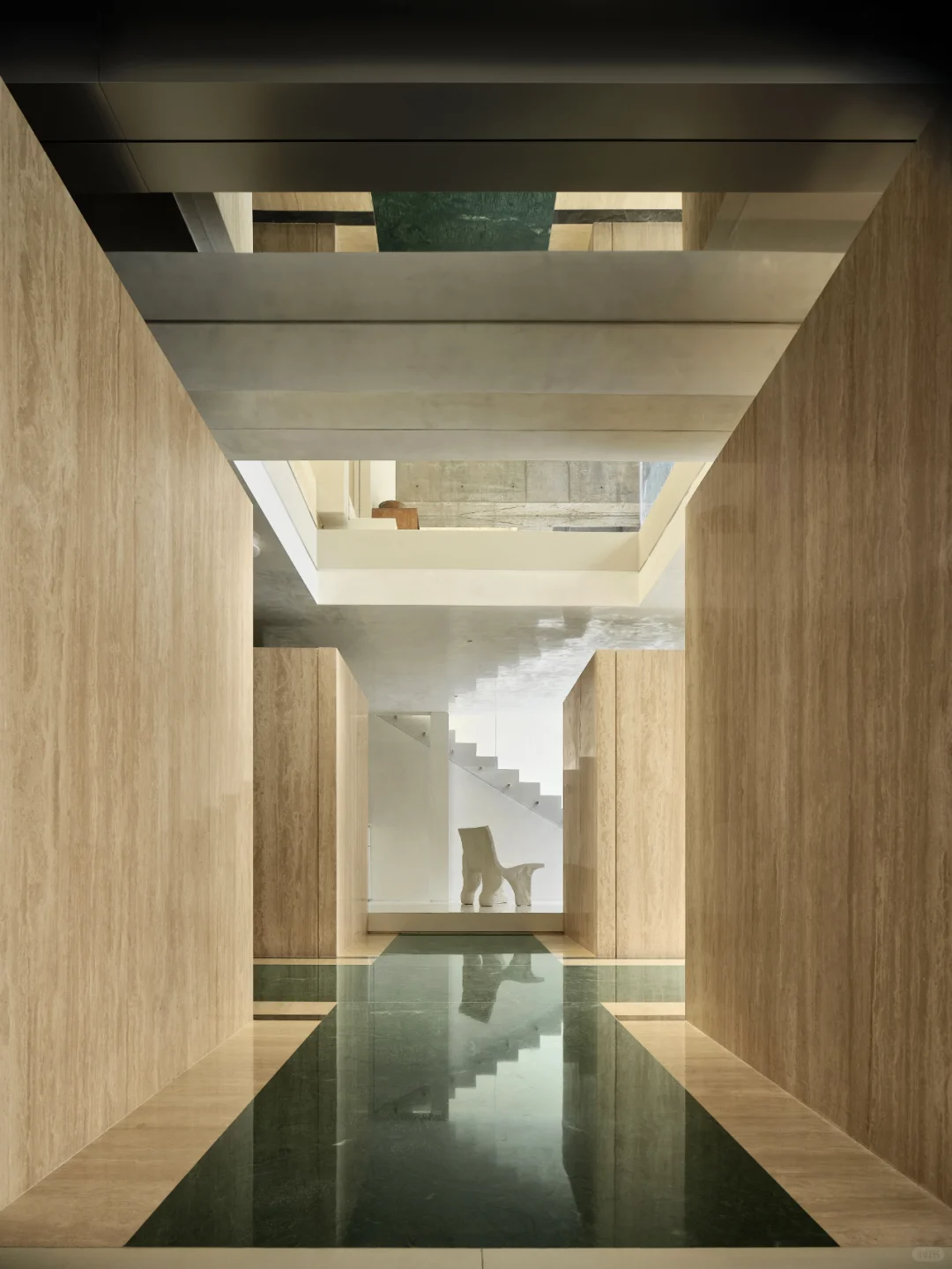 采用温润木作包裹纯粹的肌理,黑色大理石秩序穿透,不失个性神秘。一层入门挑空,厚重的内建筑结构与高挑的立面纵深形成视觉张力,释放体量的拉伸。入口长廊分别向左右两侧穿梭,牵引访客随动线游观入里。