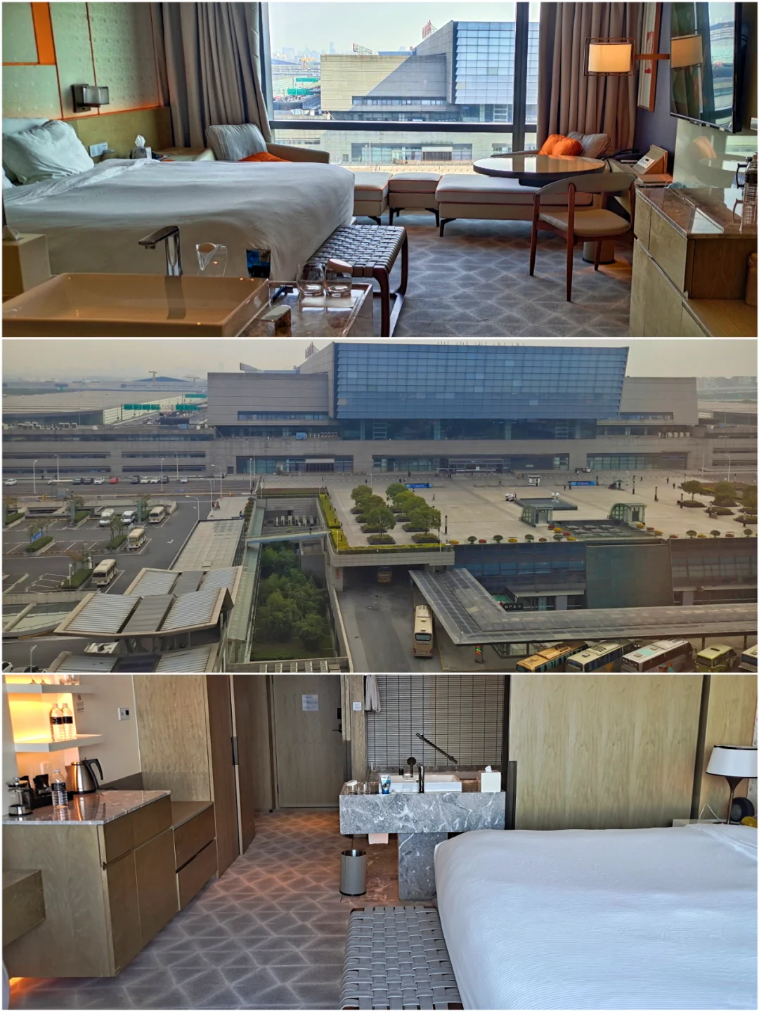大床房,标称面积41平米, 客房虽然不是很大,但布置合理。卫浴区是采用半开放的形式连接客房,通过木移门将客房与洗漱区域隔开,现在有些万豪酒店、万枫酒店也是这种设计。客房靠窗是一排沙发,很适合窗边打个盹,窗外就是虹桥火车站。(P10~P11)。