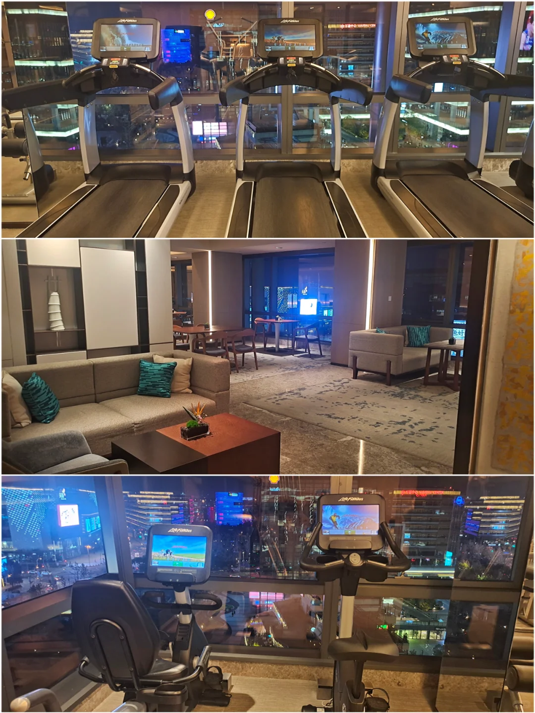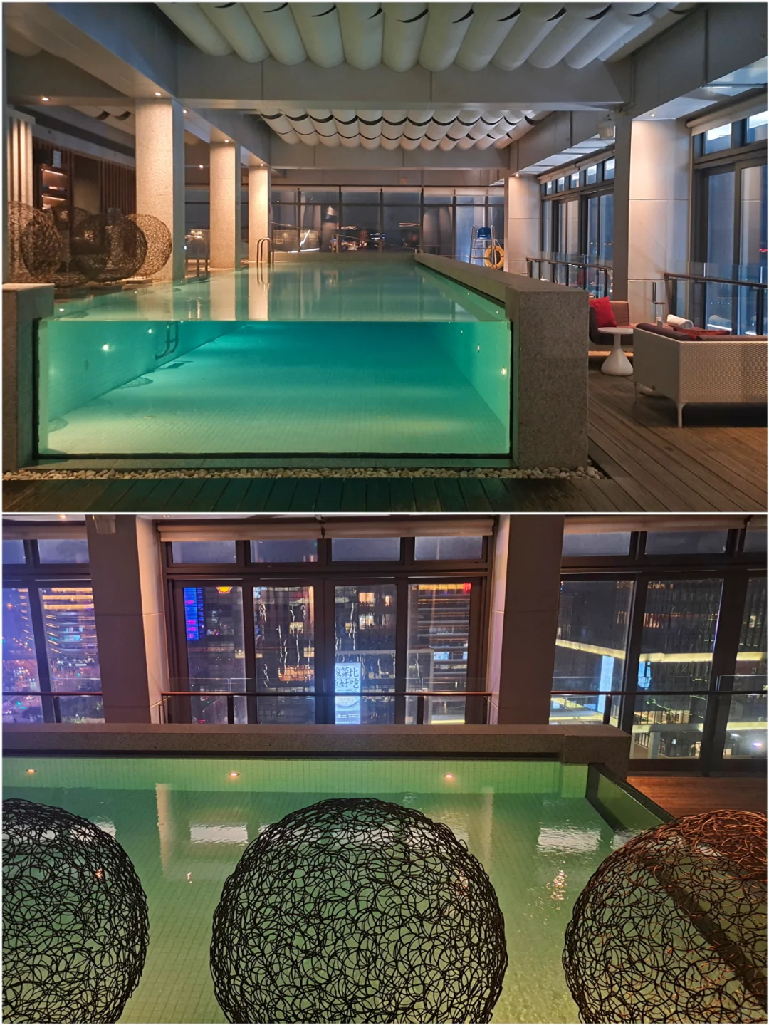 健身房和游泳池都在11楼,游泳池要走上去一层,其实是在12层,透明鱼缸池的设计,也是一个网红泳池。边上就是12次方酒吧。(P16~P18)。