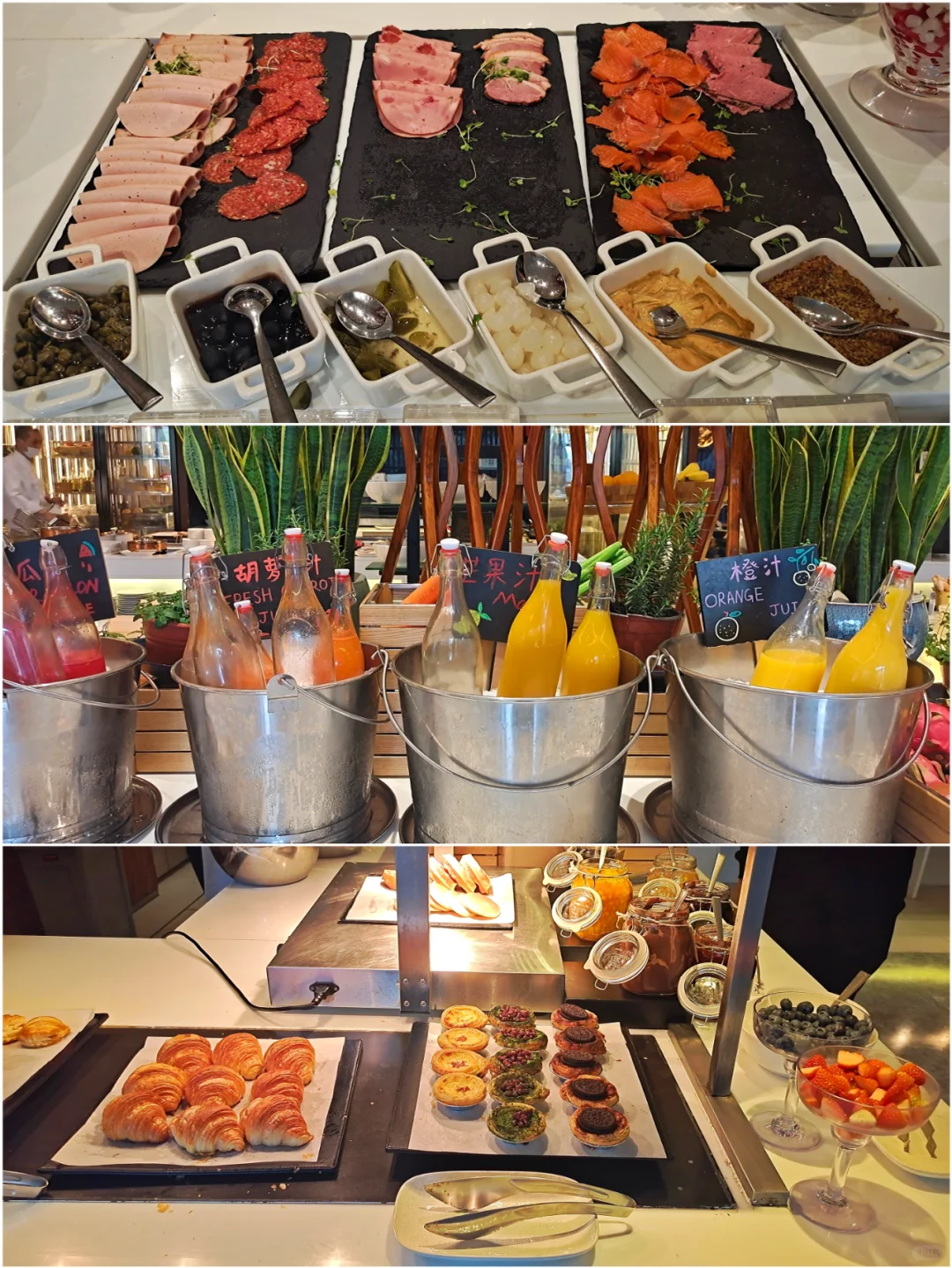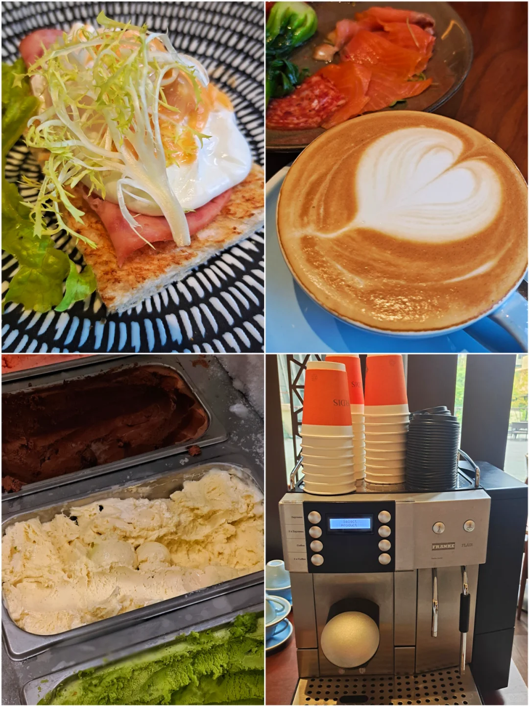 早餐在G层,相当丰盛,有鲜榨果汁、烟熏三文鱼、冰淇淋,还有班尼迪克蛋,虽然做的不太好看。水果有草莓和蓝莓。他家的咖啡不错,拉花也漂亮。(P12~P14)。