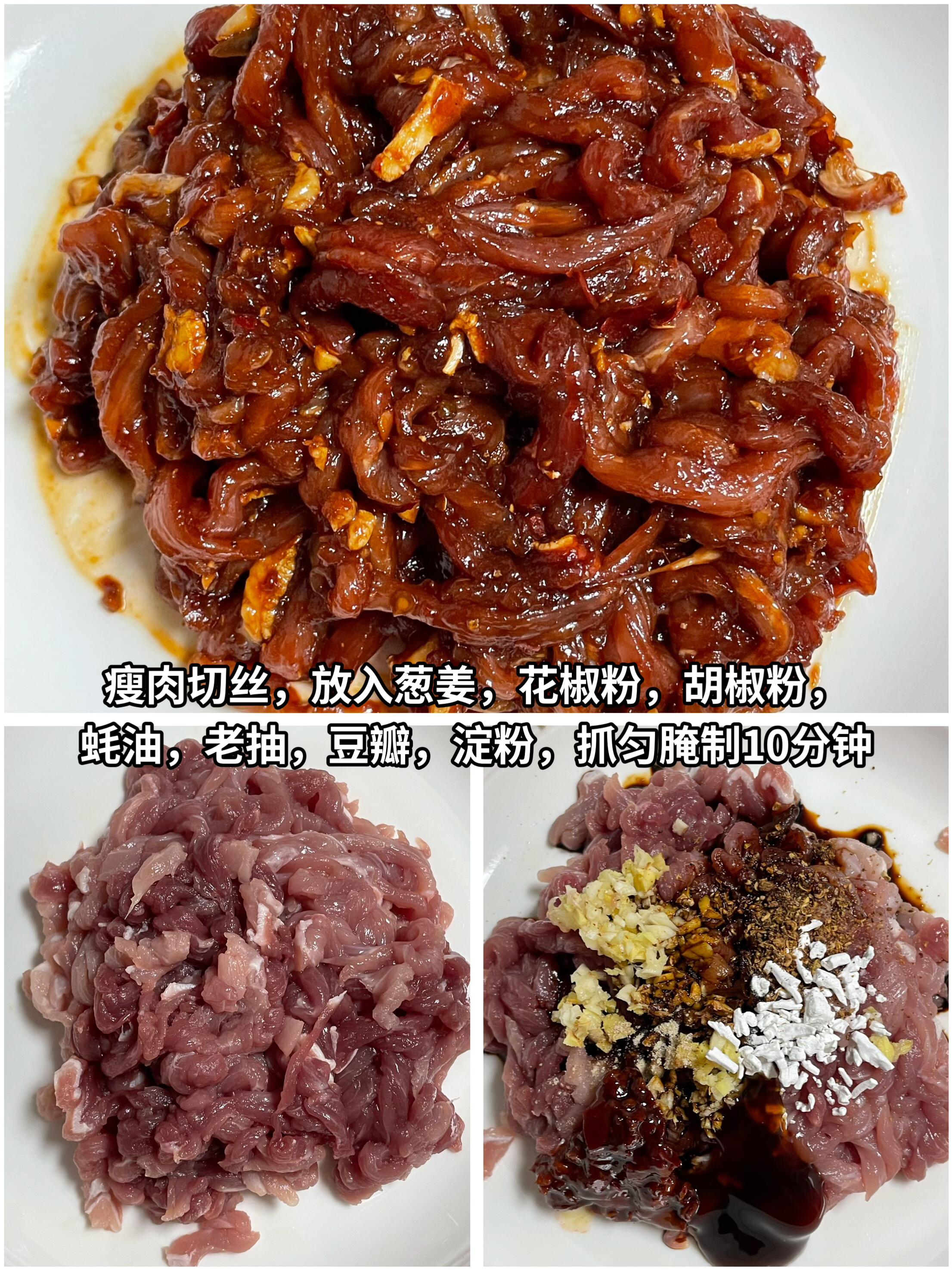 青椒豆干肉丝。这个做法做出来,家里就得多煲米饭,下两碗米饭不是问题。喜欢的宝子可以试一试 1、青椒切丝,豆干切丝,瘦肉切丝,瘦肉放入葱姜、花椒粉、胡椒粉。蚝油、老抽、豆瓣、淀粉抓匀,腌制10分钟备用。 2、起锅烧油,油热将瘦肉滑熟捞出,锅里留底油炒香。准备好的小米辣、豆瓣酱和姜蒜。放入切好的豆干丝,来一点清水,加一勺生抽焖煮2分钟,再放入切好的青椒丝,加入盐、味精炒熟,倒倒入瘦肉,加入葱段翻匀即可。
