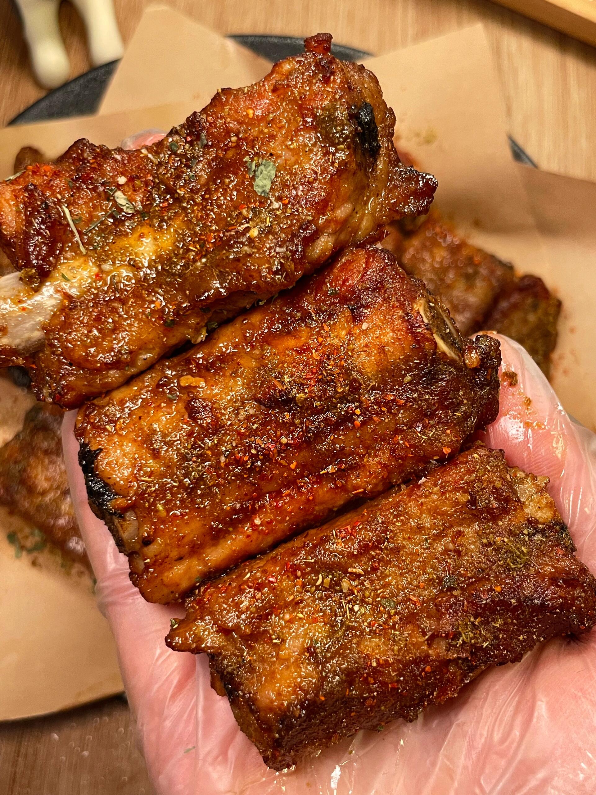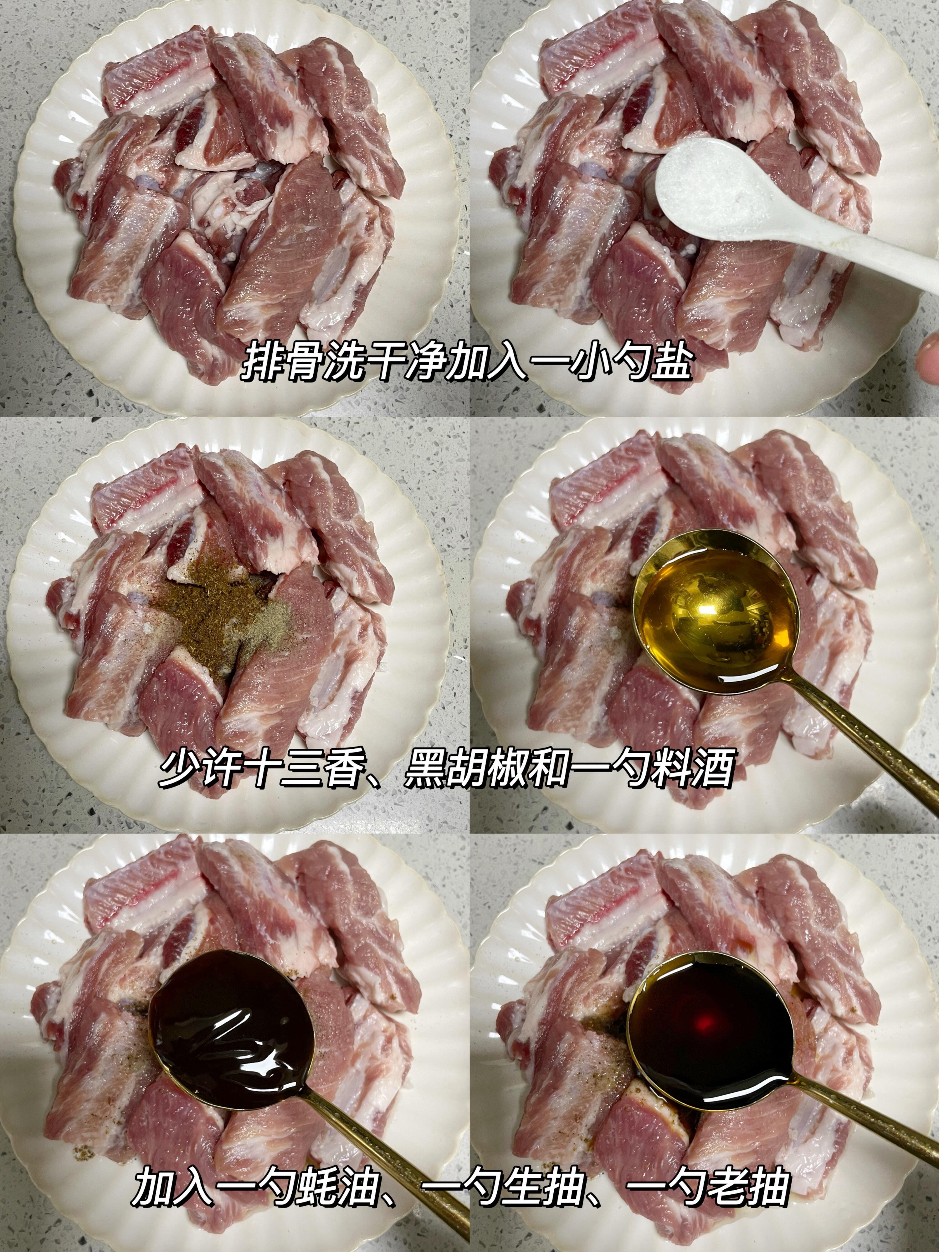 家人们谁能拒绝这盘蒜香排骨,可以出摊了 糖醋排骨吃腻了就试试这个蒜香排骨,每次朋友来家里点名要吃的,谁吃谁知道到底有多好吃,家人们真的可以试试! 食材:排骨、鸡蛋、蒜泥、淀粉 做法: 1、排骨洗净沥干水分,放入一小勺盐,少许十三香黑胡椒和一勺料酒,一勺蚝油,一勺生抽,一勺老抽加入蒜泥和鸡蛋液,抓拌均匀腌制一小时以上入味 2、腌制好的排骨放入空气炸锅180度烤30分钟左右即可,中途记得翻面哦